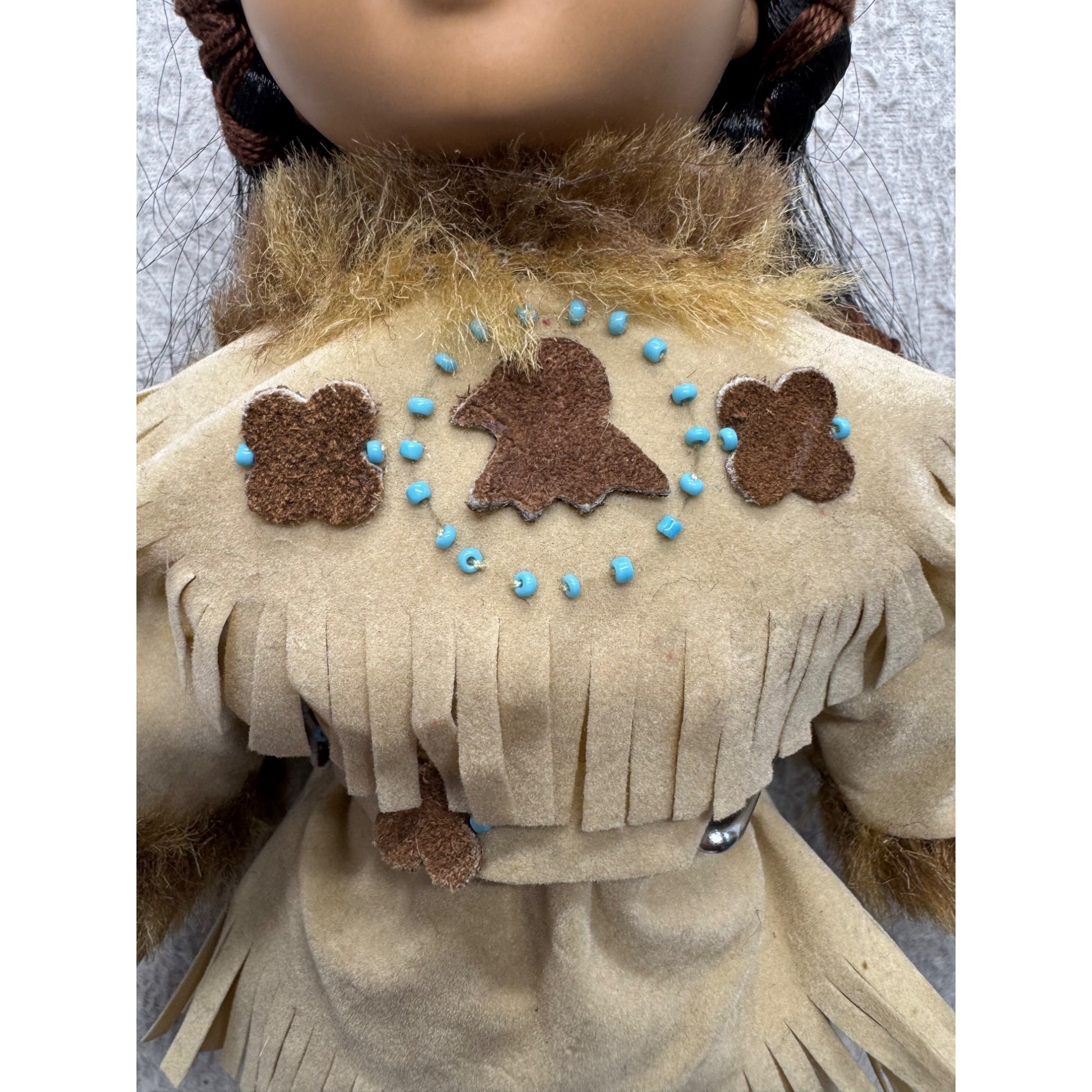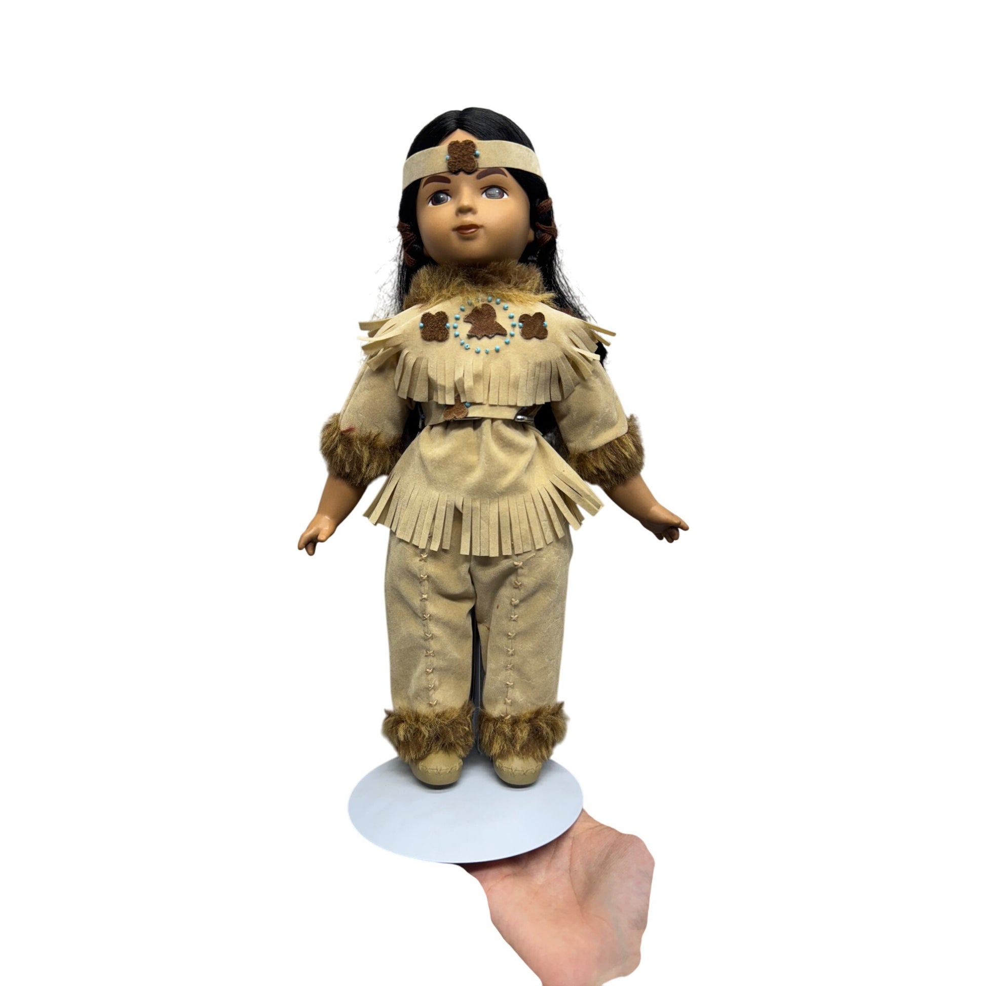 Native American Porcelain Doll Faux Suede Fringe Faux Fur Trim 14" Tall #419B