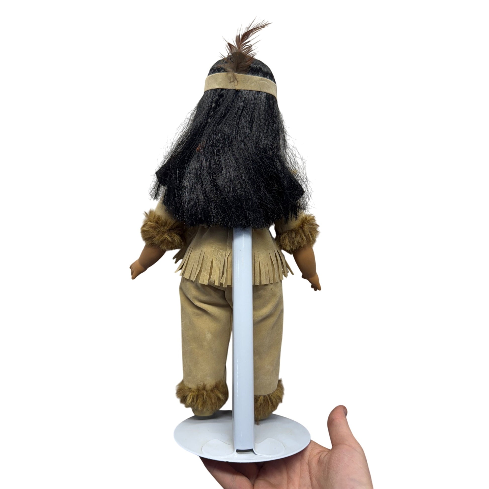 Adorned in a beautifully detailed faux suede outfit, this doll tells a story of tradition and artistry. From her braided hair to her intricate beadwork, she embodies a timeless charm. Standing 14 inches tall, she is a captivating addition to any collection, symbolizing heritage and beauty.