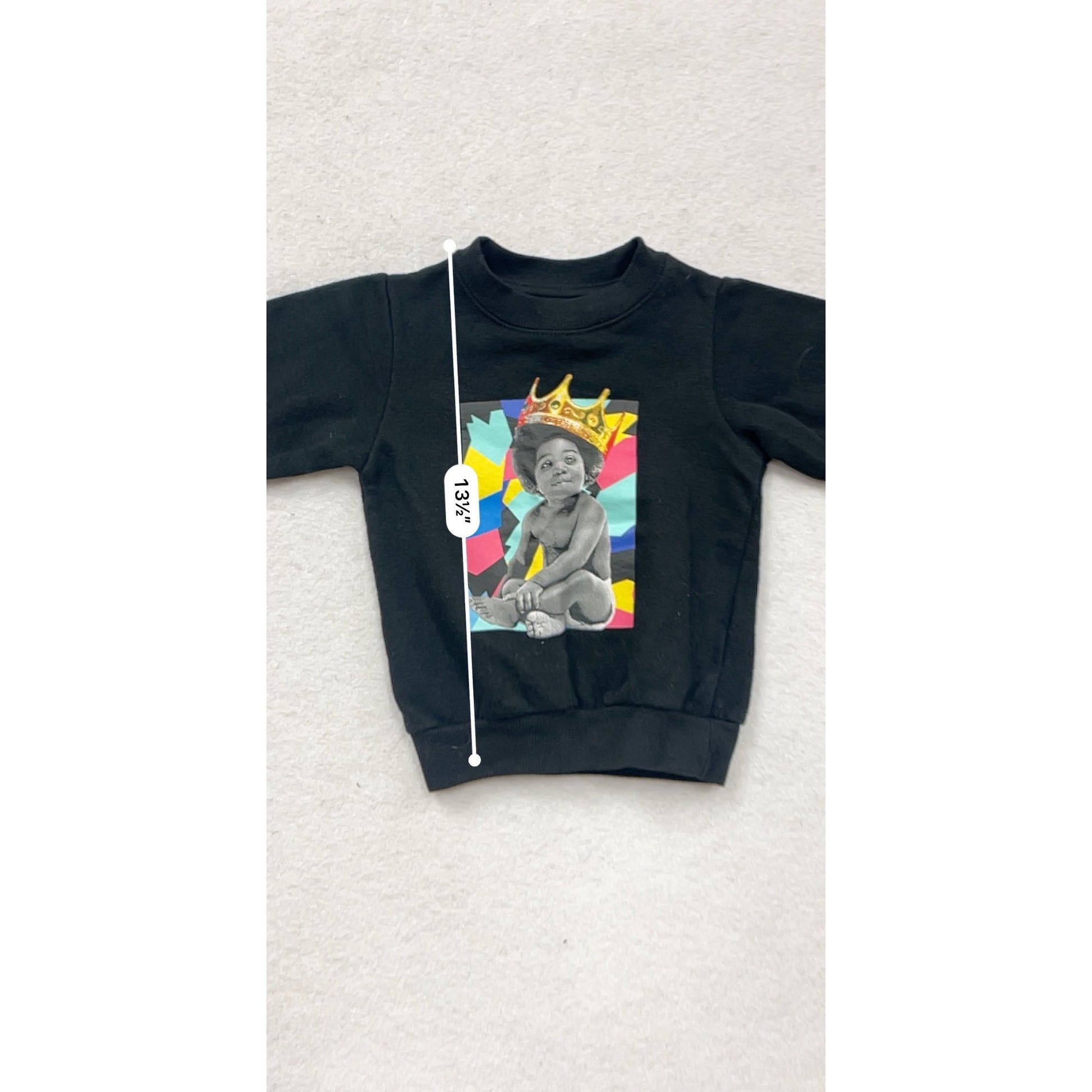 This toddler sweatshirt features a vibrant graphic of The Notorious B.I.G. with a playful crown motif. Crafted from a cotton-polyester blend, it offers durability and comfort for everyday wear.