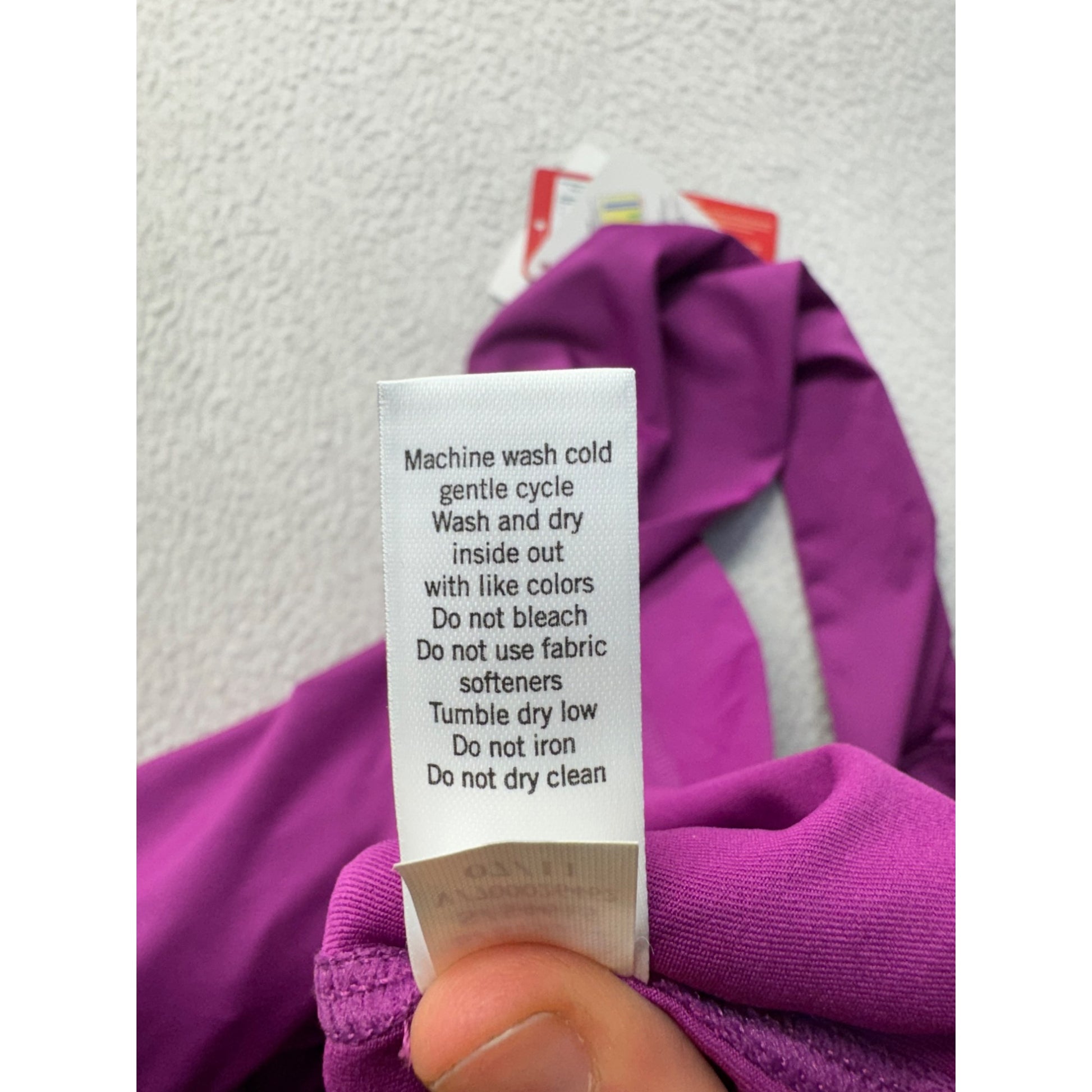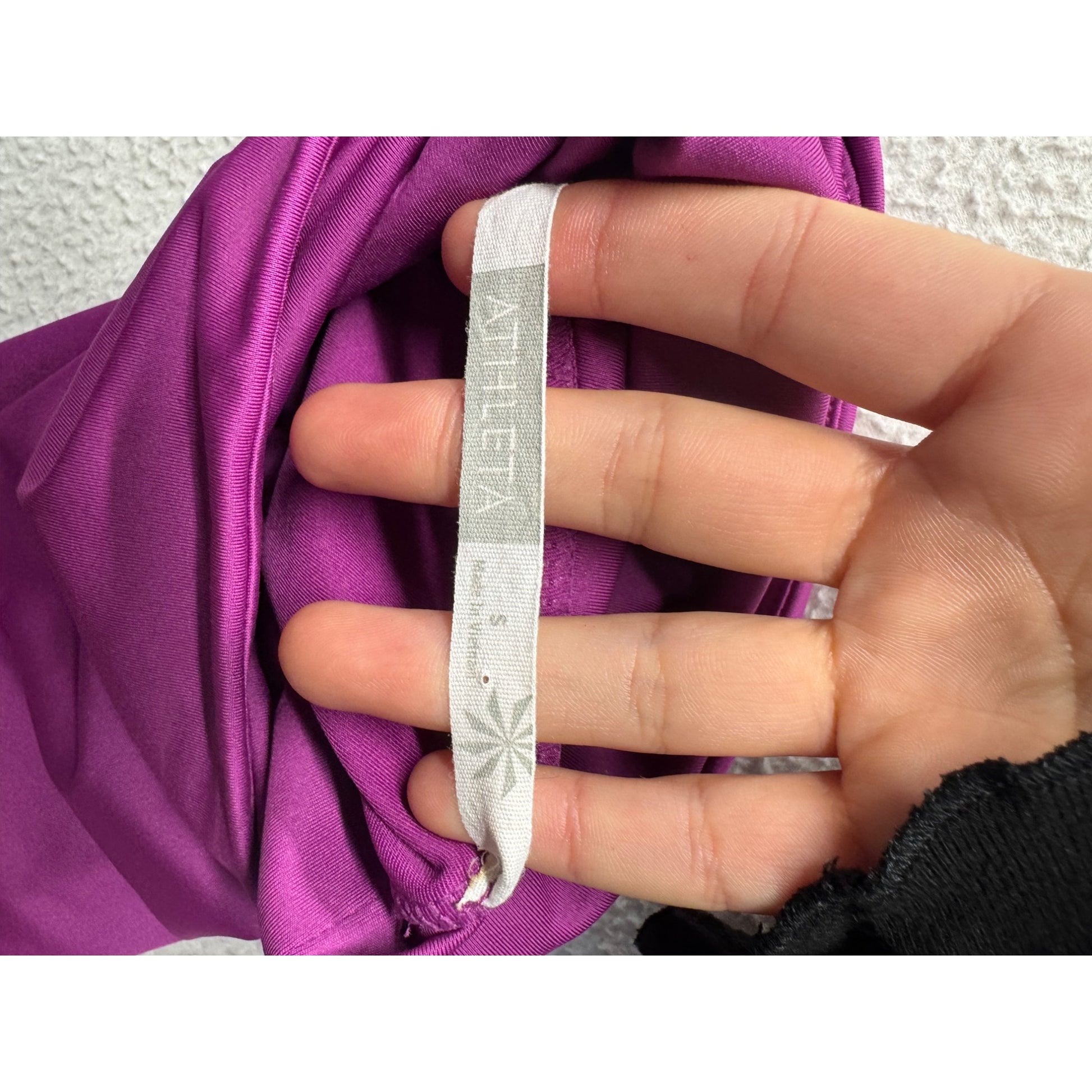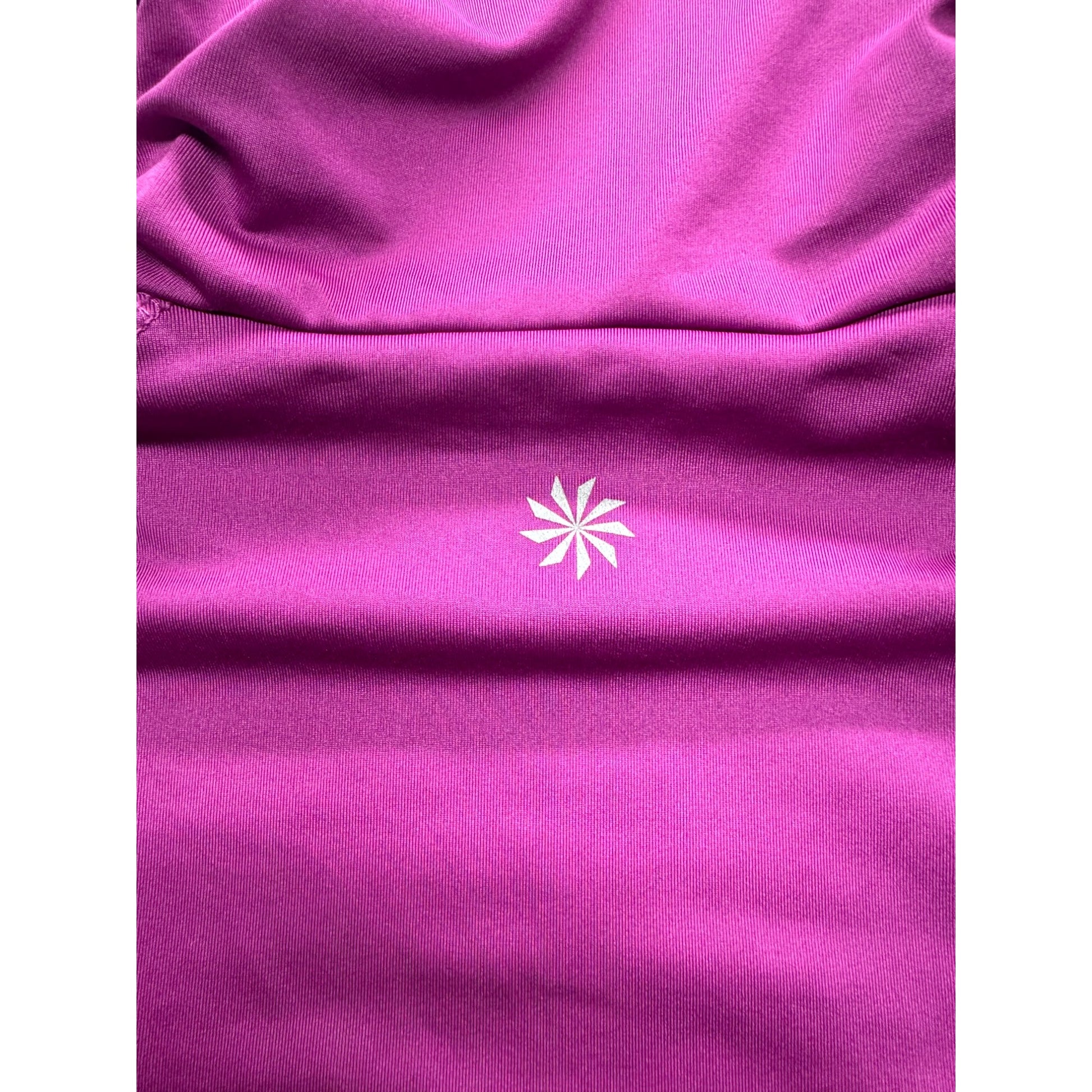 This Athleta top is designed with a sleek mock neck and stylish ruched shoulders, providing a modern look and comfortable wear. The vibrant purple color enhances its visual appeal, while the quality construction ensures durability and functionality for active pursuits or casual outings.