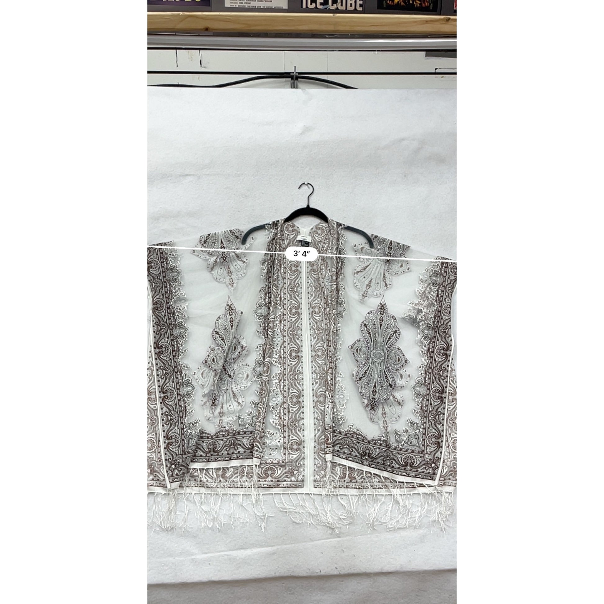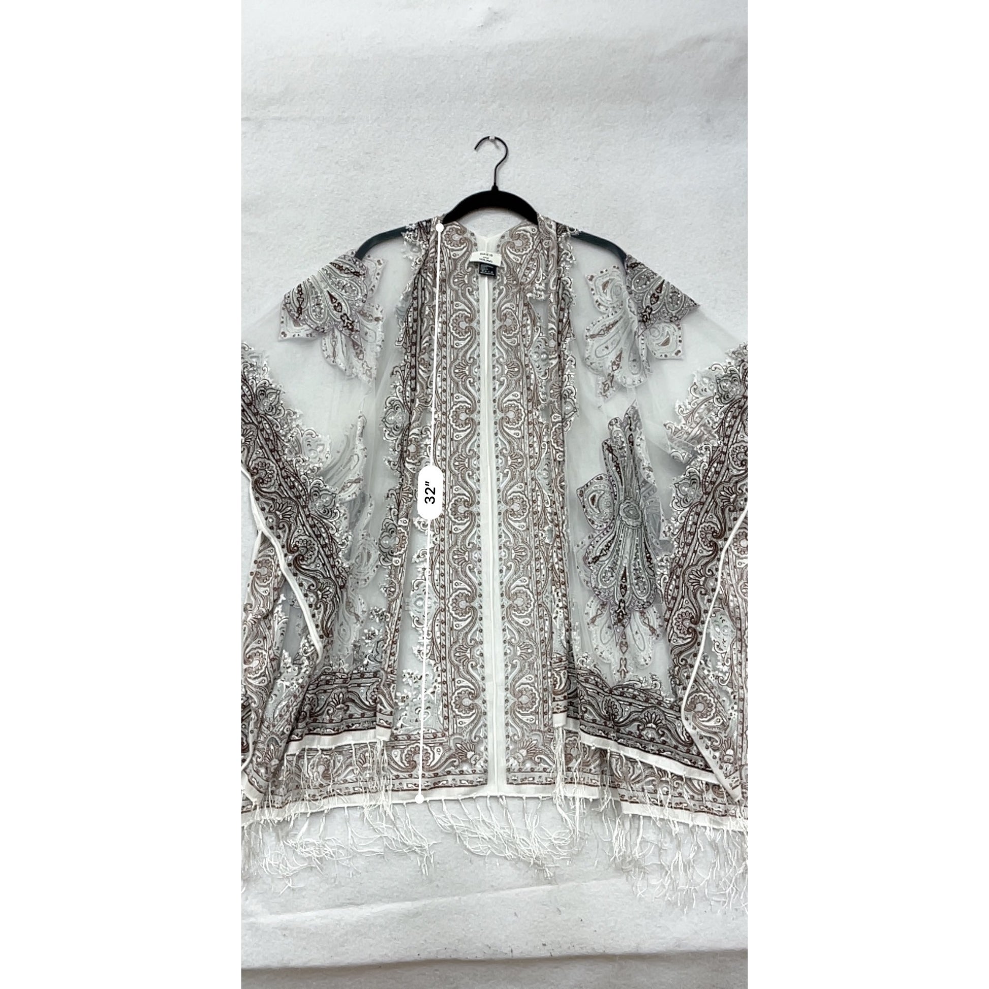 This lightweight kimono cardigan features a sheer paisley design with fringe details. Ideal for layering, it offers an elegant and versatile aesthetic.