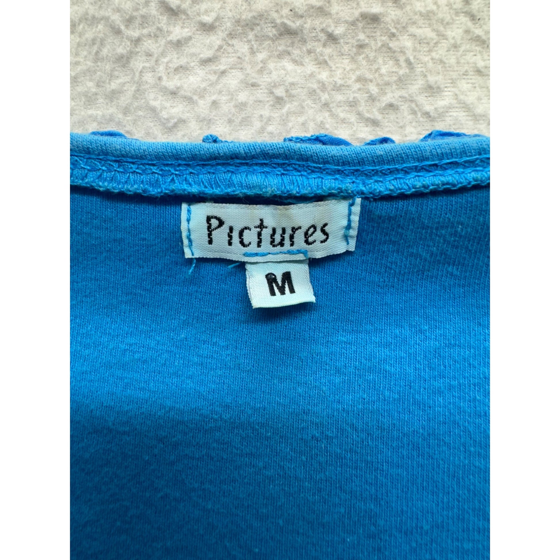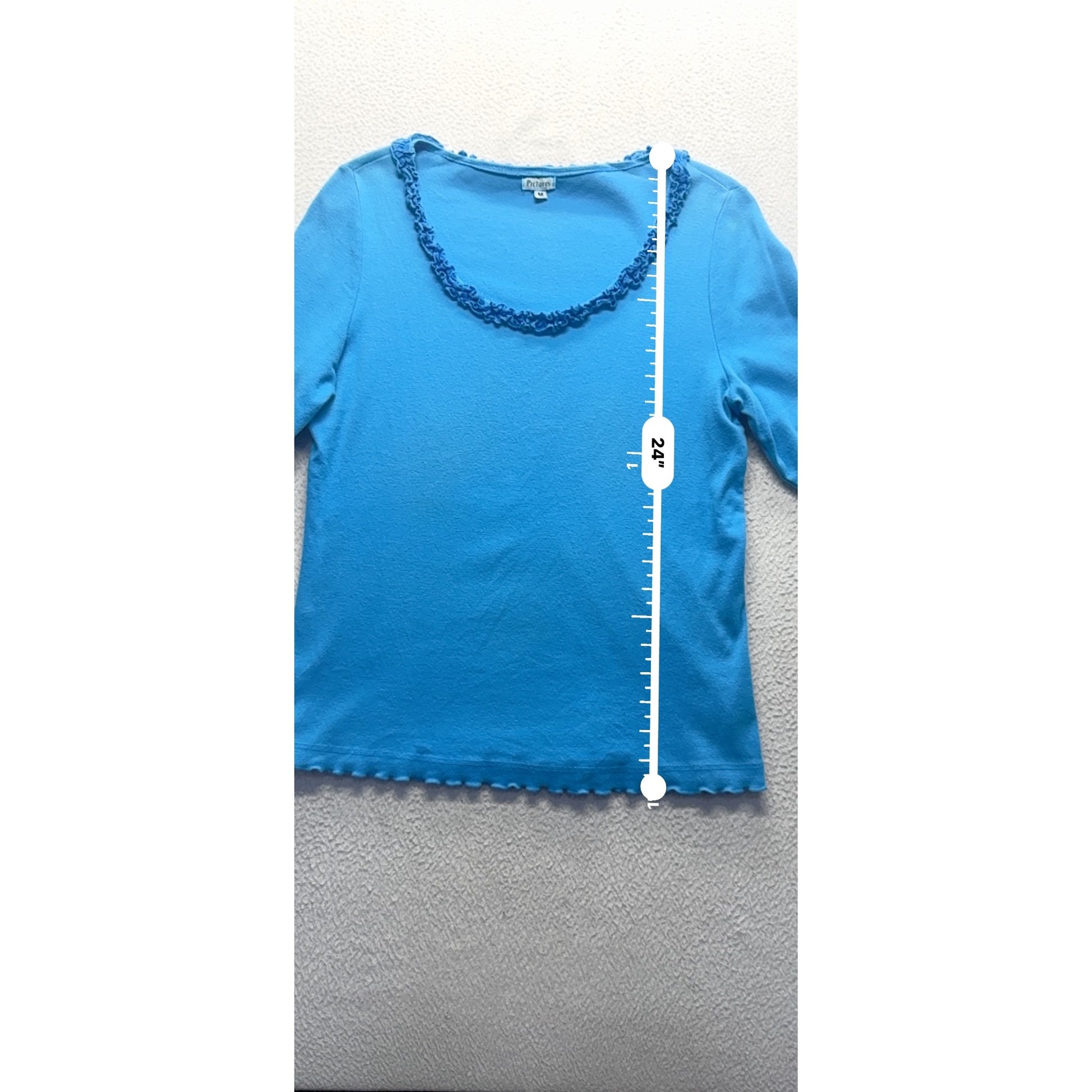 Pictures Blue Ruffle Trim Neckline 3/4 Sleeve Top Shirt M 82B