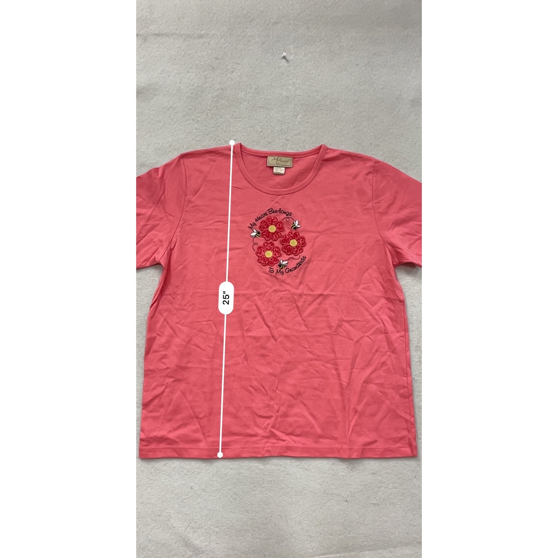 This pink cotton t-shirt features a heartfelt embroidered design, "My Heart Belongs To My Grandkids." Lightweight and breathable, it's ideal for casual wear.
