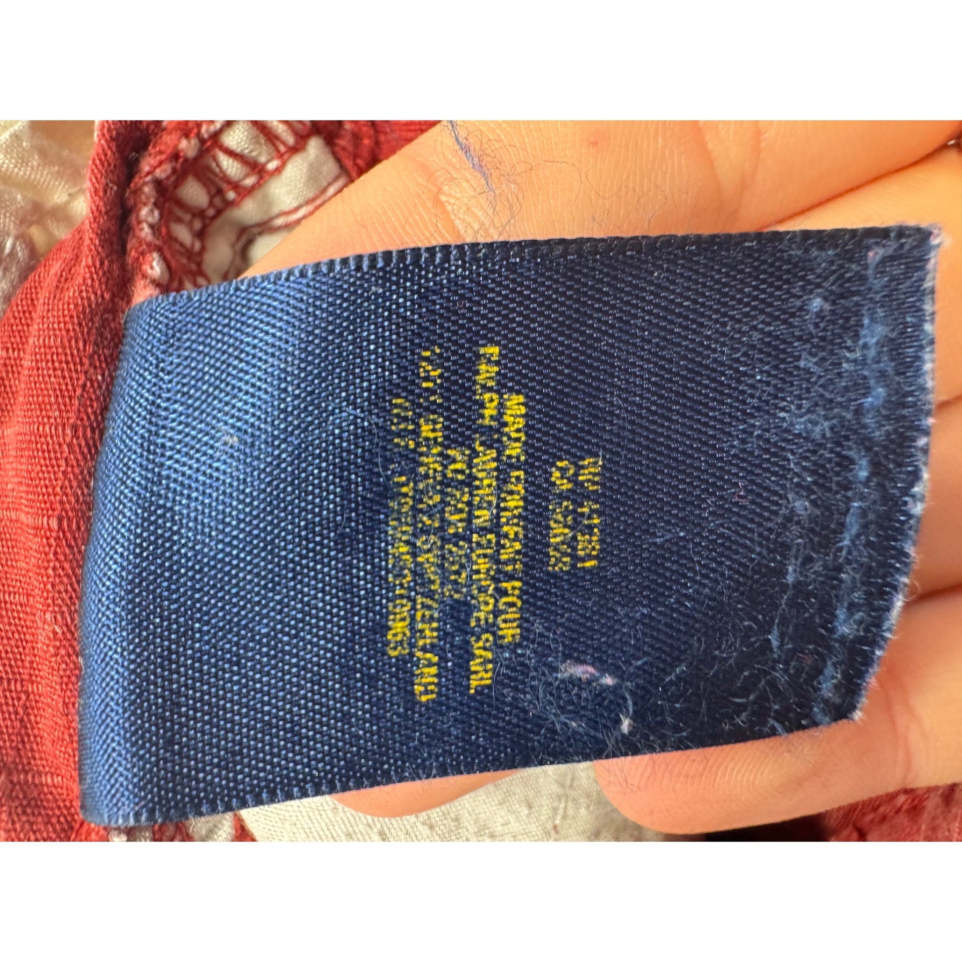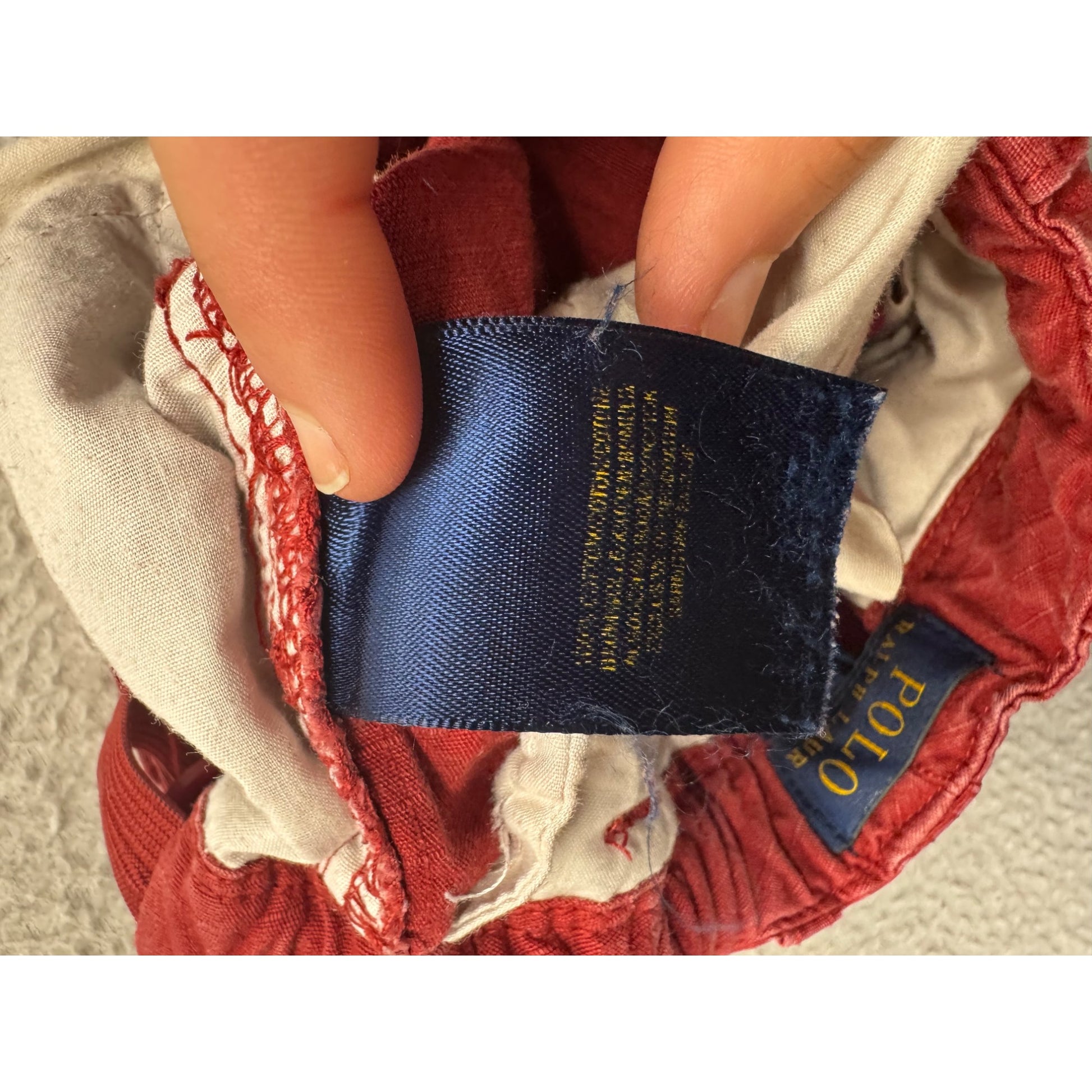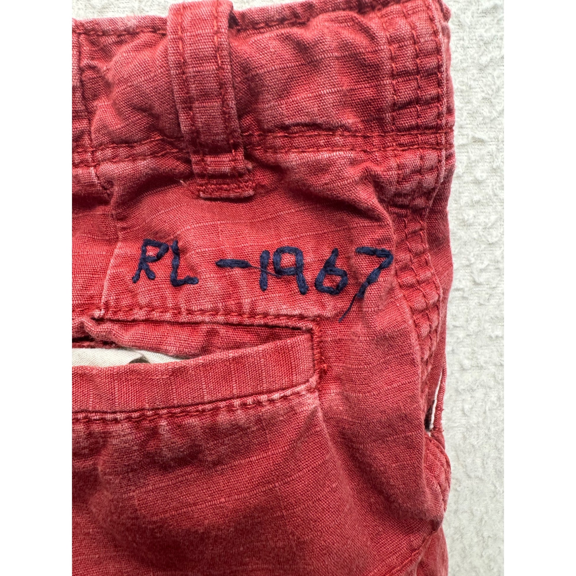 Slight fading on fabric, embroidered "RL-1967" detail on the back. Waist = 9 inches, length = 9.5 inches.