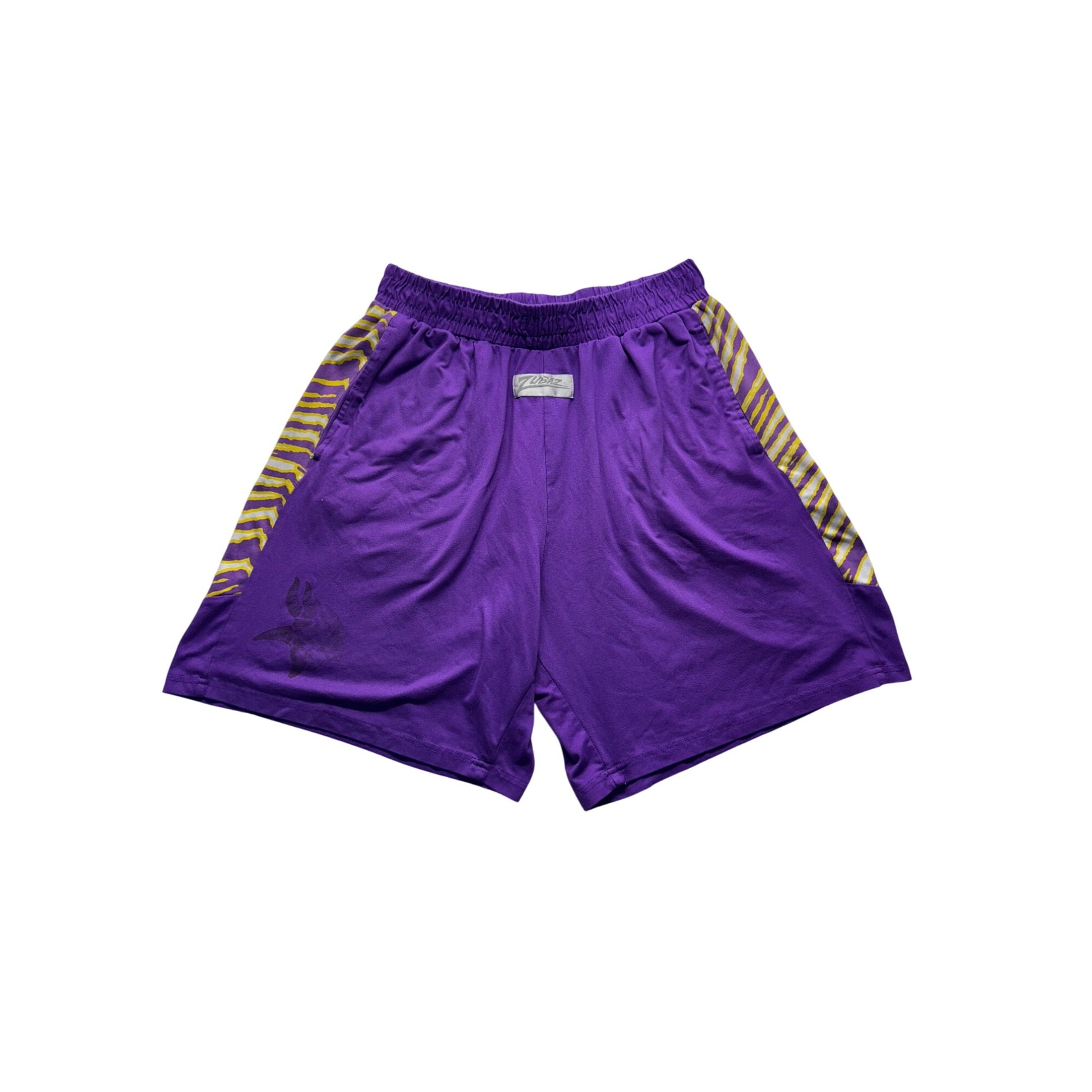 Vintage athletic shorts featuring a vibrant purple base with distinctive yellow and purple zebra-striped side panels, designed for comfortable movement and athletic performance.