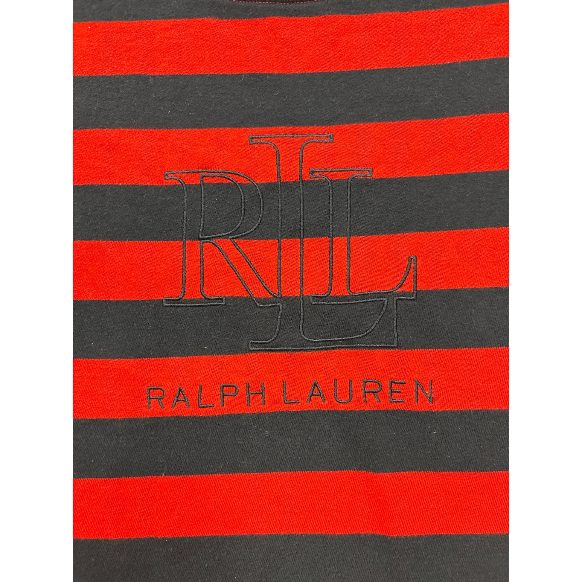 This Ralph Lauren long sleeve shirt features a bold red and navy striped pattern with a stylish RL logo. Comfortable cotton blend fabric ensures durability and softness.
