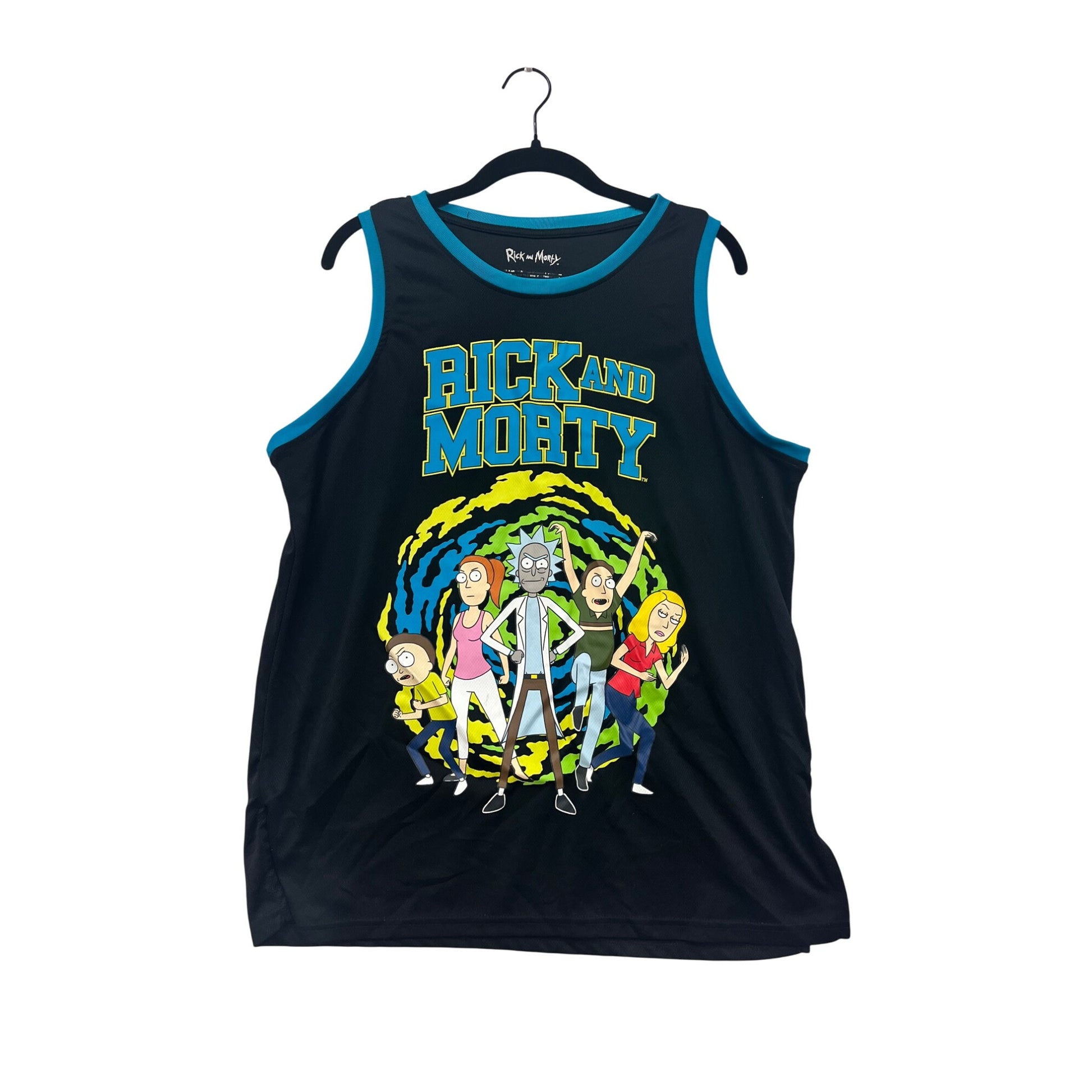 Rick & Morty Mens Medium Black Tank Top With Colorful Characters & C-137 Design Blue Trim #6762