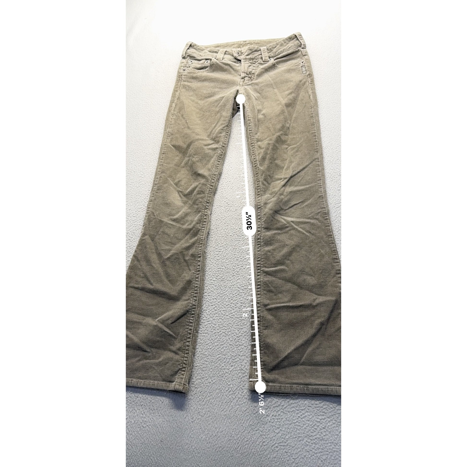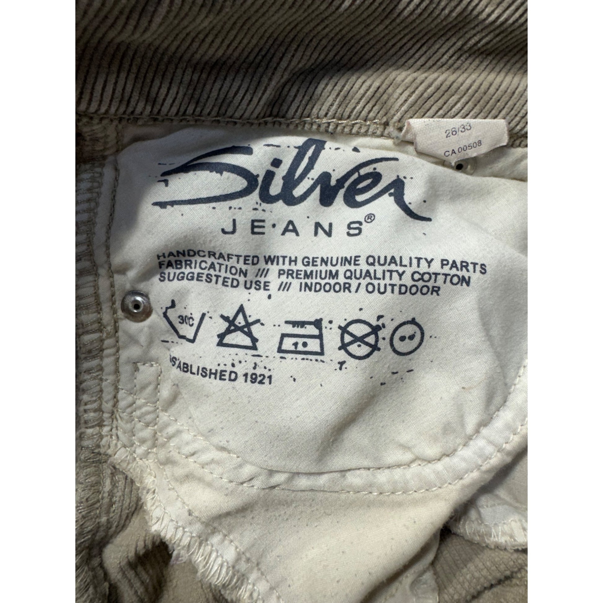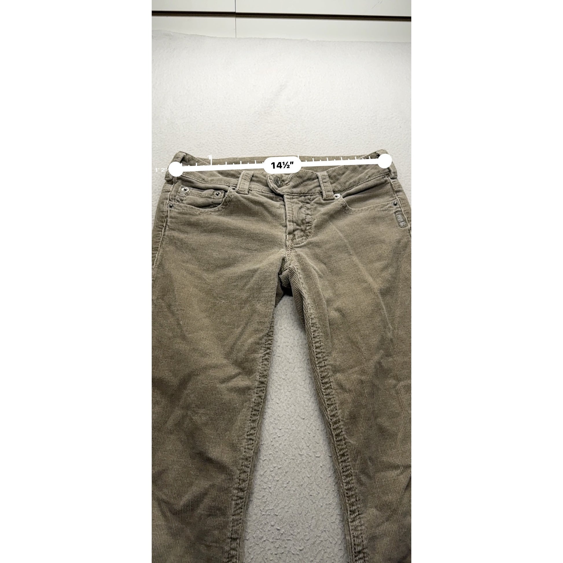 These Silver Jeans Co. corduroy pants offer a blend of comfort and style. Featuring a flare cut, they are versatile for various settings, providing a sophisticated look with their beige hue.