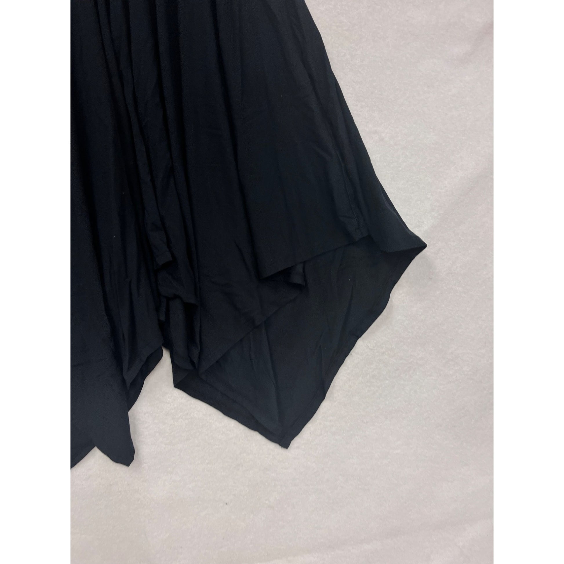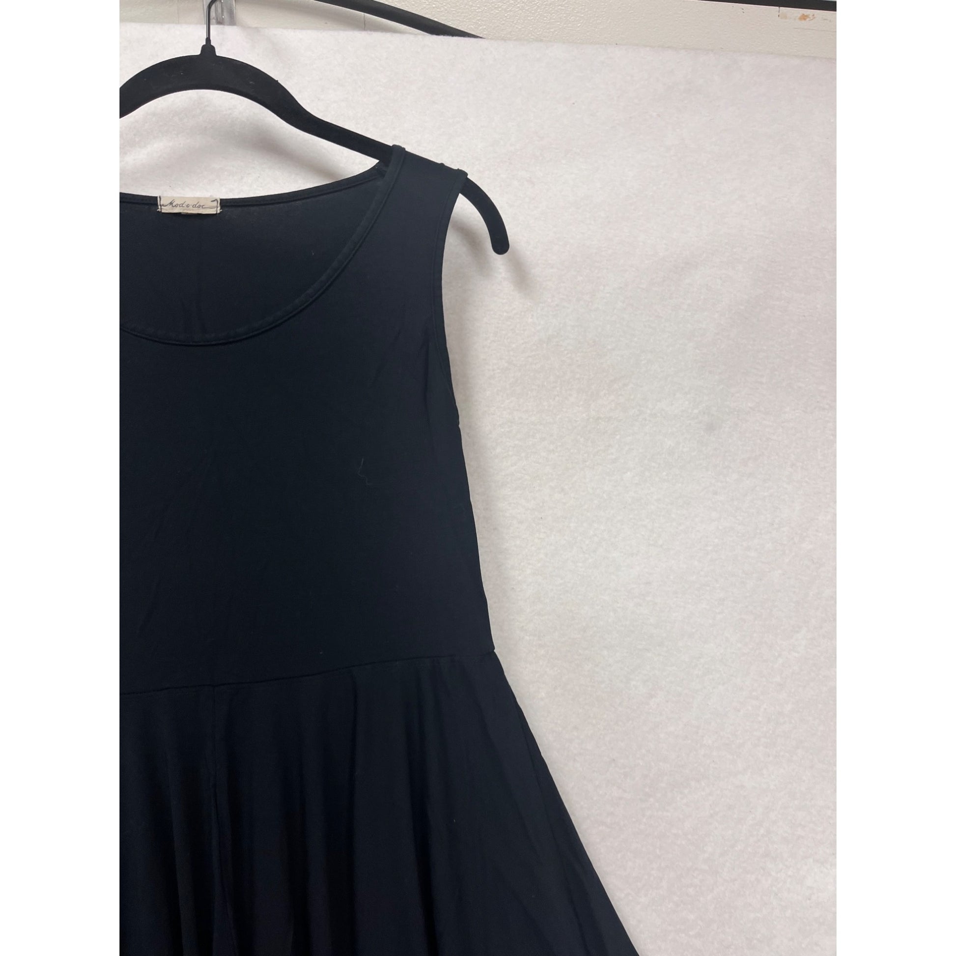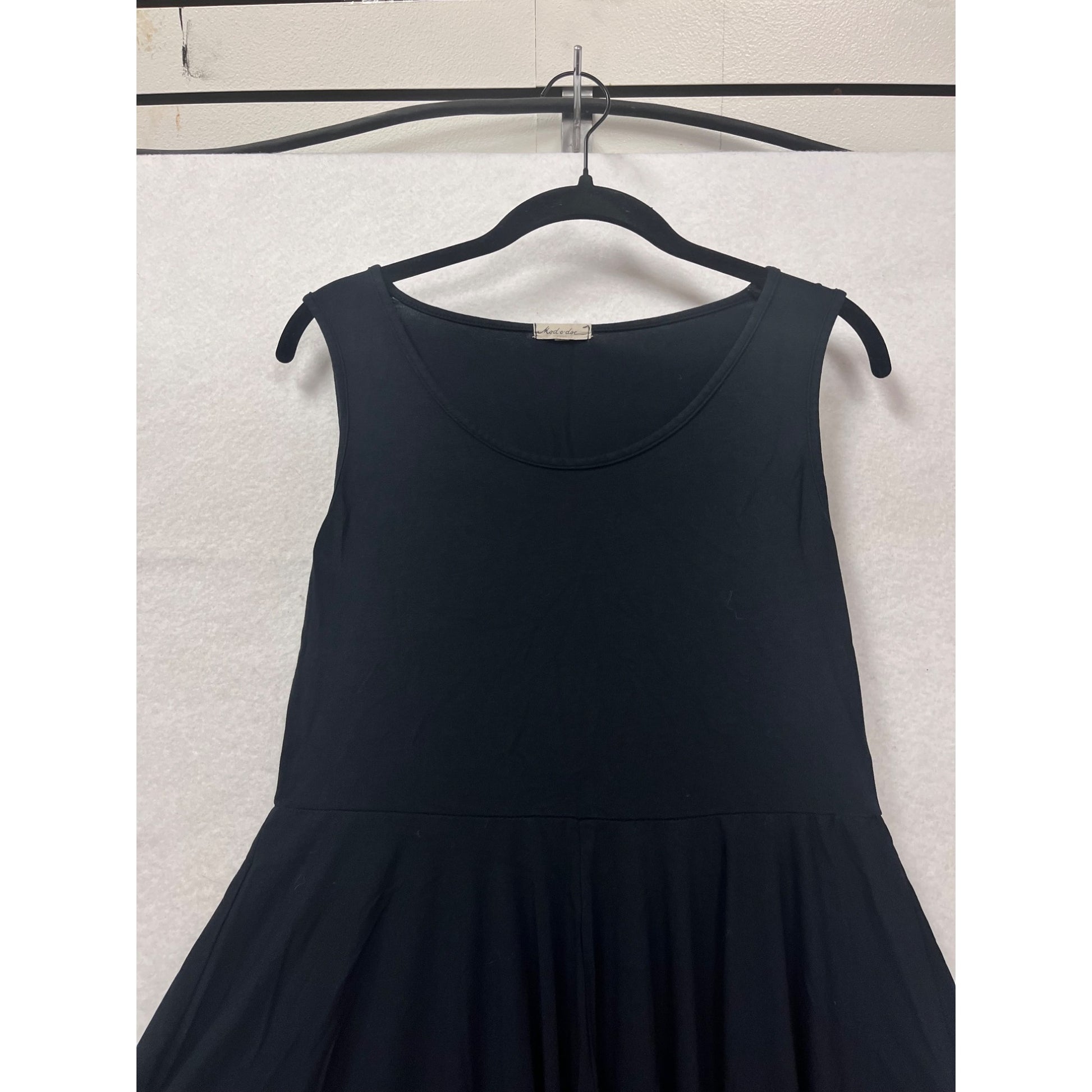 This sleeveless black dress features an asymmetric hem and flowy silhouette, offering comfort and style. Made from a soft cotton blend for a smooth feel.