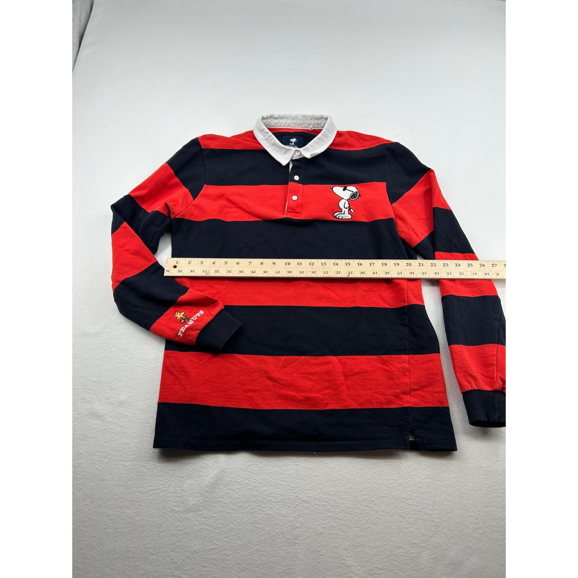 This Snoopy rugby-style polo shirt offers a casual vibe with bold red and navy stripes. The long sleeves and embroidered details add character.