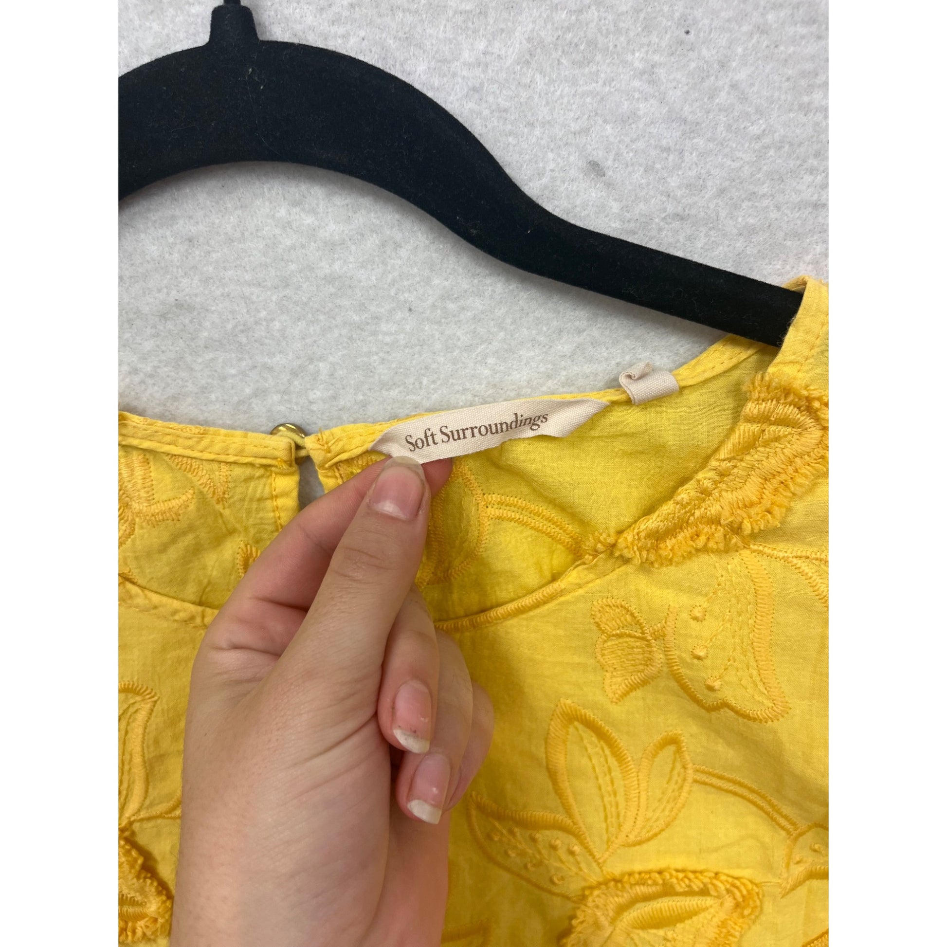 This sleeveless top from Soft Surroundings combines elegance and comfort with its delicate floral embroidery. Made from a cotton and polyester blend, it provides a soft and breathable experience for the wearer, suitable for various occasions. The vibrant yellow color adds a cheerful touch to any wardrobe.
