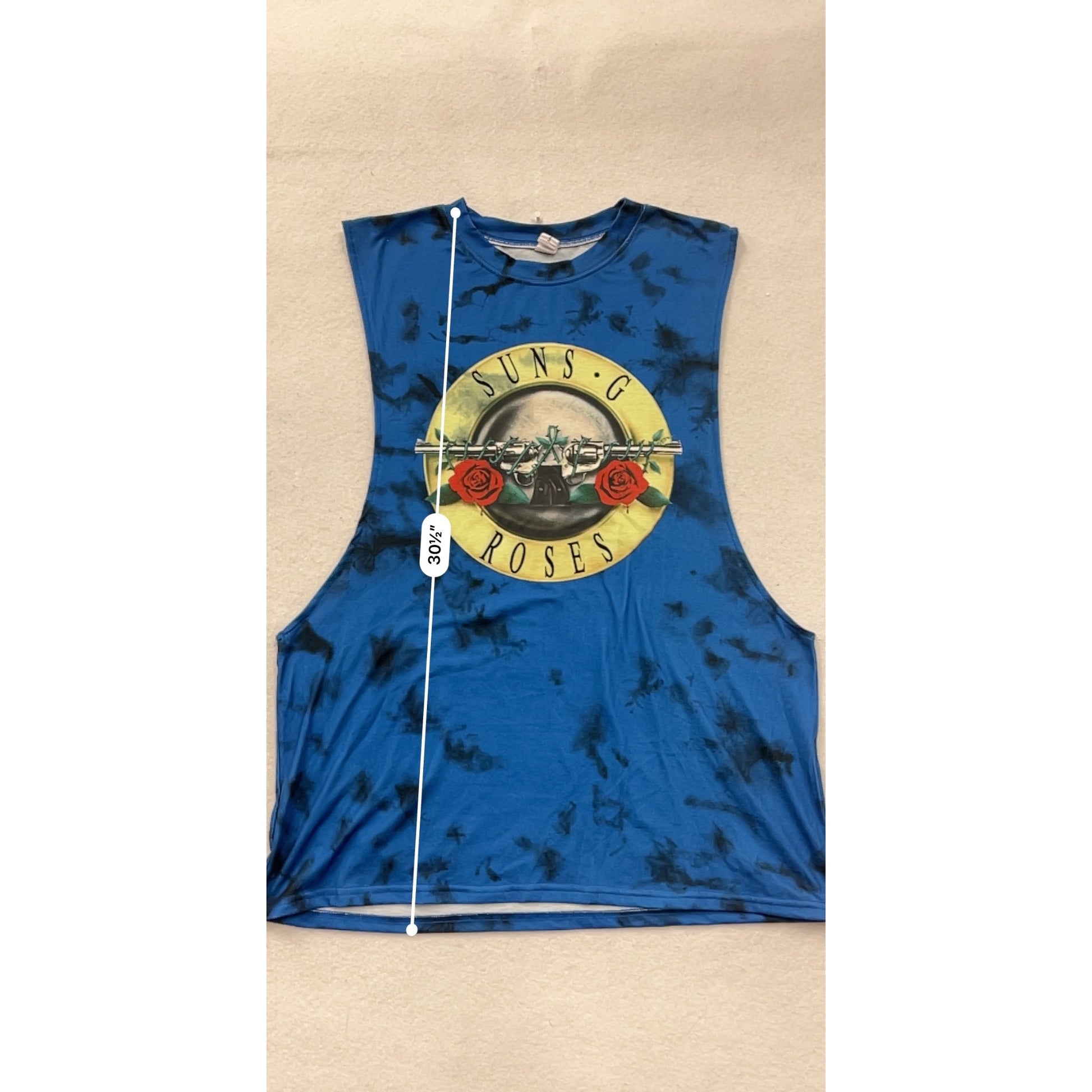 This blue tie-dye sleeveless tank top by Chicyea features a bold Guns N' Roses inspired graphic. Its relaxed fit and breathable design make it suitable for casual outings or music events. The soft material ensures comfort, while the vibrant print adds a touch of rock-inspired style to any wardrobe.