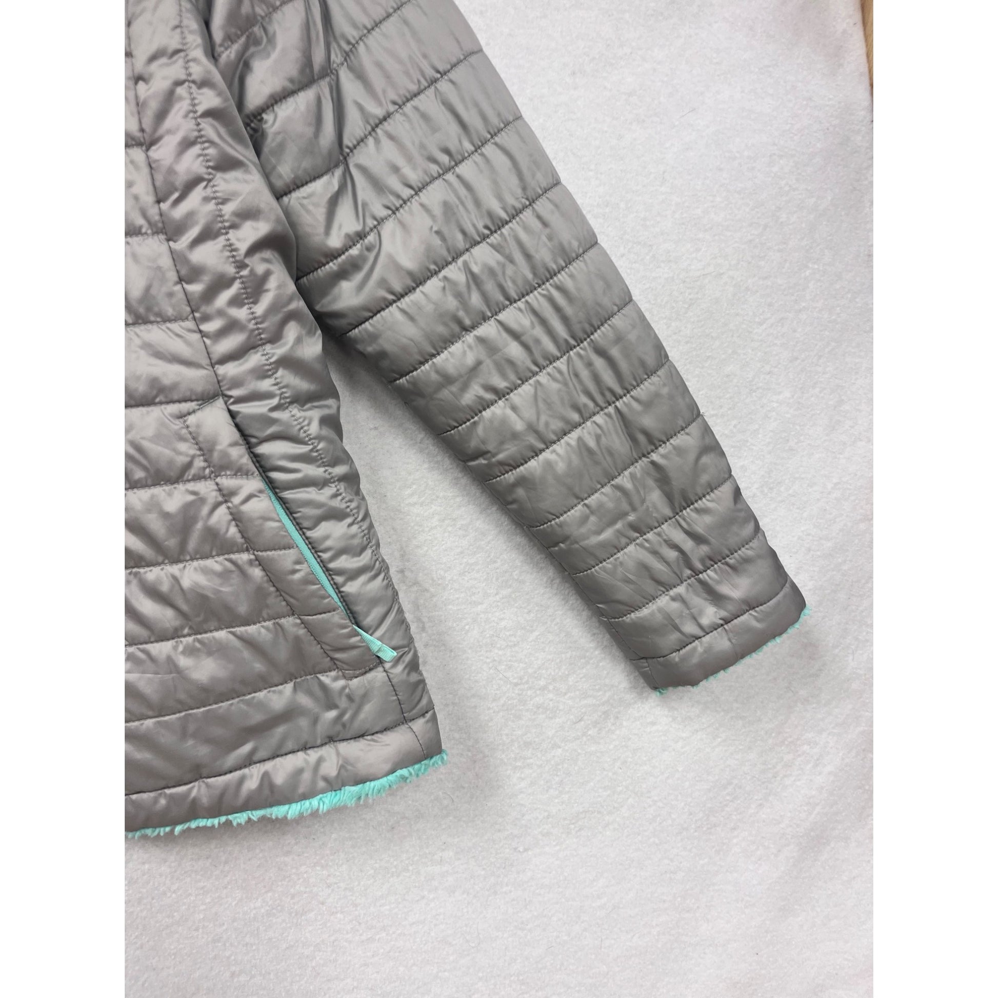 This reversible jacket offers versatile style and cozy comfort, featuring a quilted gray exterior and a plush teal interior for added warmth.