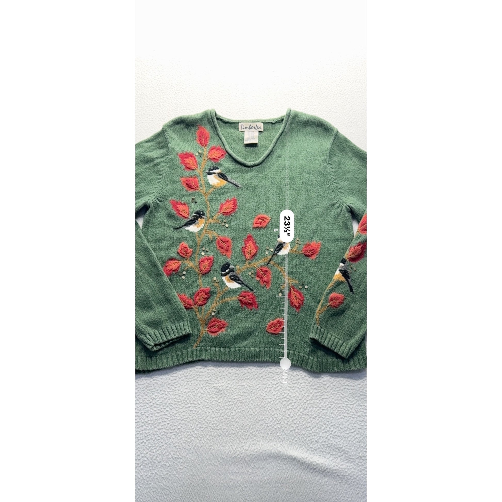 Timberlees Embroidered Botanical Bird Knit Sweater Green Ramie Cotton M #9589