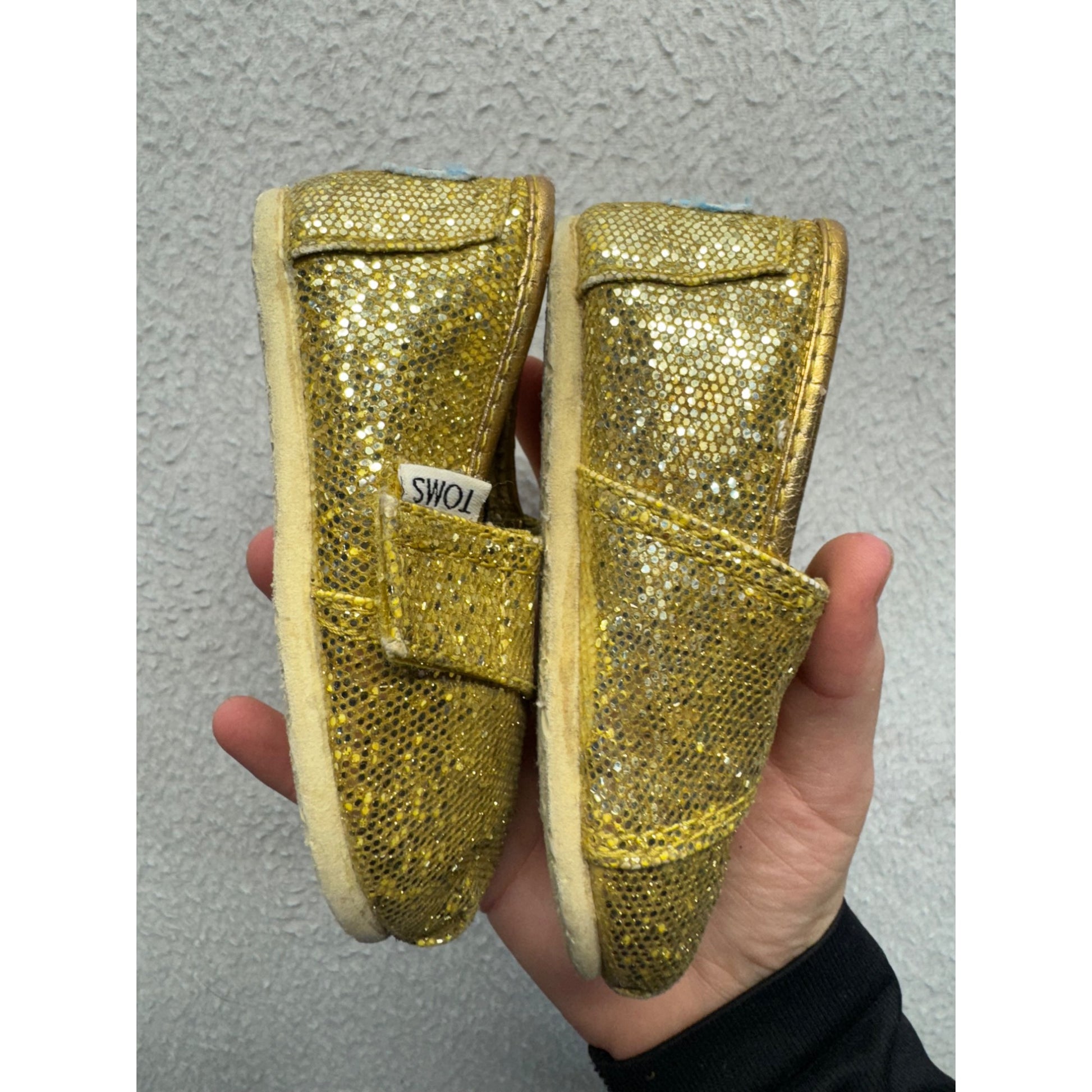These Toms toddler shoes feature a striking gold glitter design, offering style and comfort. Ideal for casual outings or special gatherings.