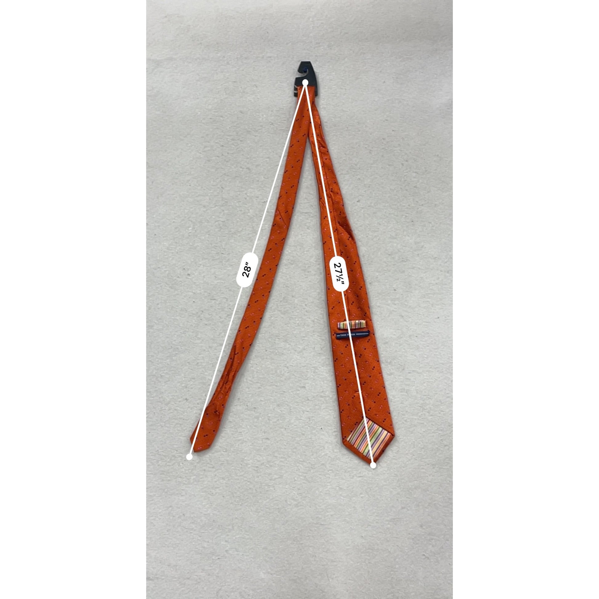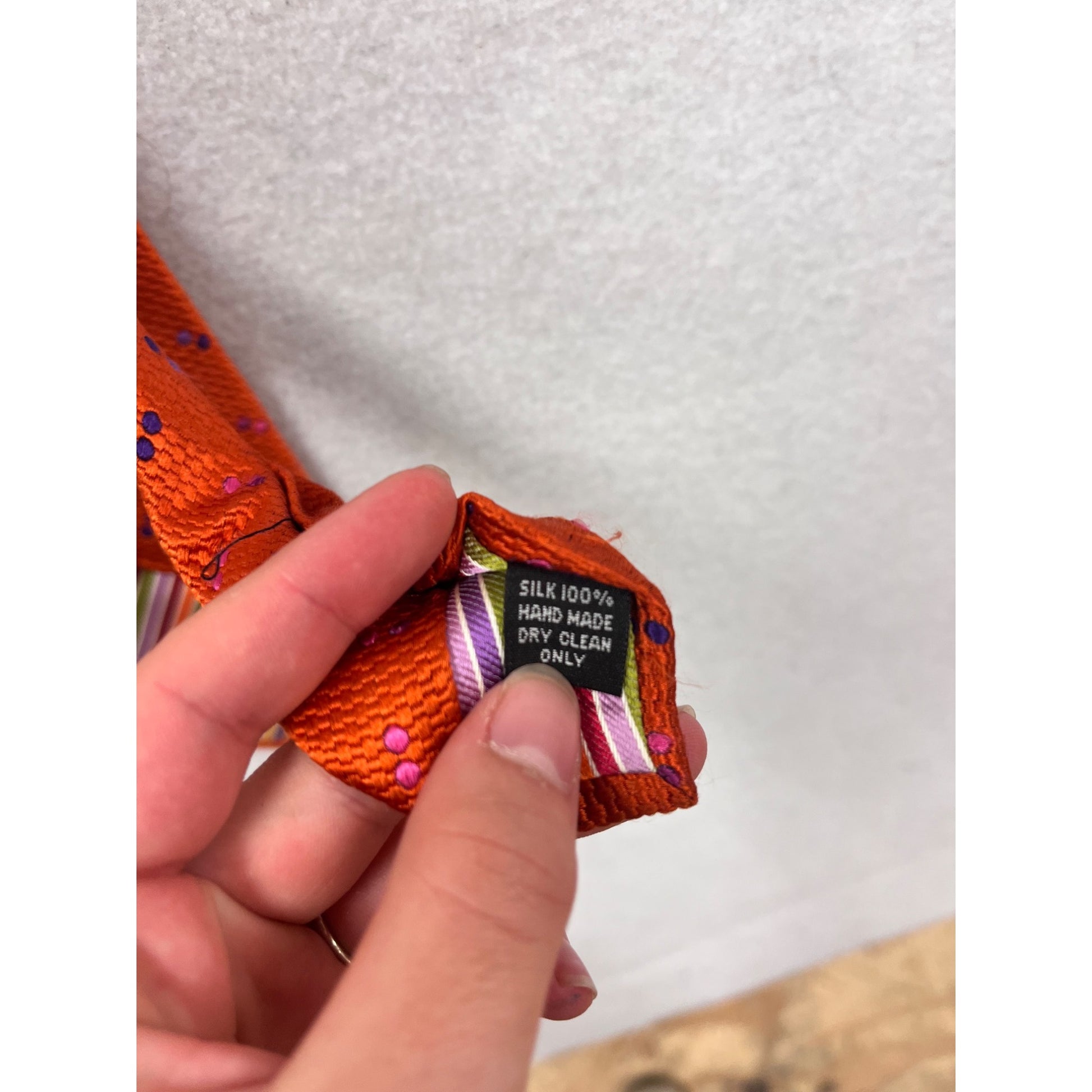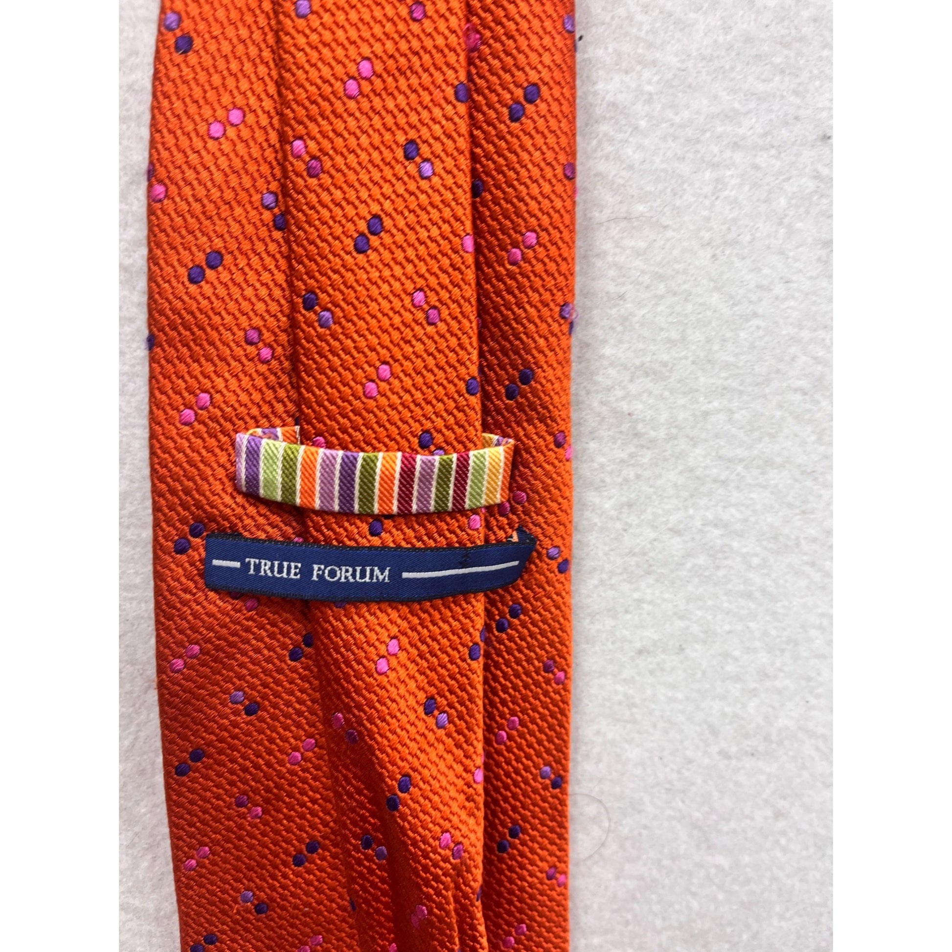 This True Forum tie is crafted from 100% silk, offering a smooth and luxurious feel. Its vibrant orange color, accented with pink and blue dot patterns, adds a touch of elegance to any formal attire. Handmade with attention to detail, this tie is a sophisticated addition to any wardrobe.