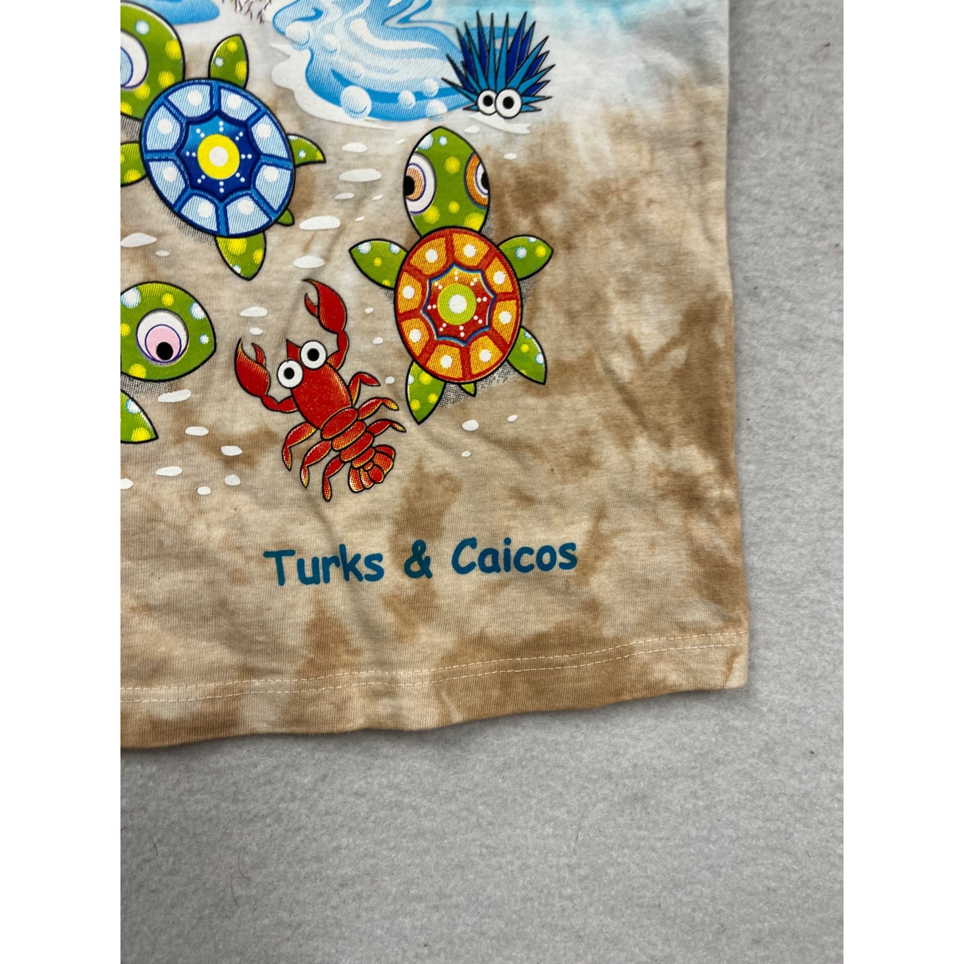 This tie-dye t-shirt features a vibrant sea turtle and ocean-themed design with a Turks & Caicos logo, crafted for comfortable wear with breathable cotton.