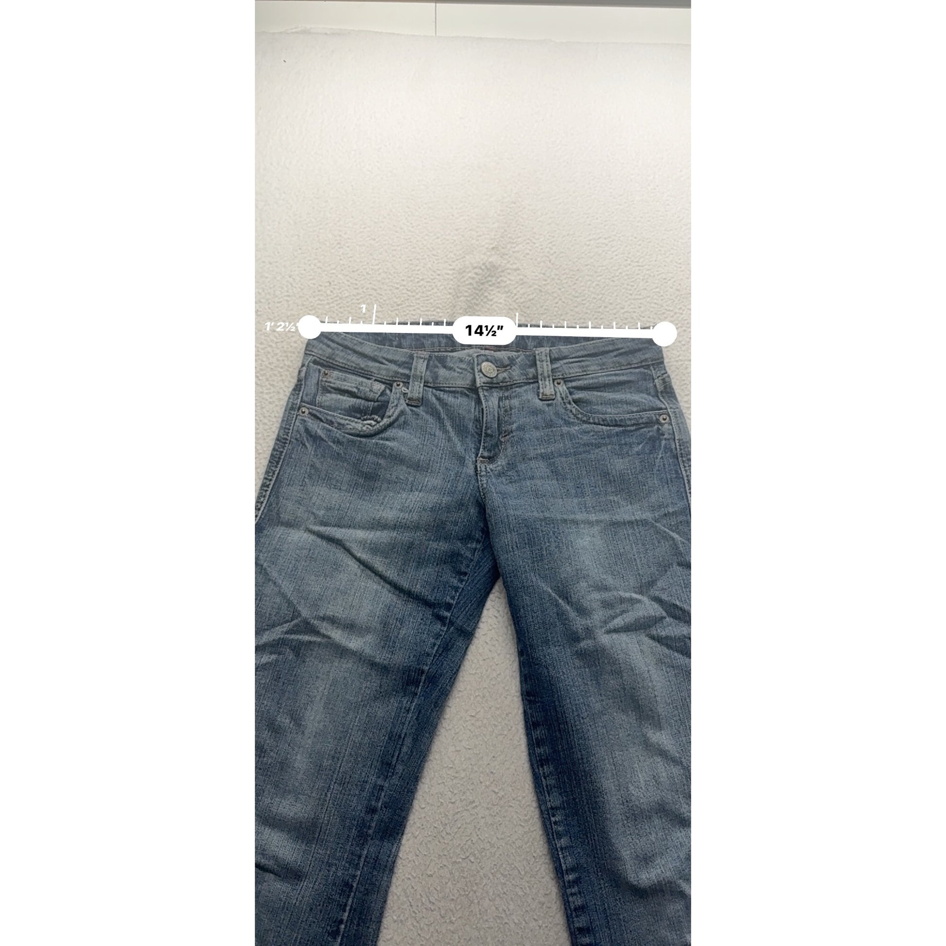 Waist = 14.5 inches flat, inseam = 32 inches, rise = 8.5 inches.