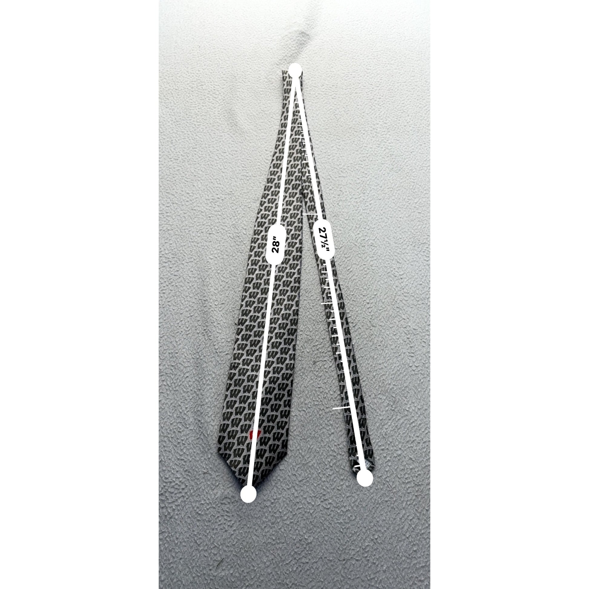 This silk tie features a repeat "W" pattern in neutral tones, complemented by a bold red University of Wisconsin logo. Ideal for formal or academic settings.