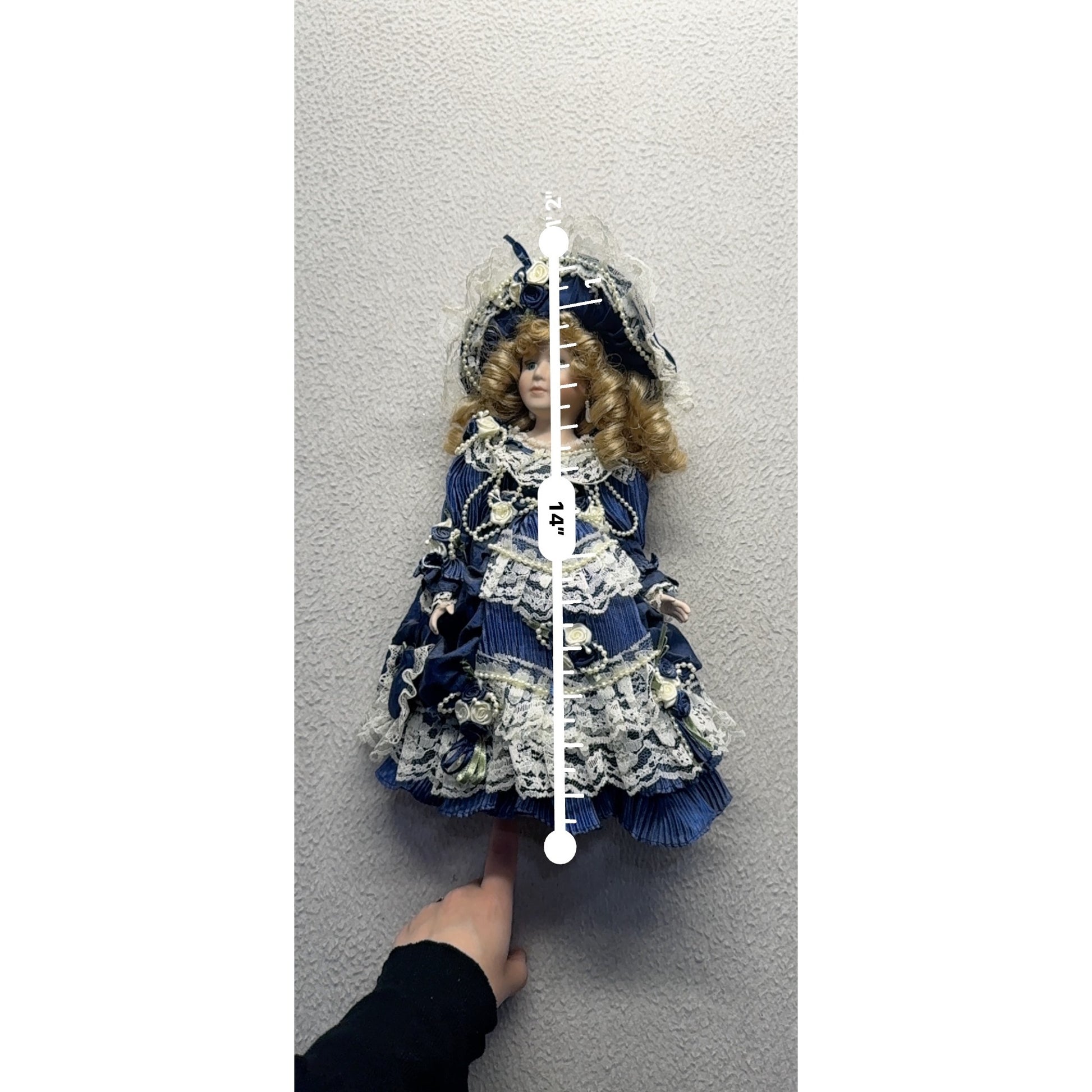 This porcelain doll evokes a bygone Victorian elegance. Adorned in a royal blue dress with intricate lace, roses, and pearls, she stands as a timeless treasure. Her golden curls beneath a matching bonnet tell the story of grace and refinement, making her a striking figure of vintage charm.