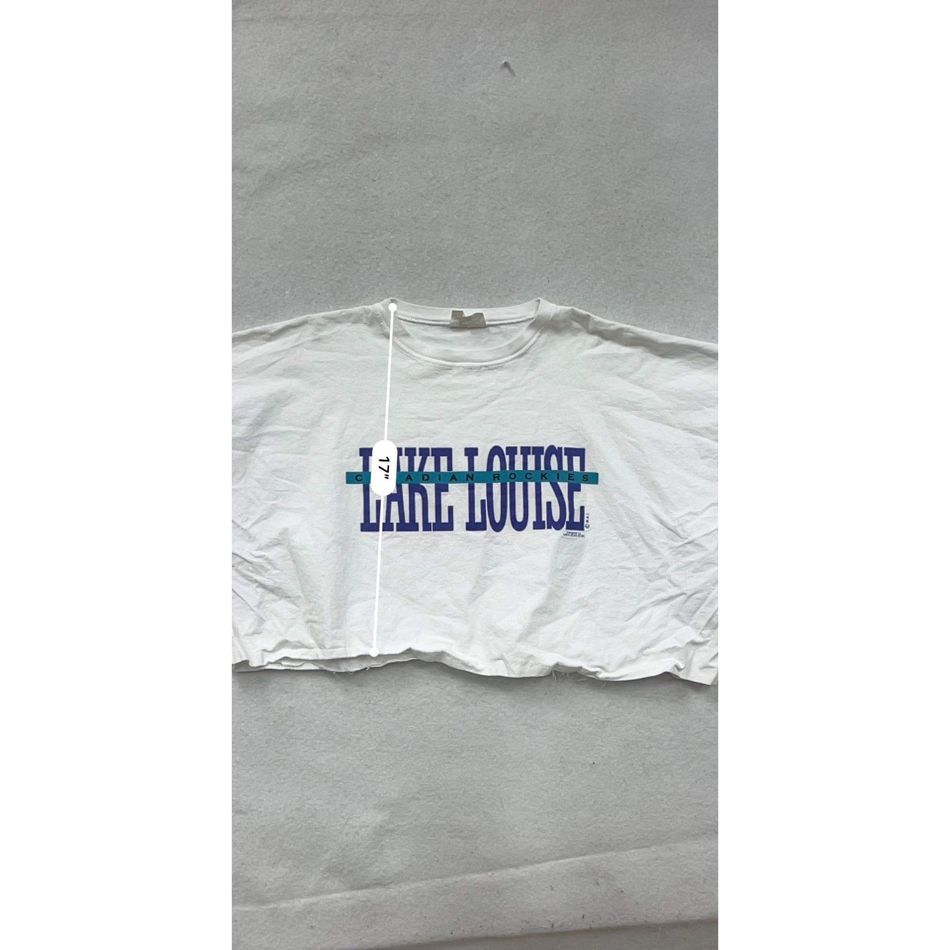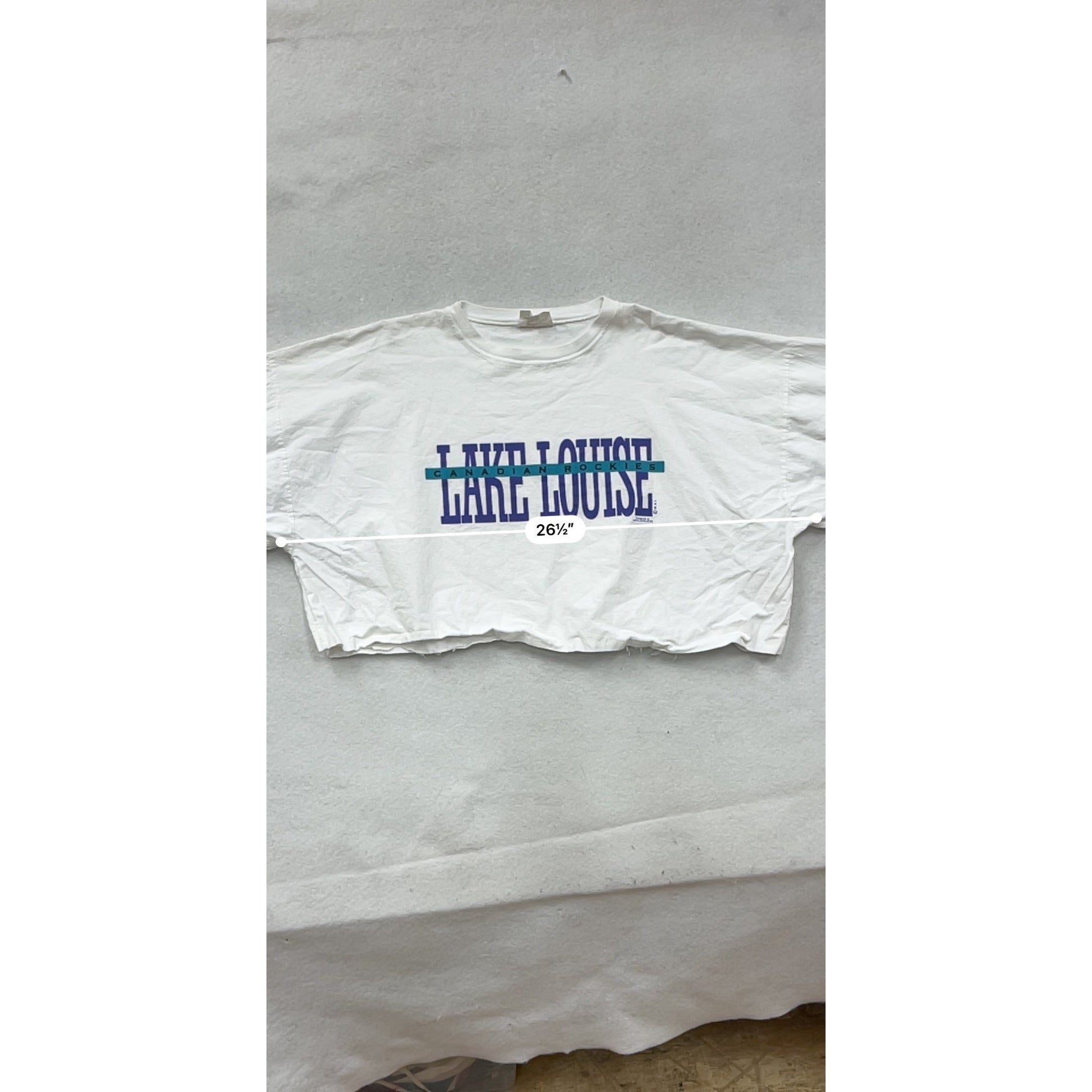 This 90s cropped long sleeve tee features a bold Lake Louise graphic, evoking vintage alpine ski club vibes. Crafted from pure cotton, it offers soft comfort and nostalgia.