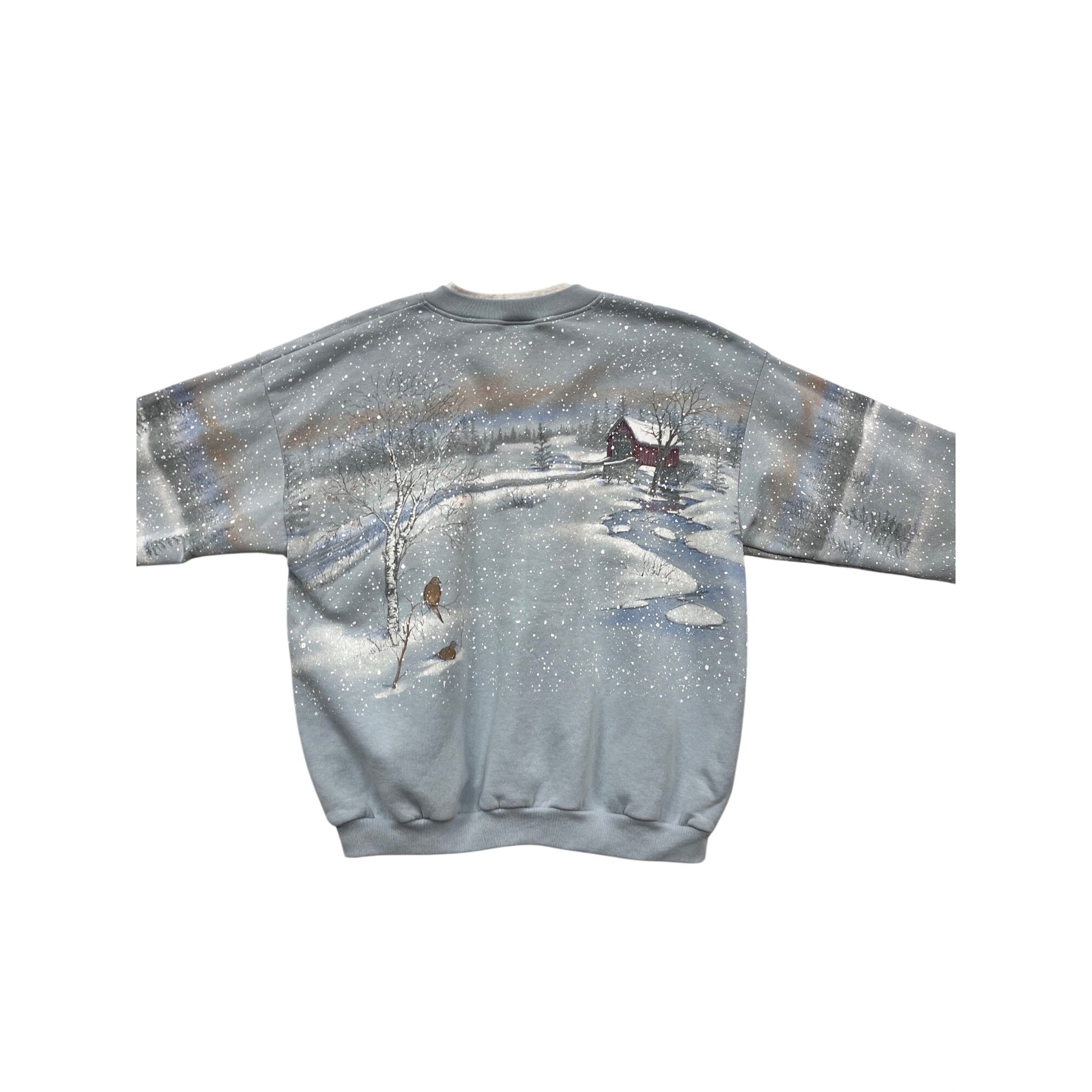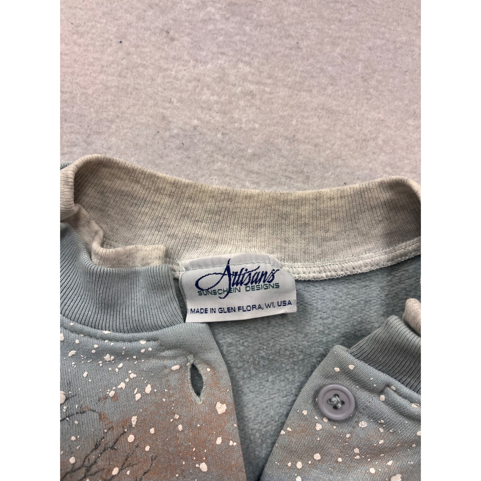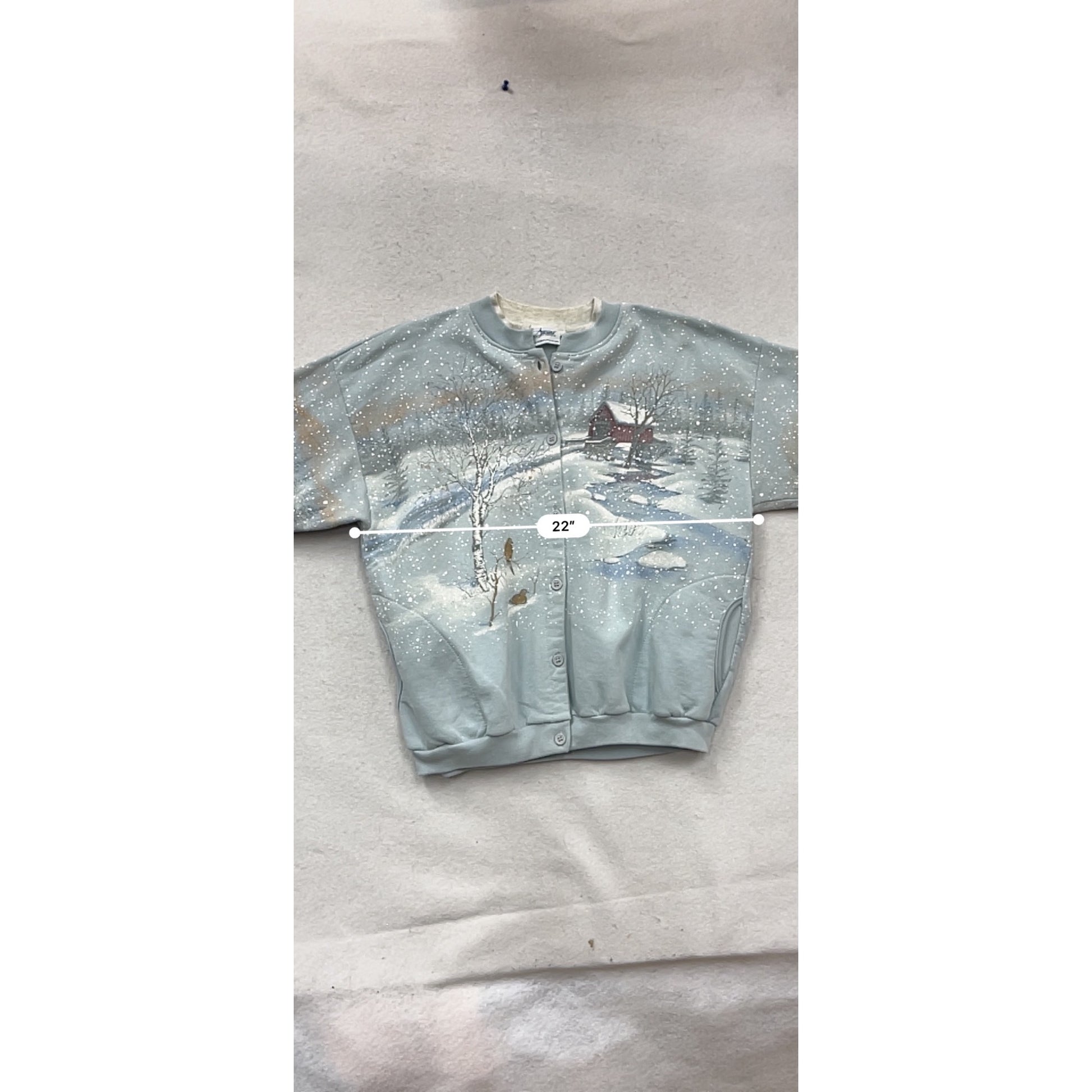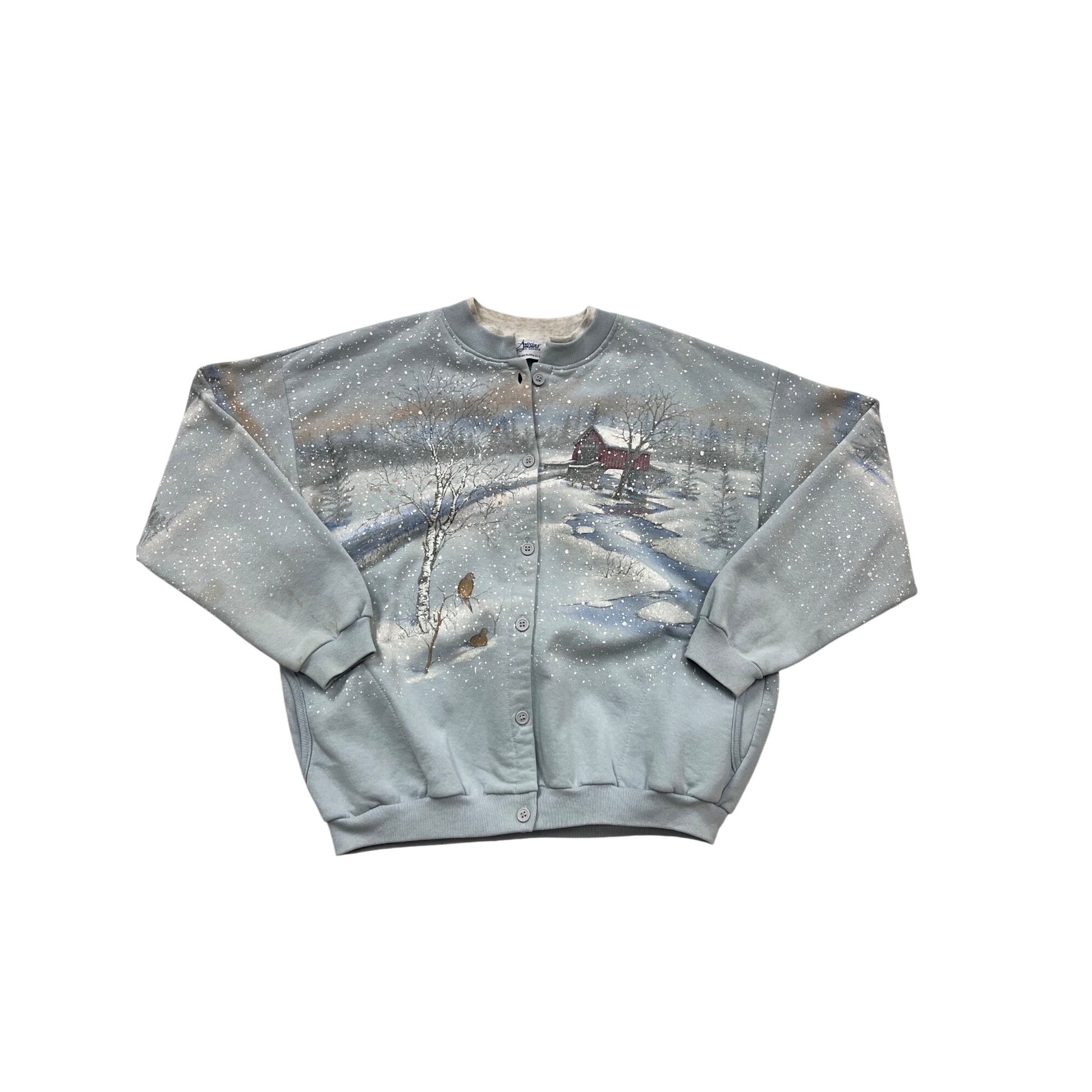 This vintage sweatshirt evokes the charm of a snowy countryside, with a serene hand-painted winter scene. Its cozy warmth and button-front design enhance its timeless appeal.