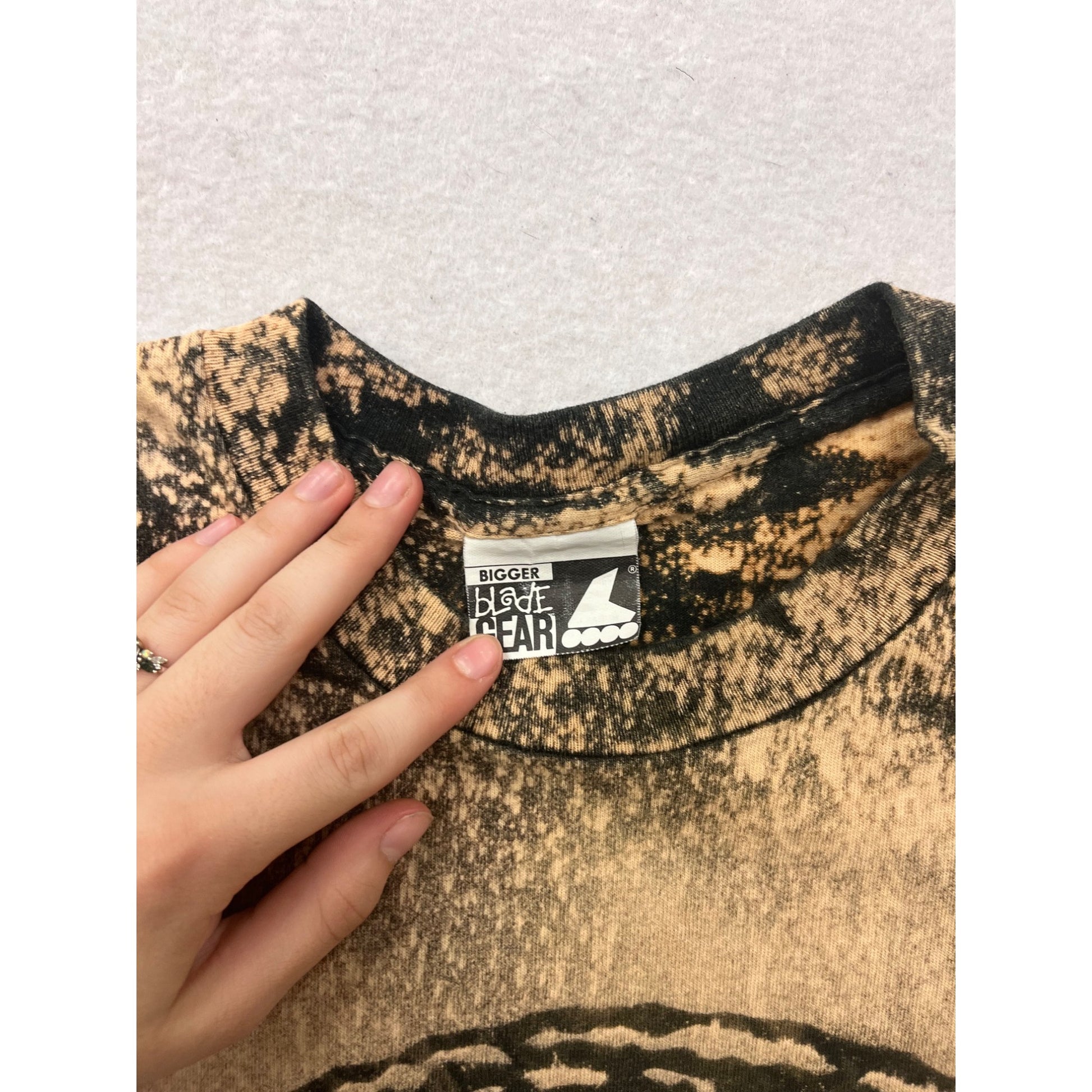 This vintage Bigger Rollerblade Gear T-shirt features a unique design and an eye-catching pattern. Made of 100% cotton, it offers comfort and style. The shirt's neutral tones and relaxed fit make it a versatile addition to any wardrobe, suitable for casual outings or relaxed gatherings.