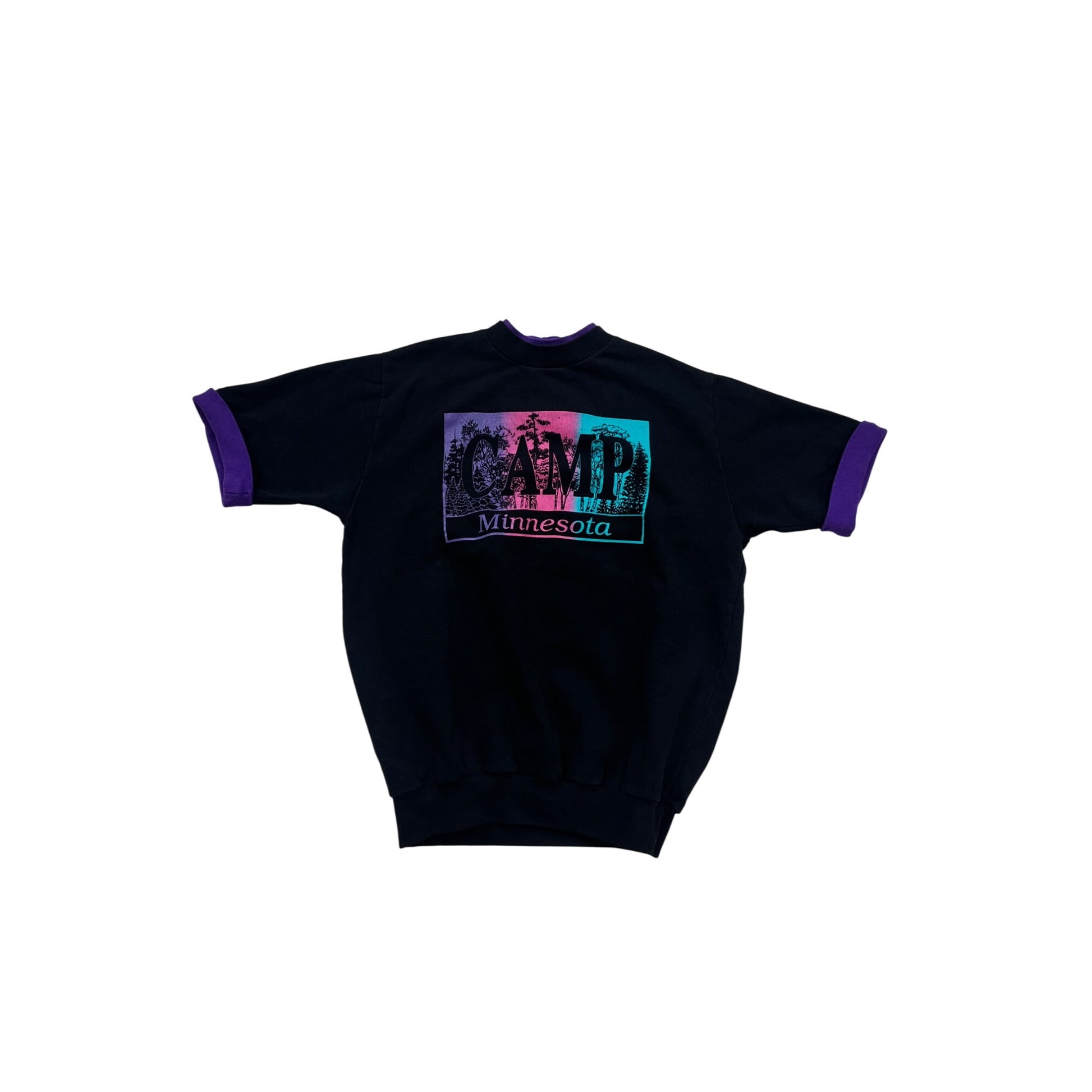 This vintage sweatshirt embodies the charm of retro camp adventures with its bold neon graphic and timeless black fabric. Soft and cozy, the contrasting purple accents enhance its unique appeal, while the relaxed fit ensures comfort. A nostalgic piece for those who treasure classic outdoor memories.