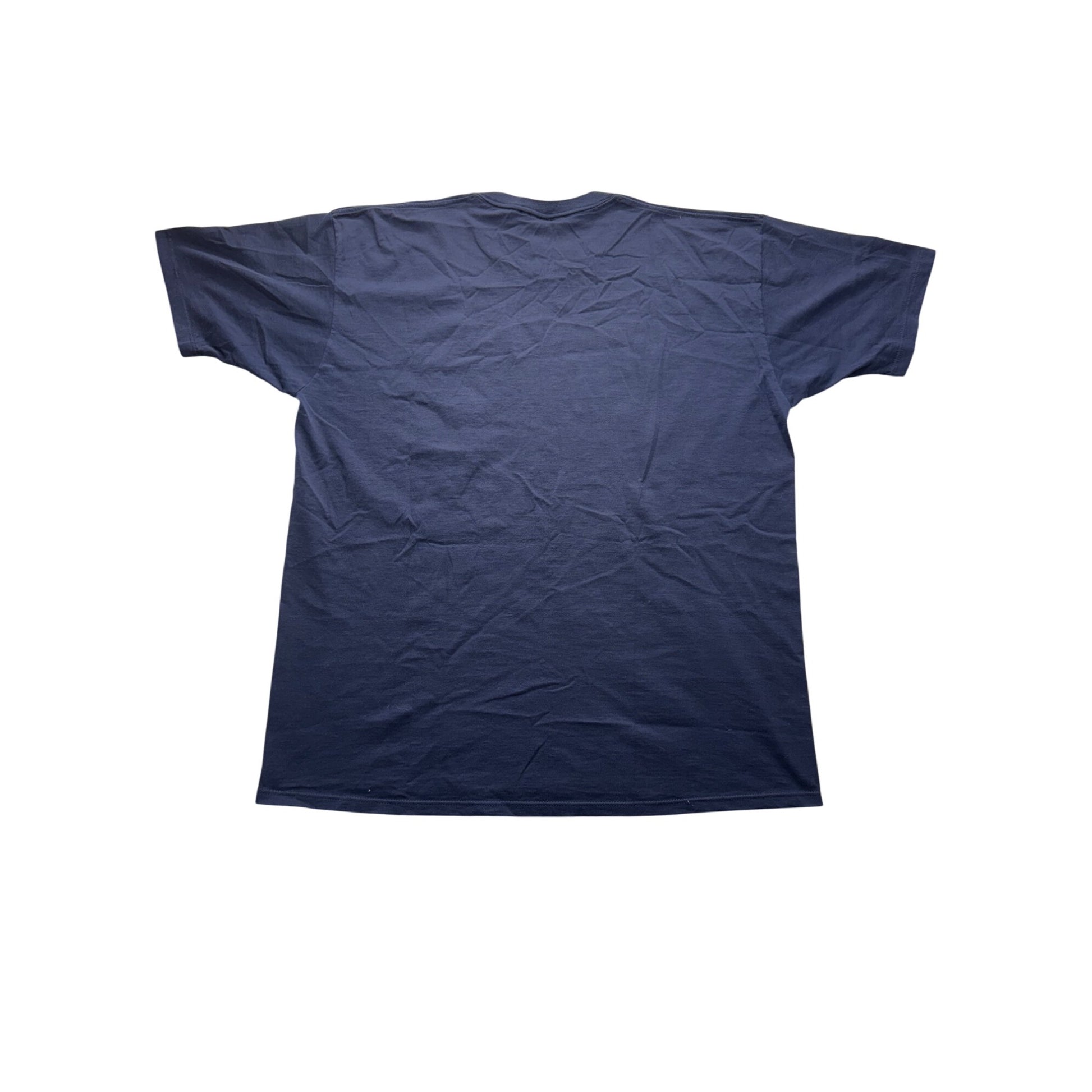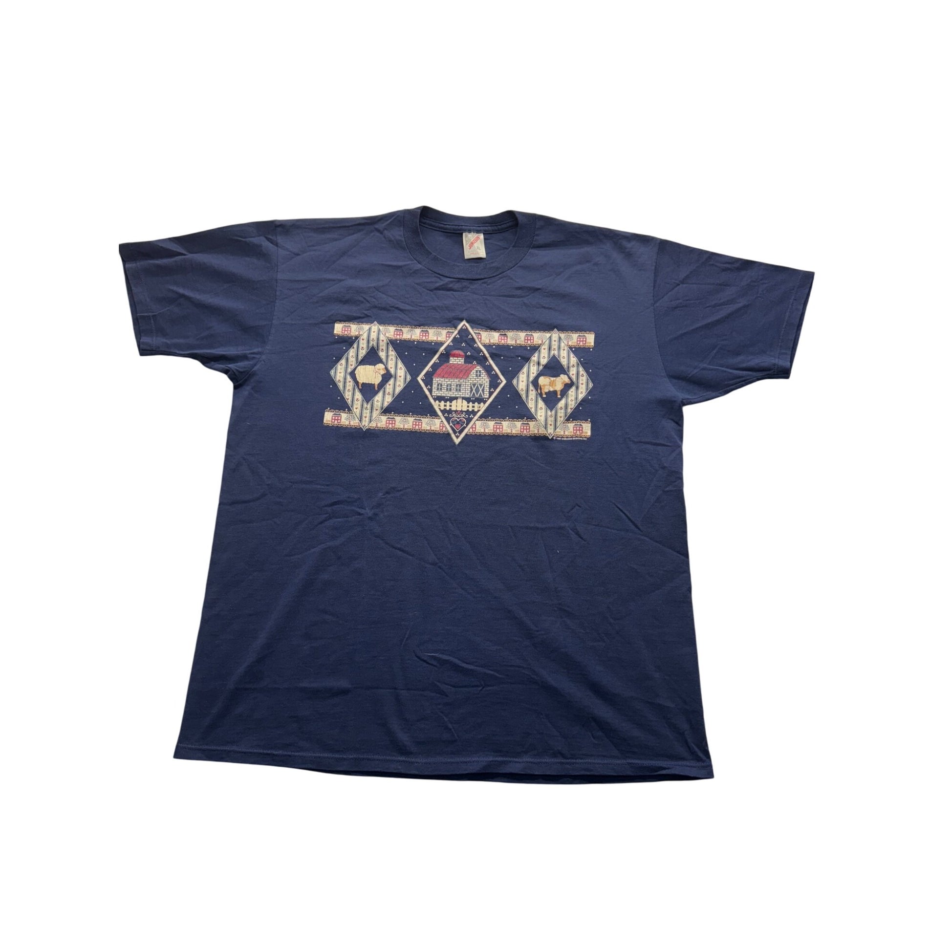 This vintage Jerzees T-shirt features a unique barn and sheep graphic, offering a blend of comfort and style. Made with a cotton-polyester mix, it's designed for durability and a soft feel. The shirt's navy blue color complements the intricate graphic, making it a versatile addition to any wardrobe.