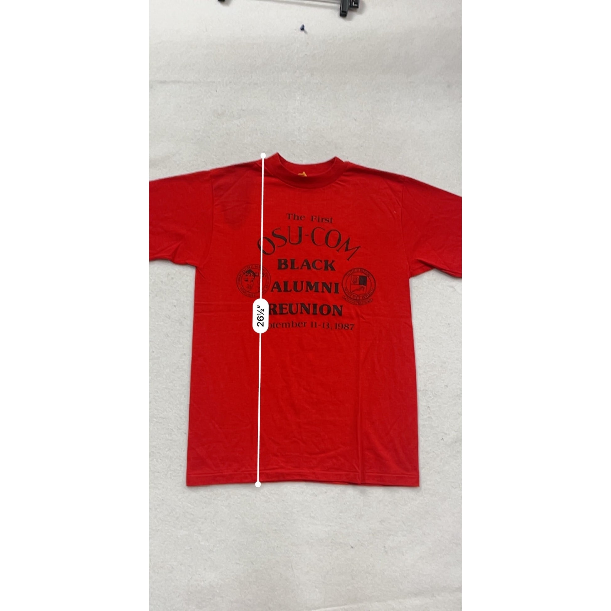 This vintage T-shirt commemorates the first OSU-COM Black Alumni Reunion held September 11-13, 1987. It's crafted from a cotton-polyester blend, ensuring comfort and durability. The bold red color with black print makes it a standout piece. A rare find for collectors and alumni.