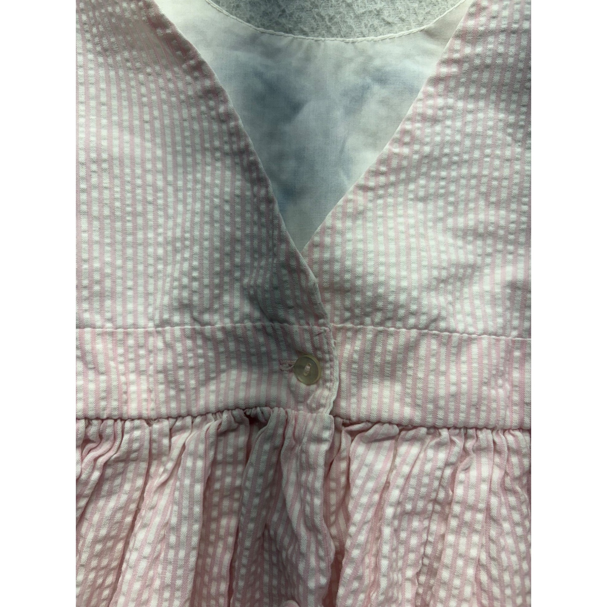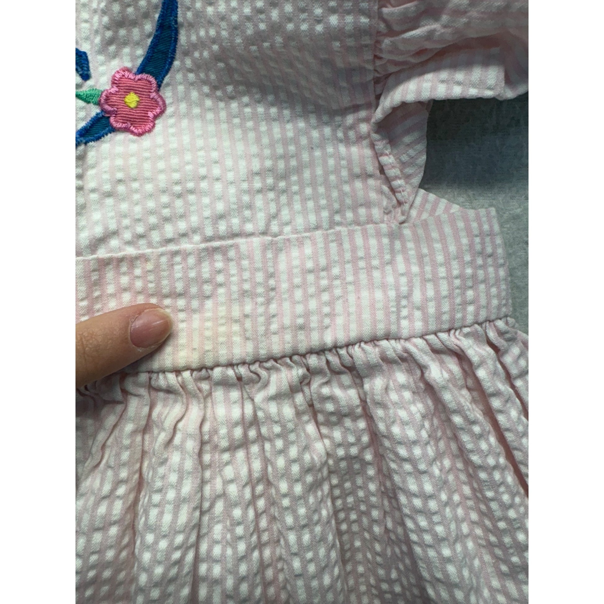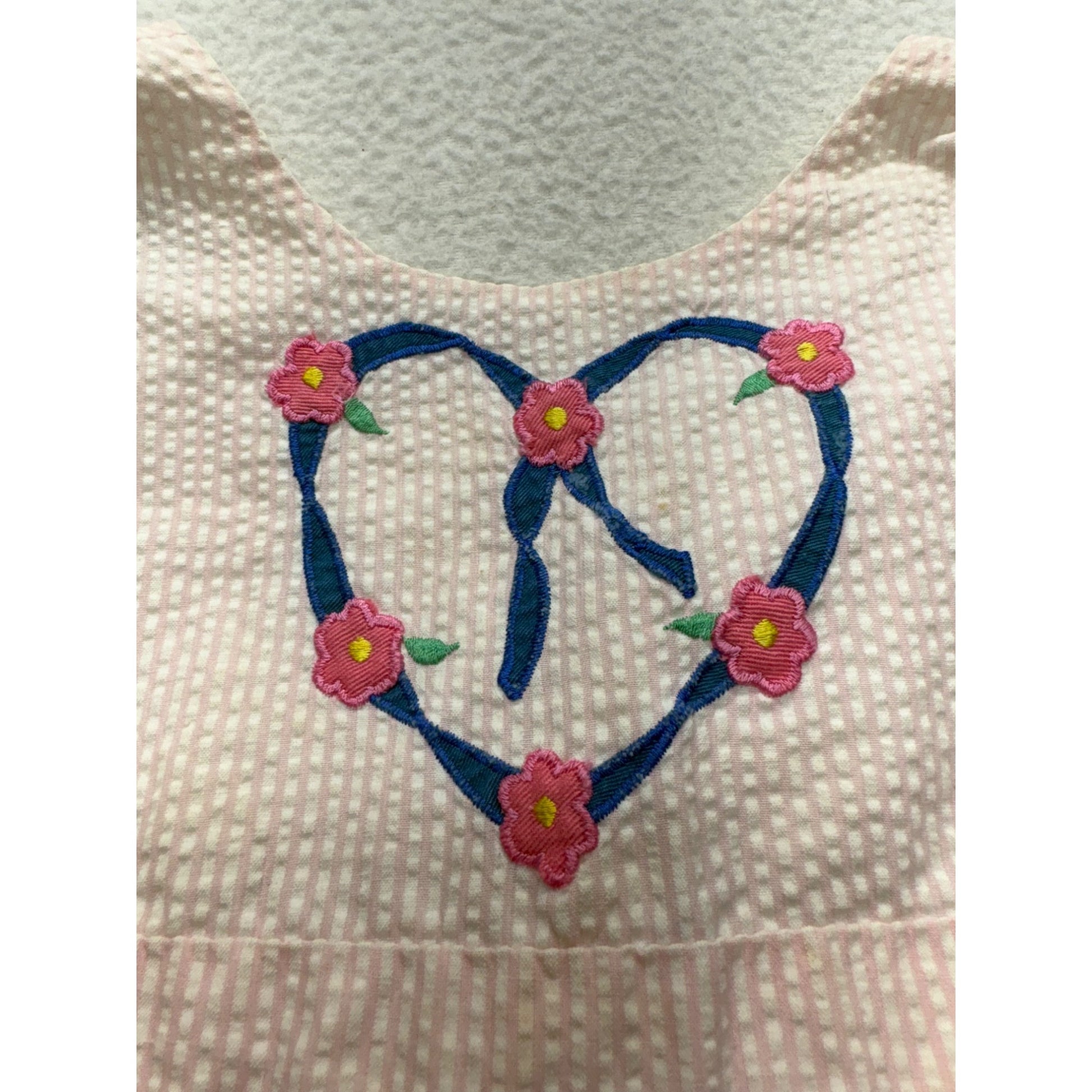 This sweet vintage dress features soft pink seersucker fabric, adorable flutter sleeves, and a charming embroidered heart and flower design. The bow-tied back and button details add nostalgic charm.