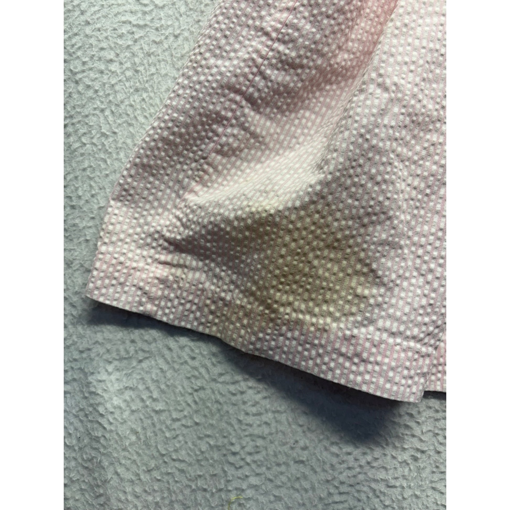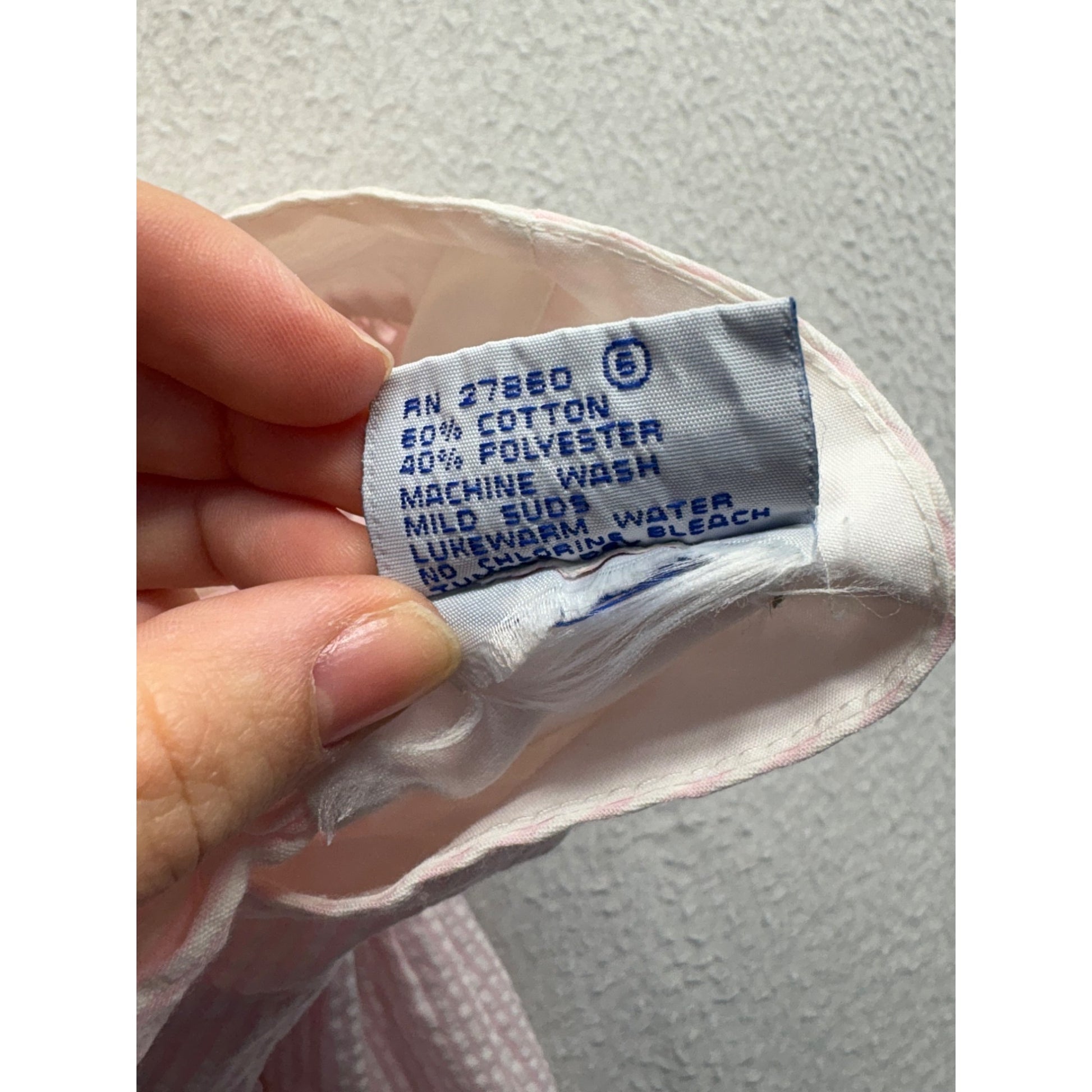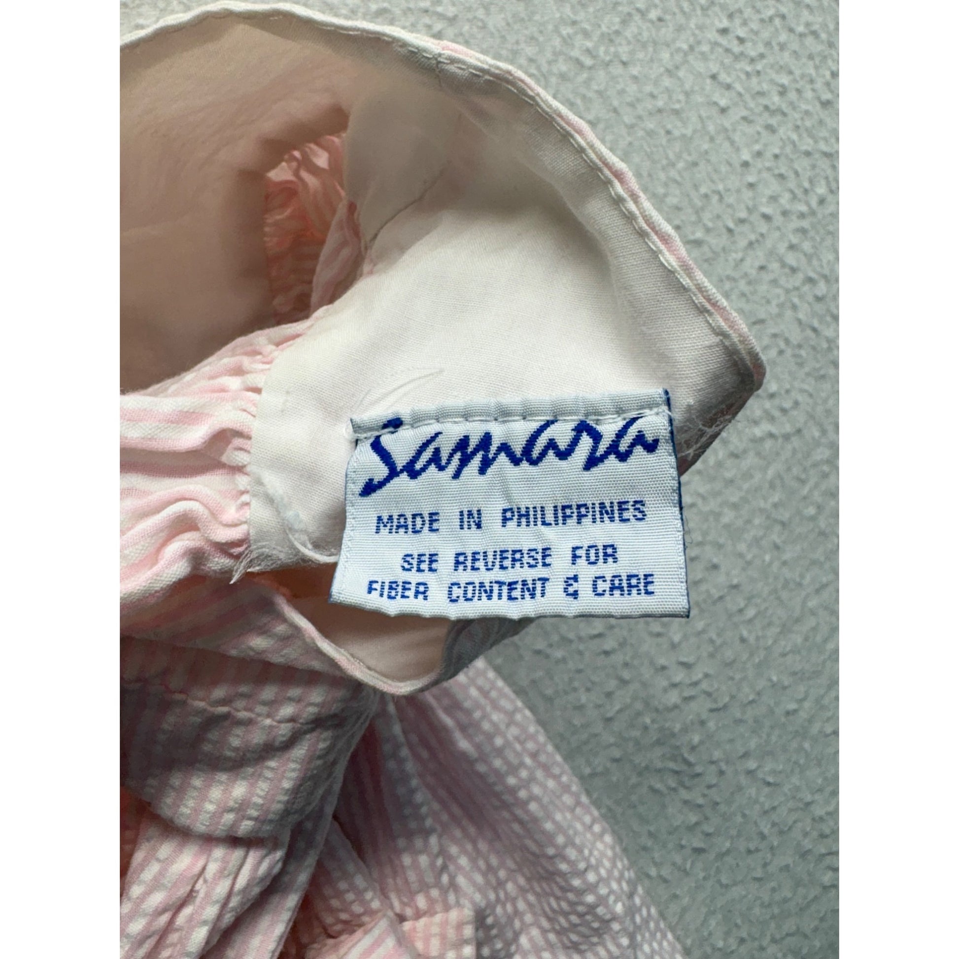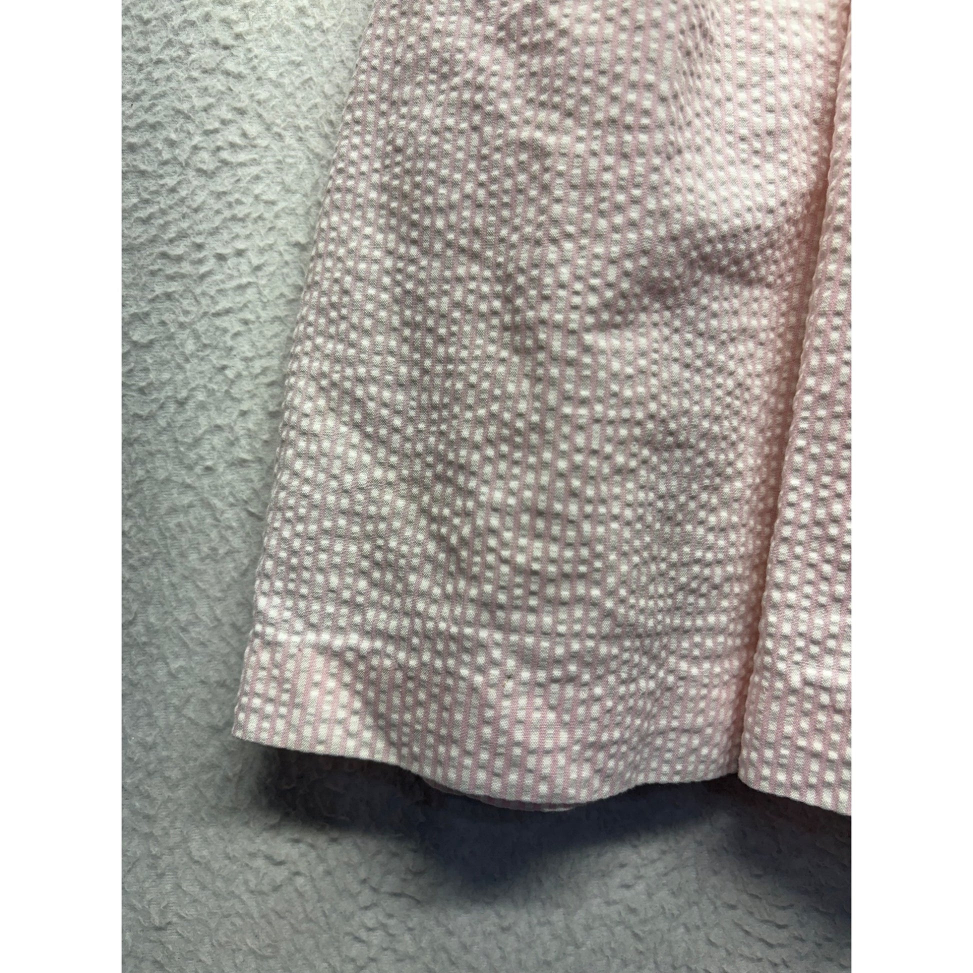 This sweet vintage dress features soft pink seersucker fabric, adorable flutter sleeves, and a charming embroidered heart and flower design. The bow-tied back and button details add nostalgic charm.