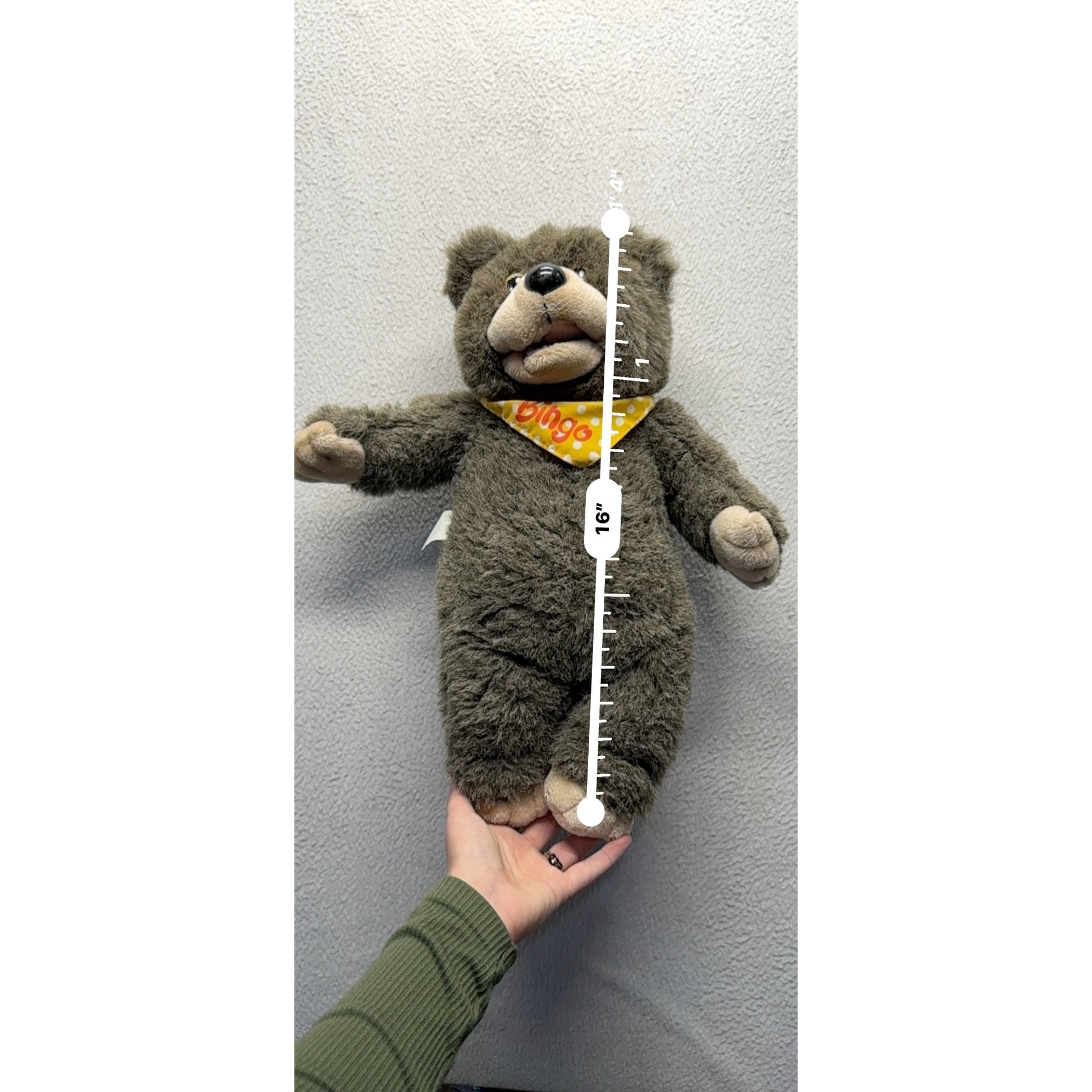 This charming plush bear features a soft brown fur texture and a cheerful yellow polka-dot bandana with "Bingo" lettering, making it a delightful collectible.