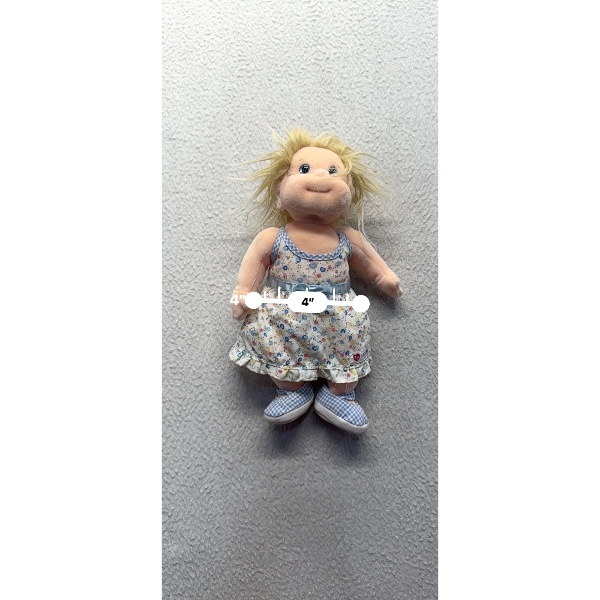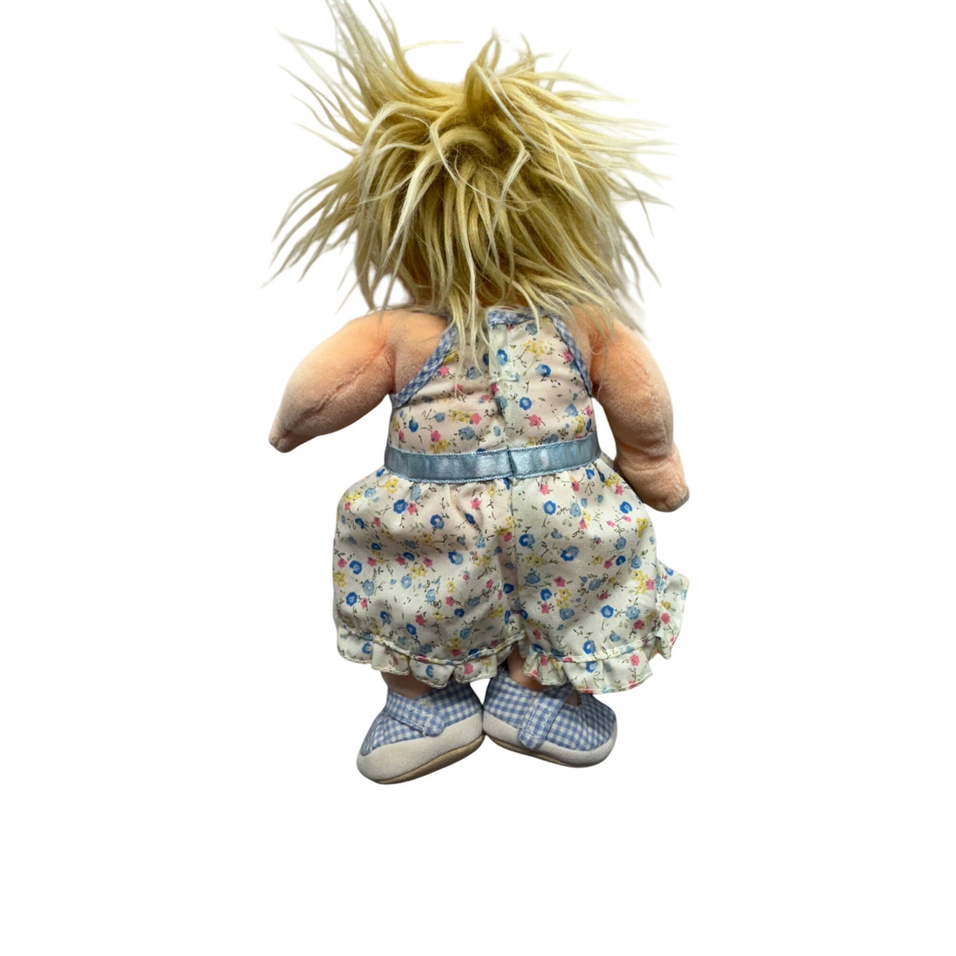 Once upon a time, a charming rag doll with golden hair became a favorite companion. Dressed in a dainty floral dress with checkered shoes, she carries memories of simpler days, ready to create new ones. Her soft, cuddly build makes her a delightful keepsake or heirloom.