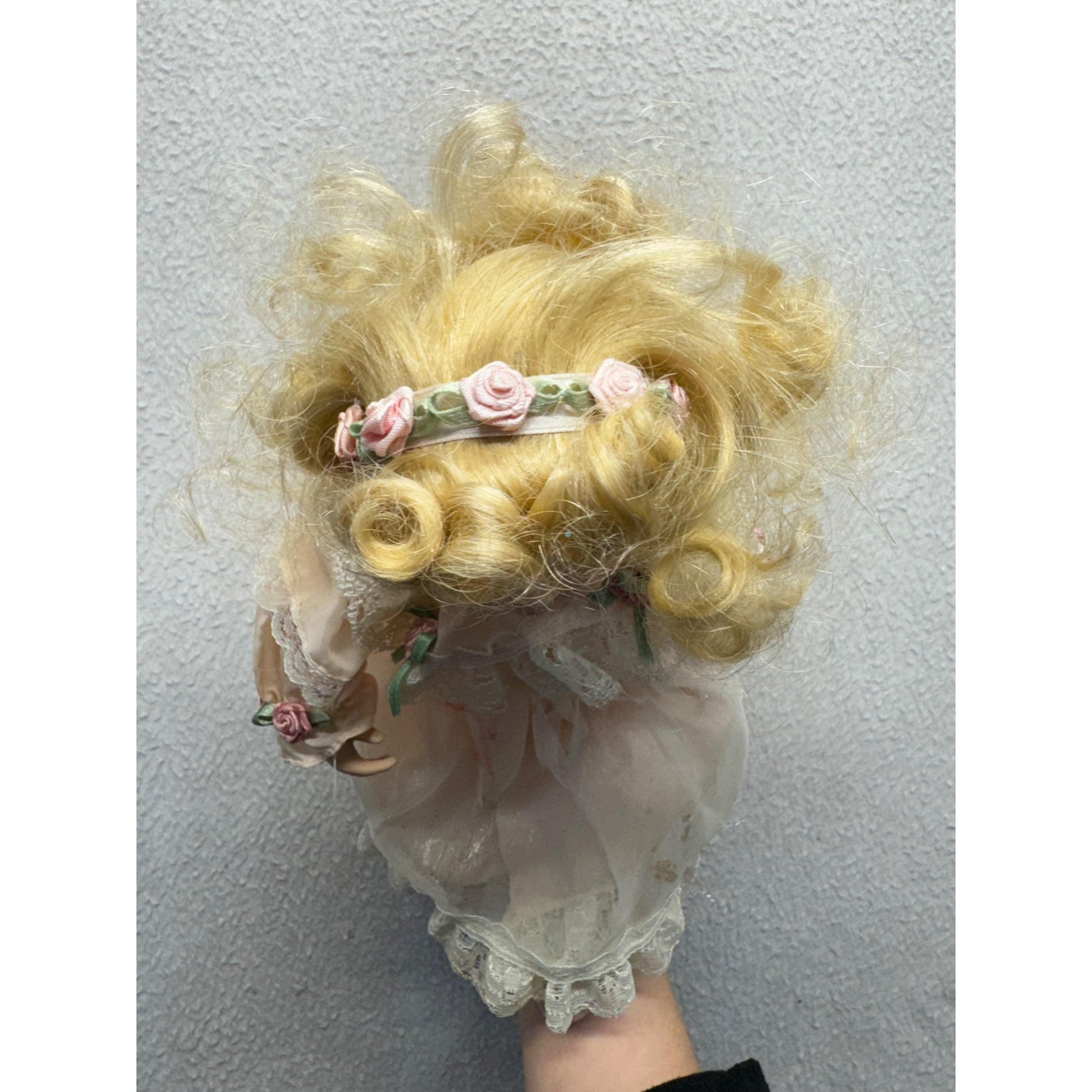 Vintage Porcelain Blonde Curly Hair Doll Lace Dress & Rose Accents 10" 418B