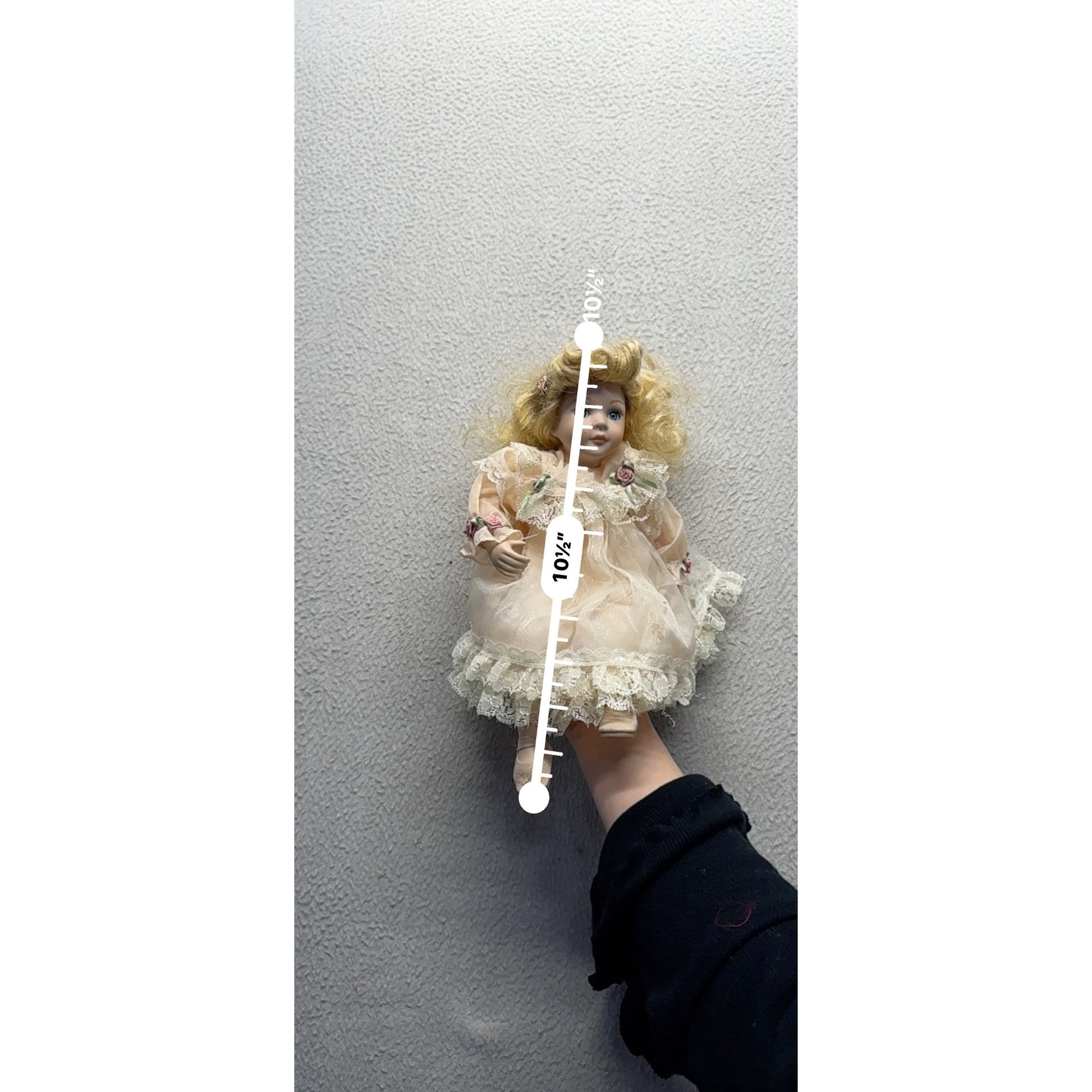 This delicate porcelain doll tells a whimsical story with her blonde curls, rosy cheeks, and lace-embellished dress adorned with quaint rose details. Her intricate craftsmanship and vintage charm evoke memories of childhood innocence and timeless beauty. An enchanting addition to a collector's display or as a nostalgic decorative piece.
