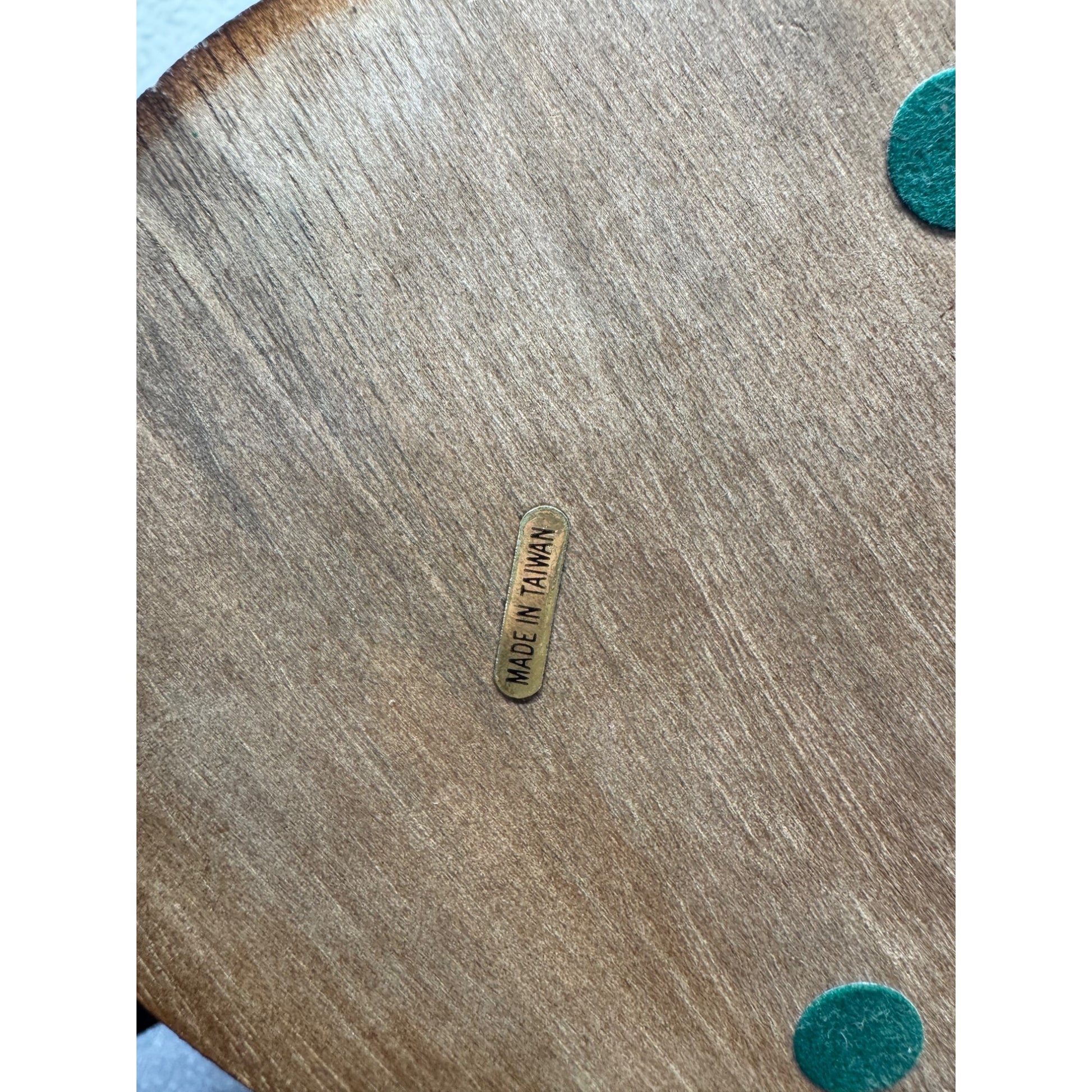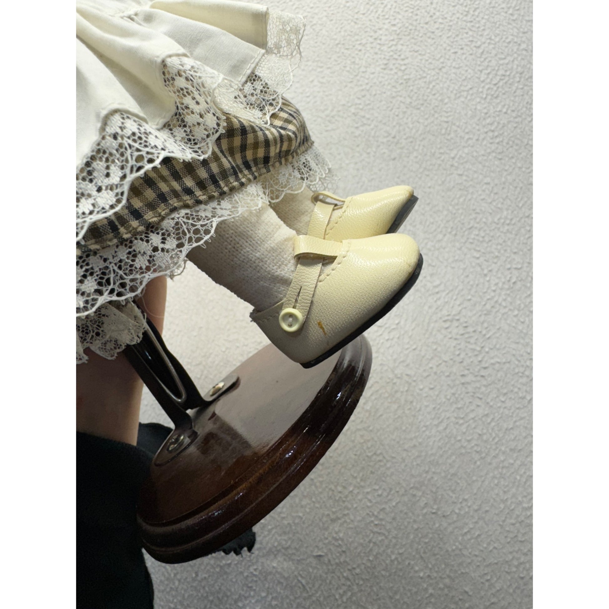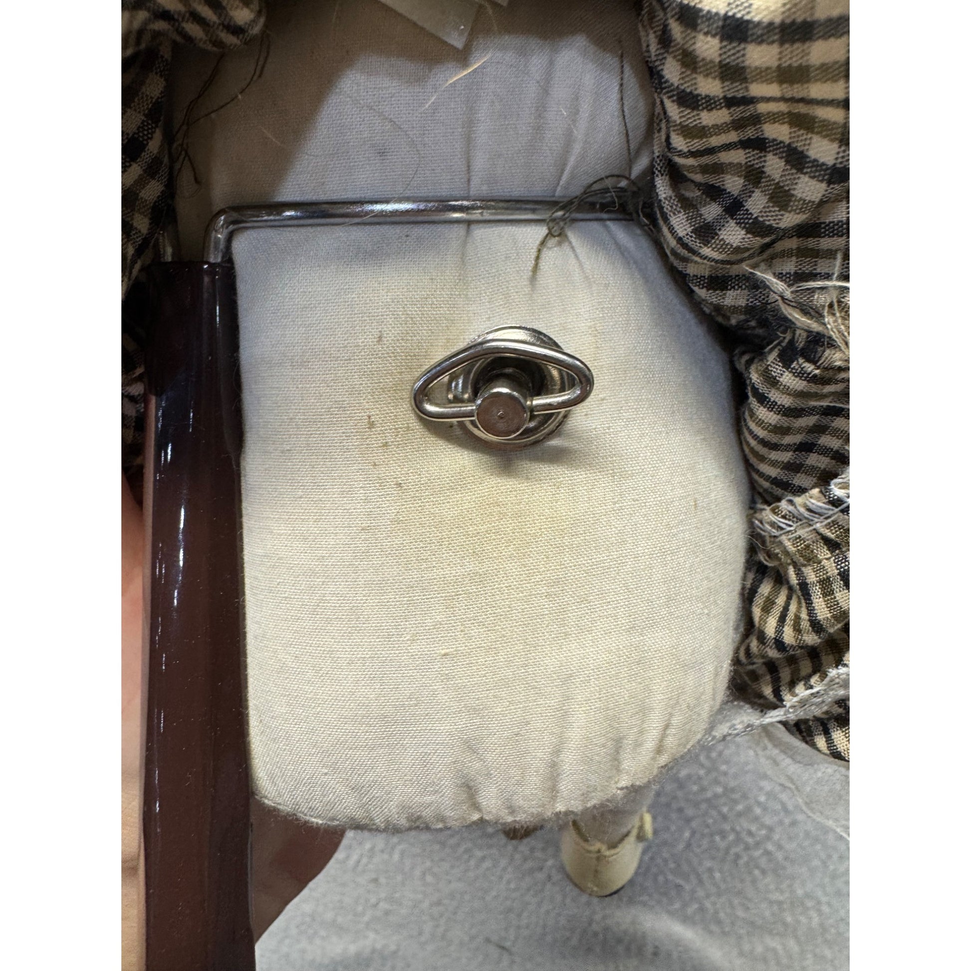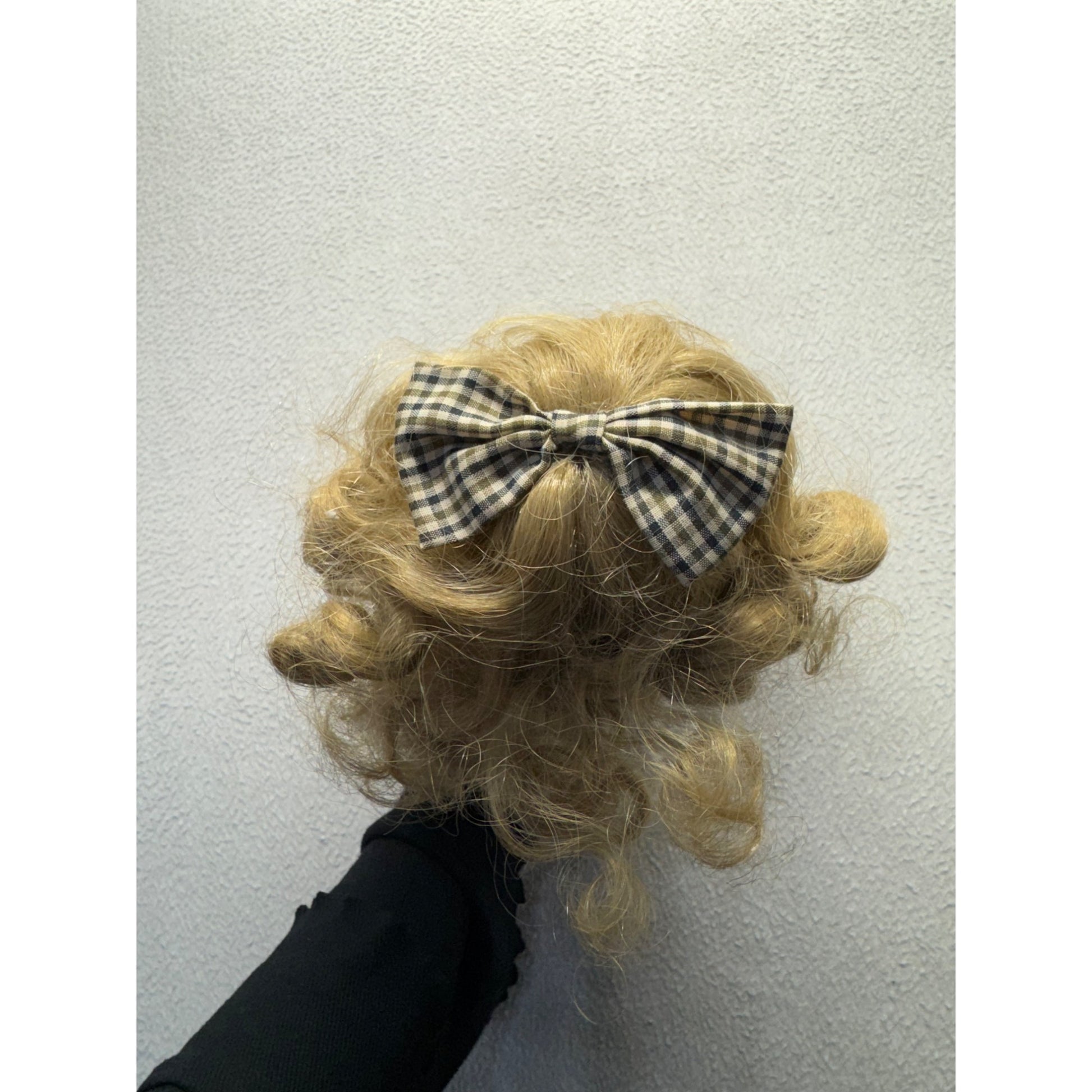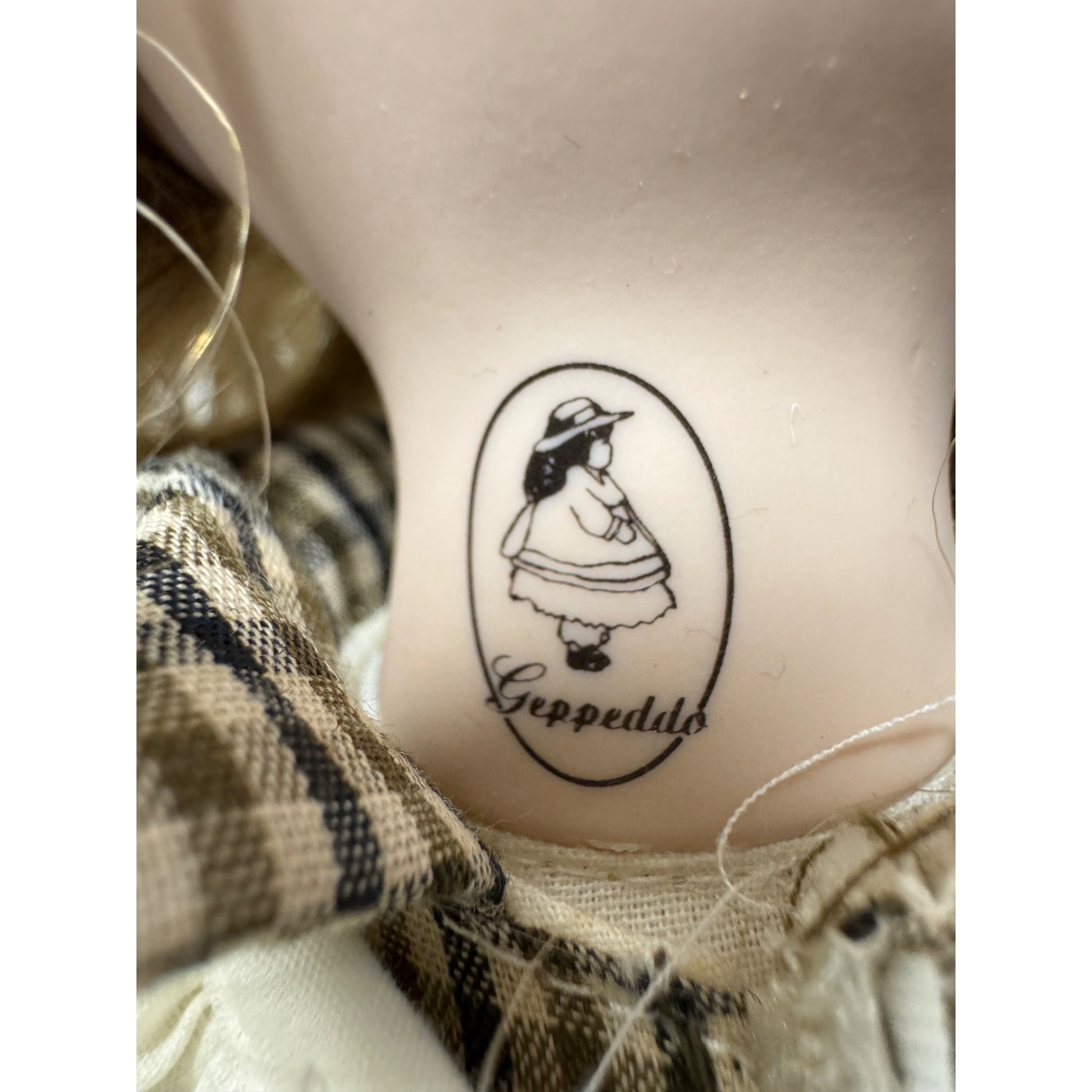 This vintage porcelain doll features detailed craftsmanship with a checkered dress and matching bow. The doll's curly brown hair and expressive blue eyes add to its timeless elegance, making it a charming addition to any collection. It stands at a height of 12 inches, providing a classic display.