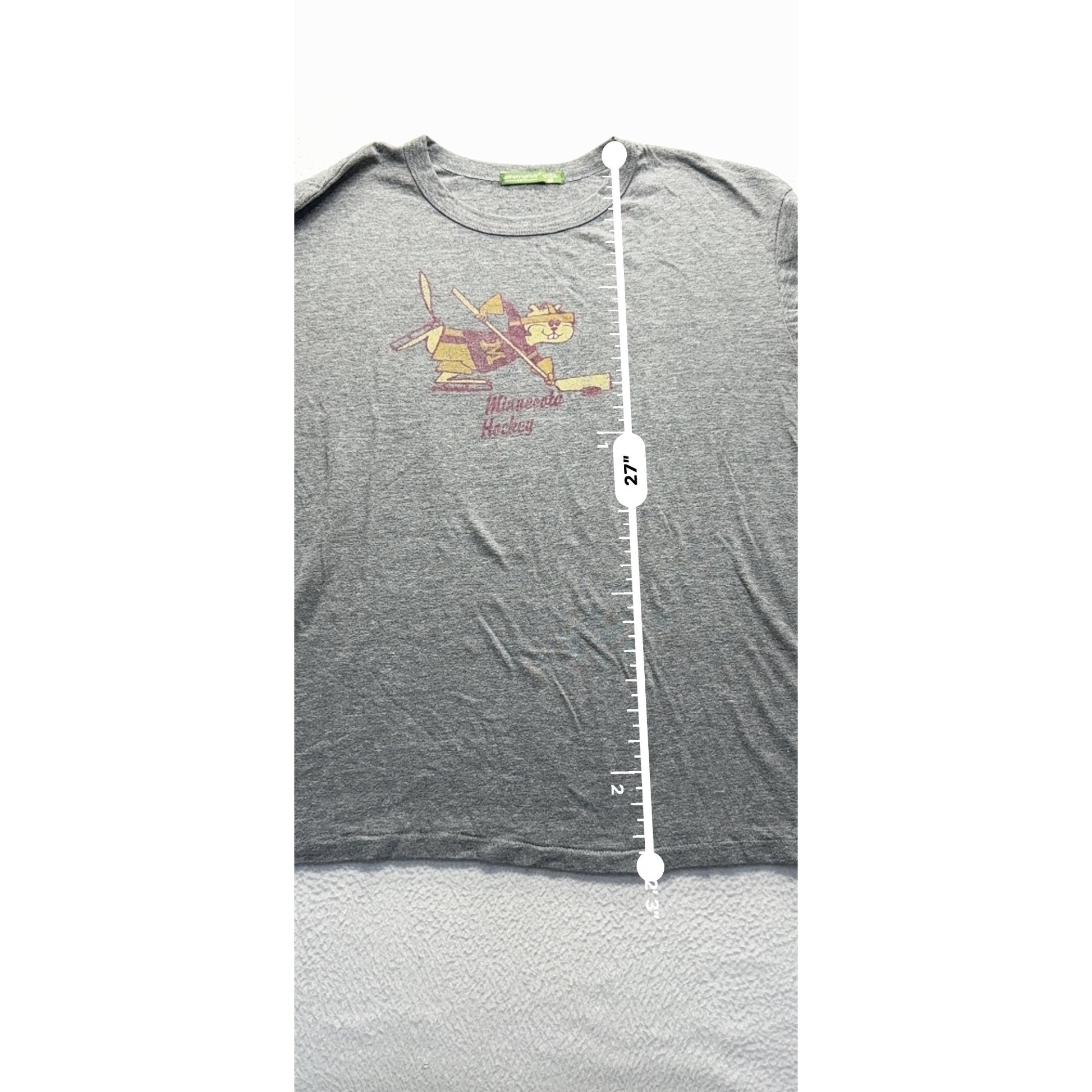 This vintage Minnesota Hockey t-shirt offers a relaxed fit, ideal for casual outings or lounging. Made with a soft blend of materials, it ensures comfort and style. The nostalgic graphic brings a touch of playful spirit, perfect for hockey enthusiasts.