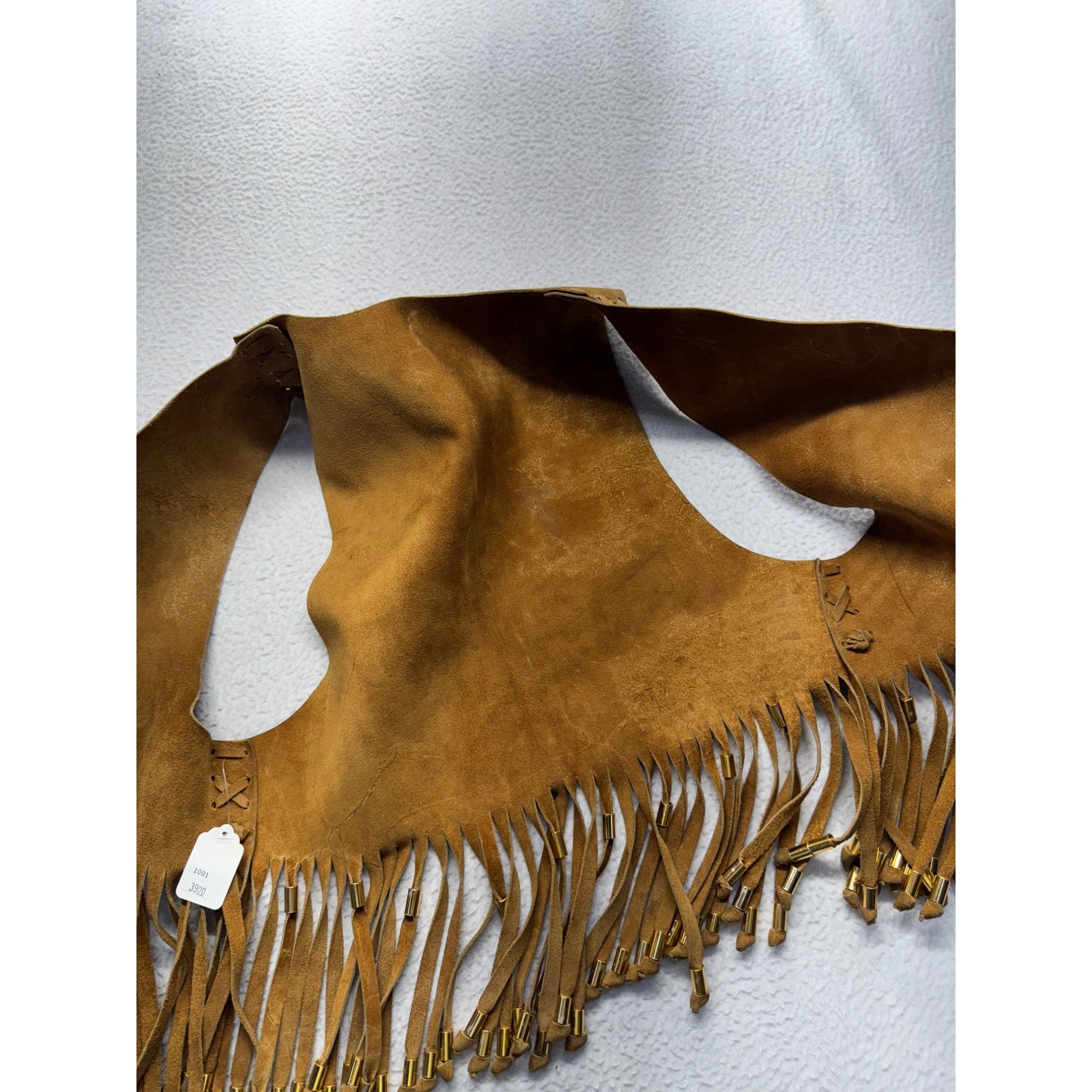 This vintage western-style vest features a rich brown suede composition with eye-catching fringe and bead detailing. Perfect for adding a classic touch to a wardrobe, the vest is designed with intricate stitching and a distinctive open front. Its timeless appeal makes it a versatile addition to a collection.