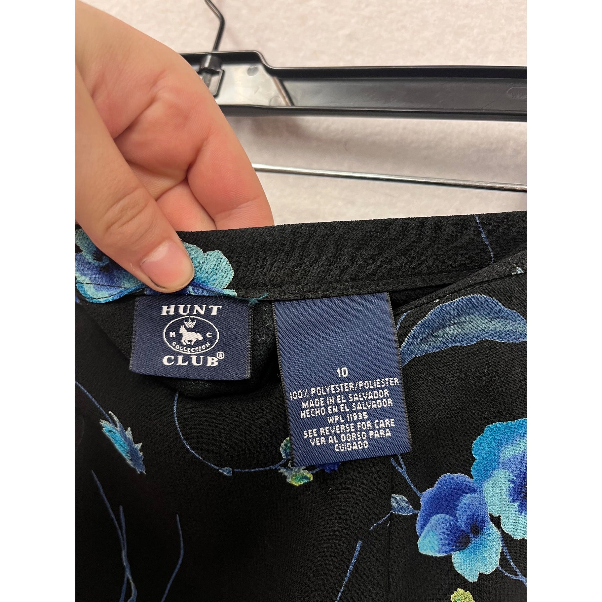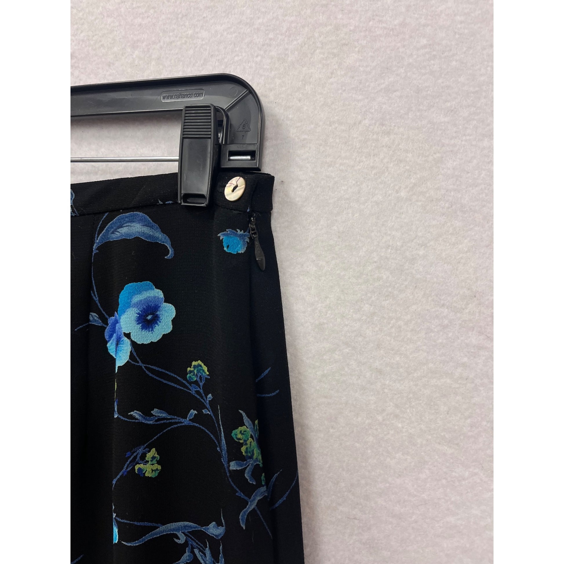 This skirt offers a timeless floral pattern on a black base with blue and green accents. Designed for versatility, it pairs seamlessly with various tops and is suitable for professional or casual settings. Its polyester material ensures durability and comfort.