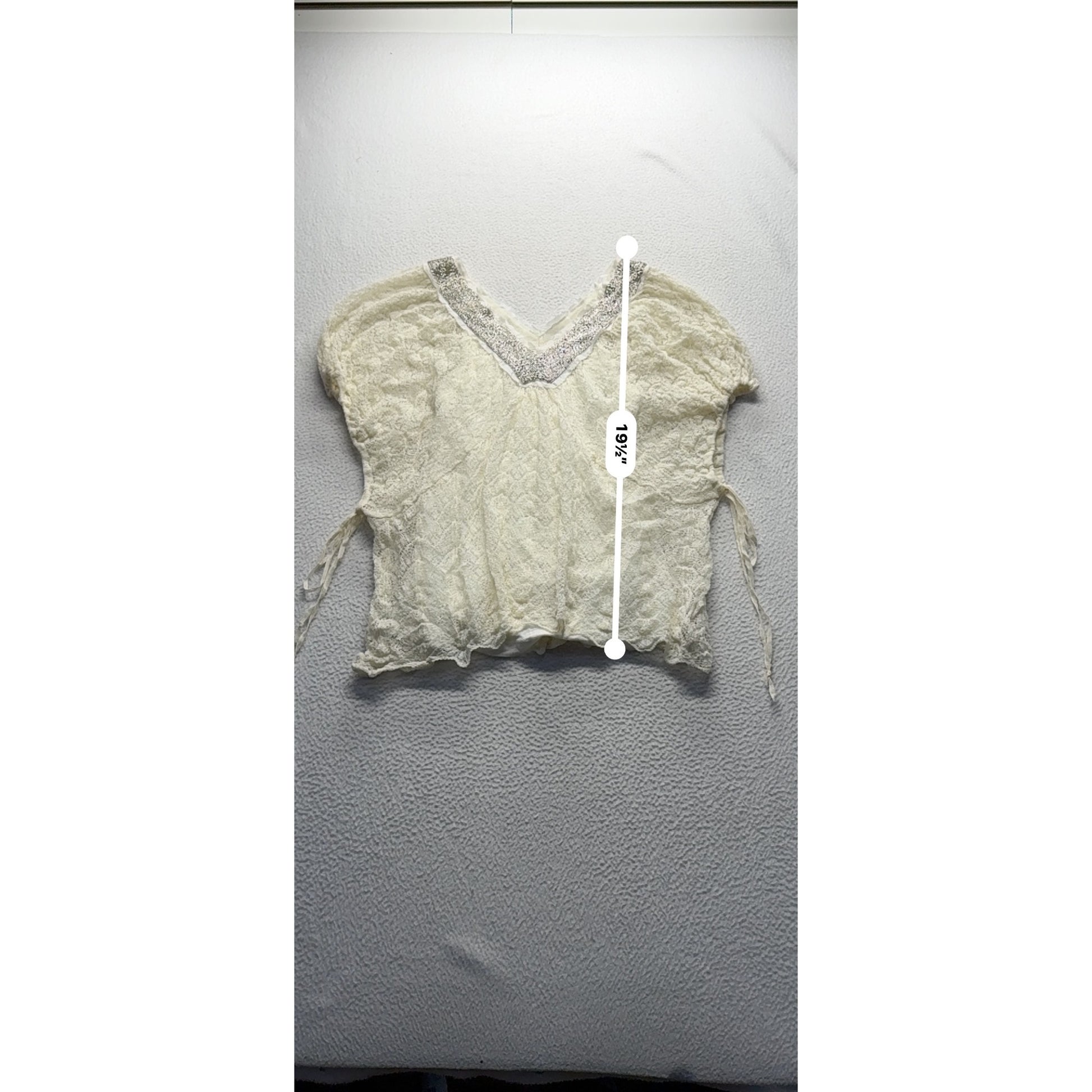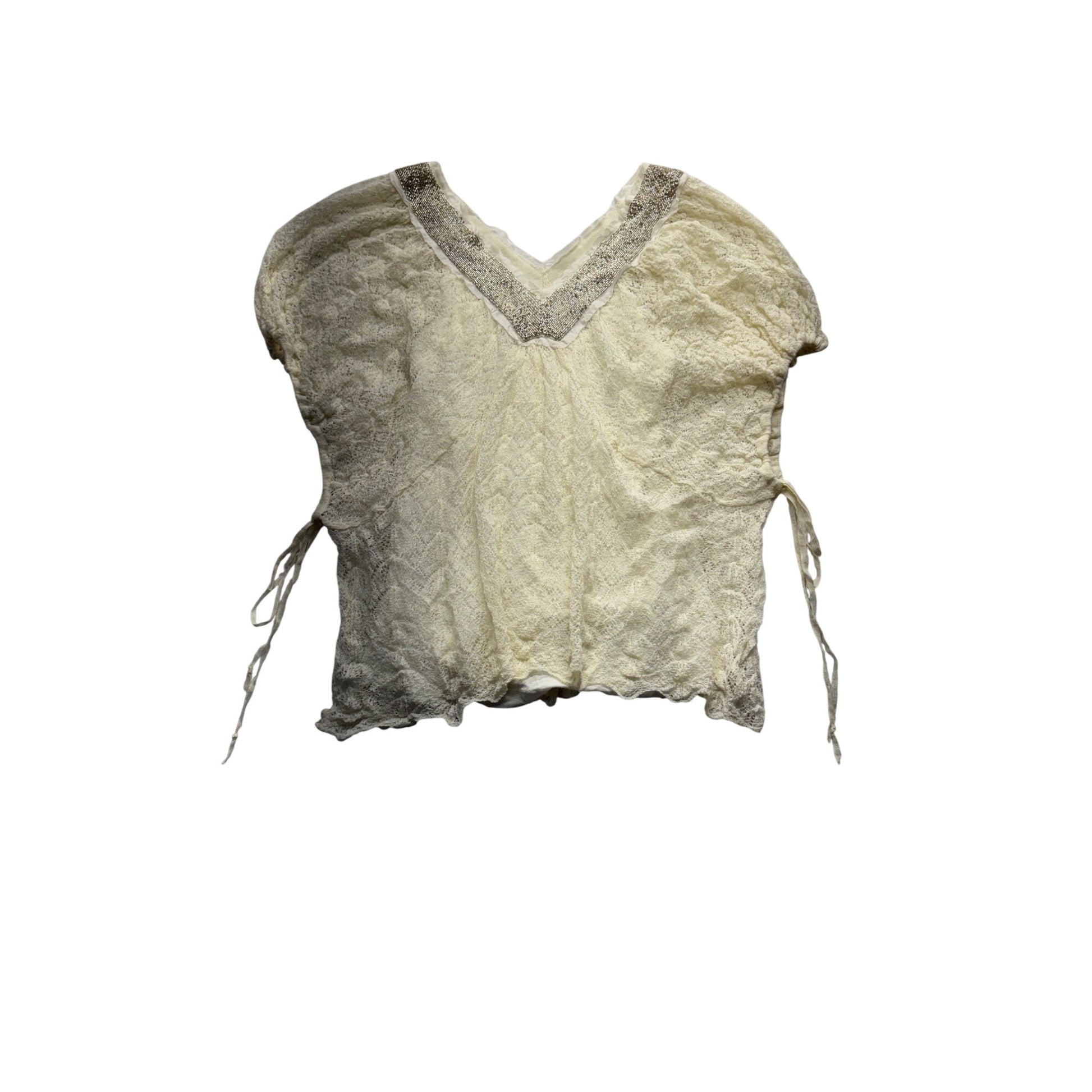 This delicate vintage lace top is an easy choice for light, breezy wear. Its beaded neckline adds subtle shine, while the side ties offer a relaxed fit.