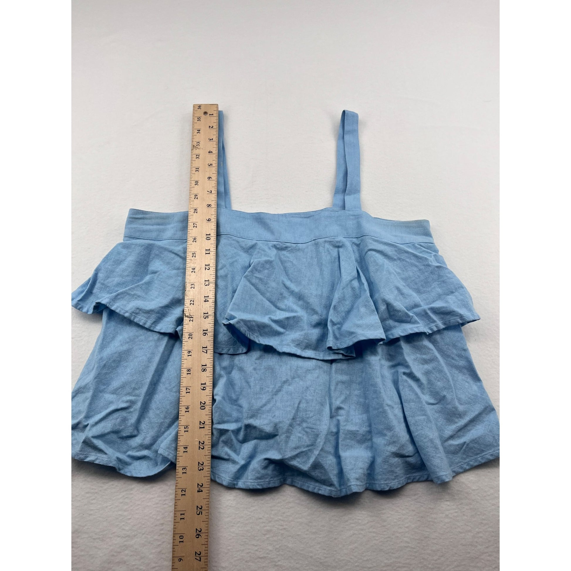 This stylish tank top features delicate ruffles that add a touch of elegance to any wardrobe. Crafted from breathable linen and rayon , it provides comfort and a relaxed fit. The blue hue enhances its versatile and chic appeal, making it suitable for various occasions.
