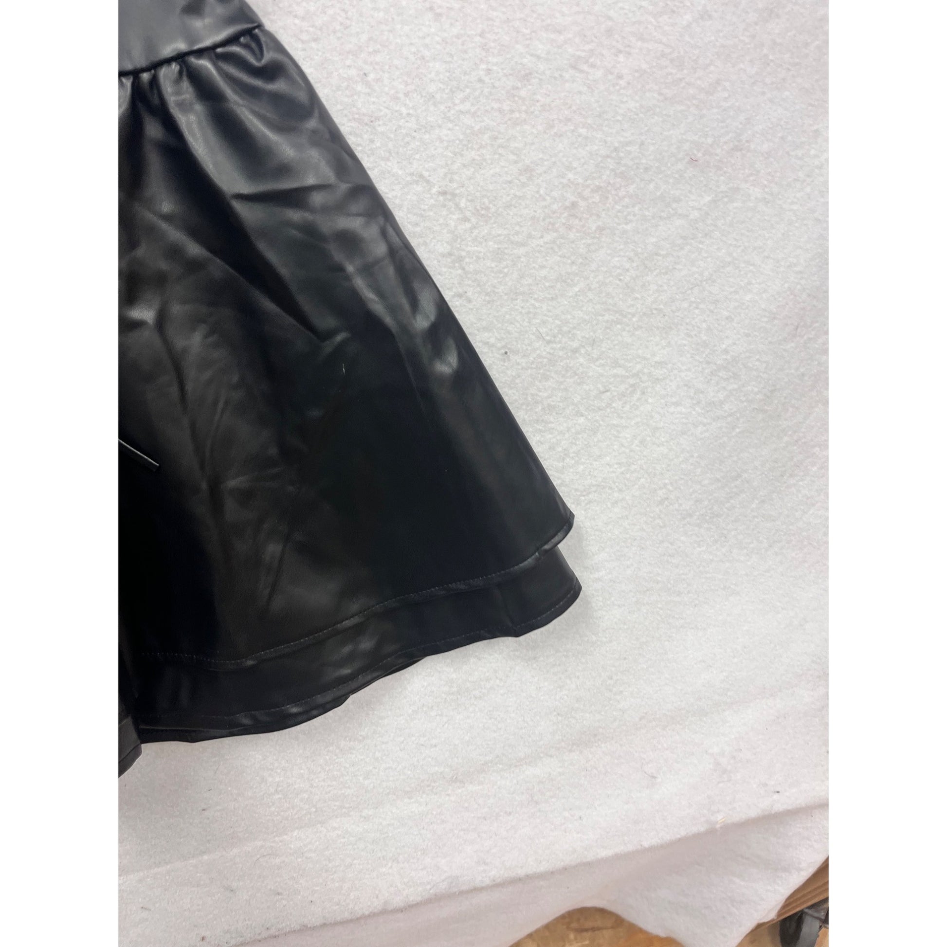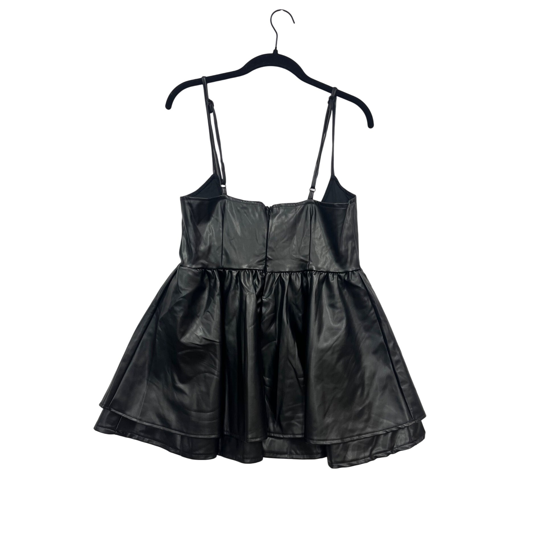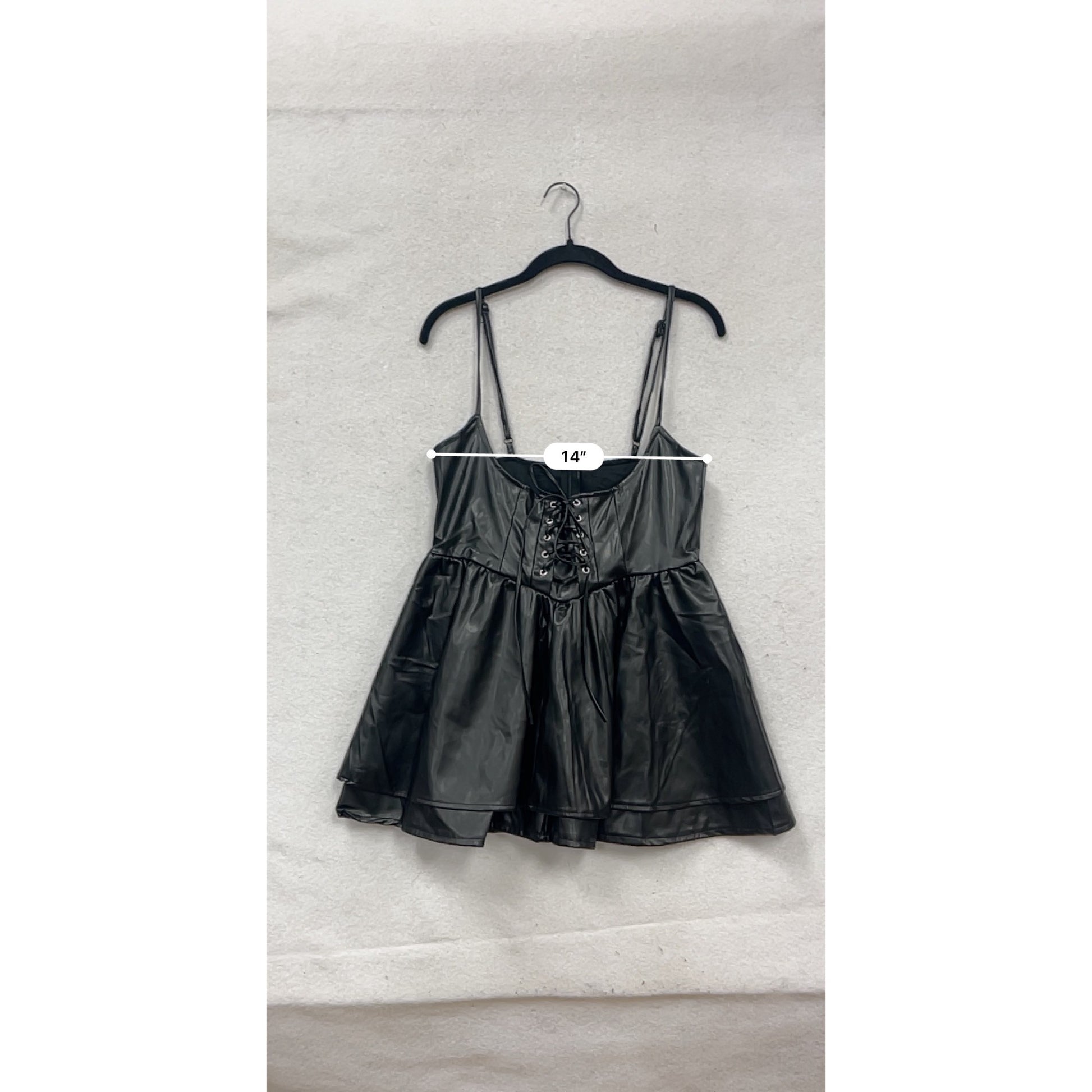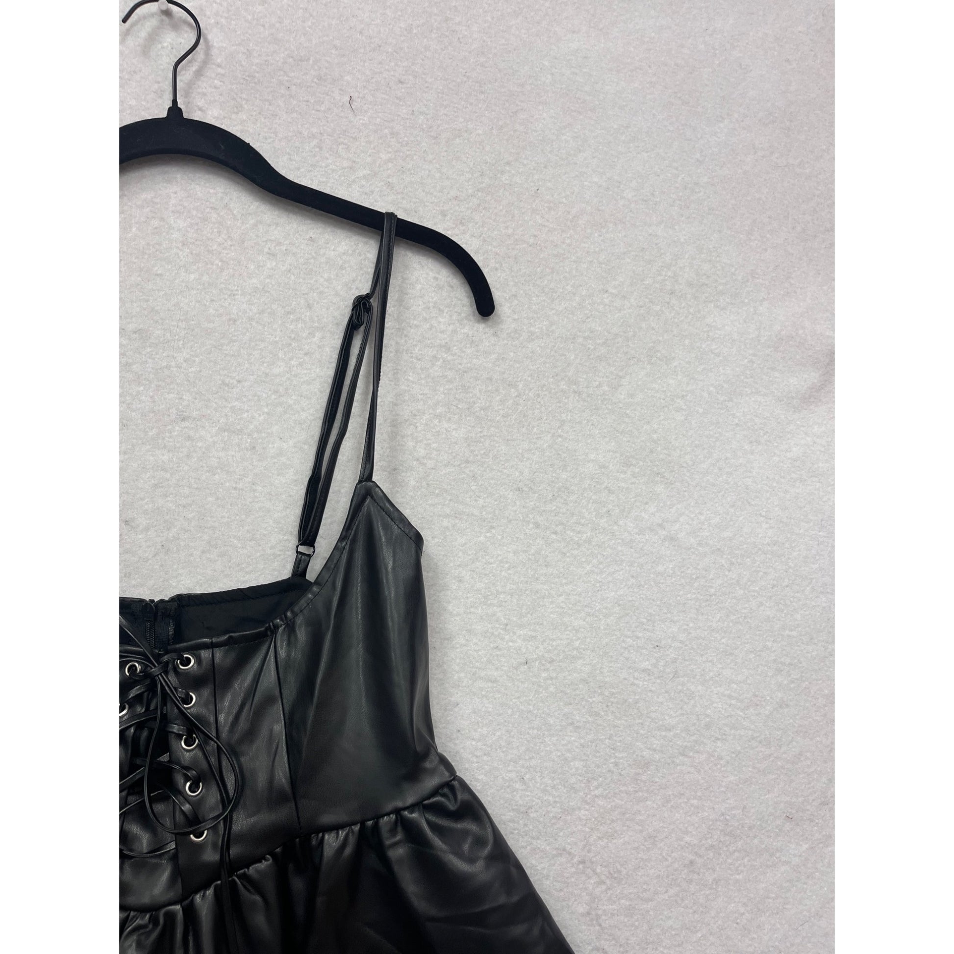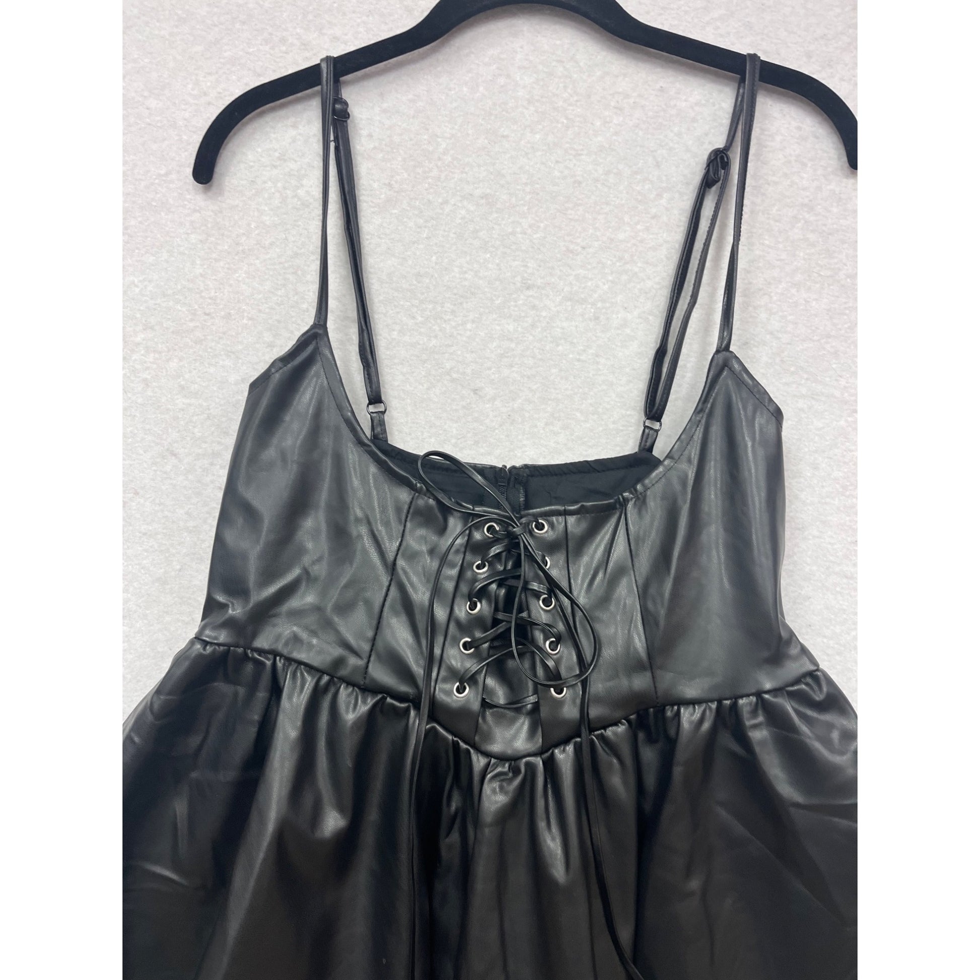 This stylish faux leather mini dress features adjustable straps, a feminine lace-up detail, and a flared hemline. Designed for a bold, modern look.