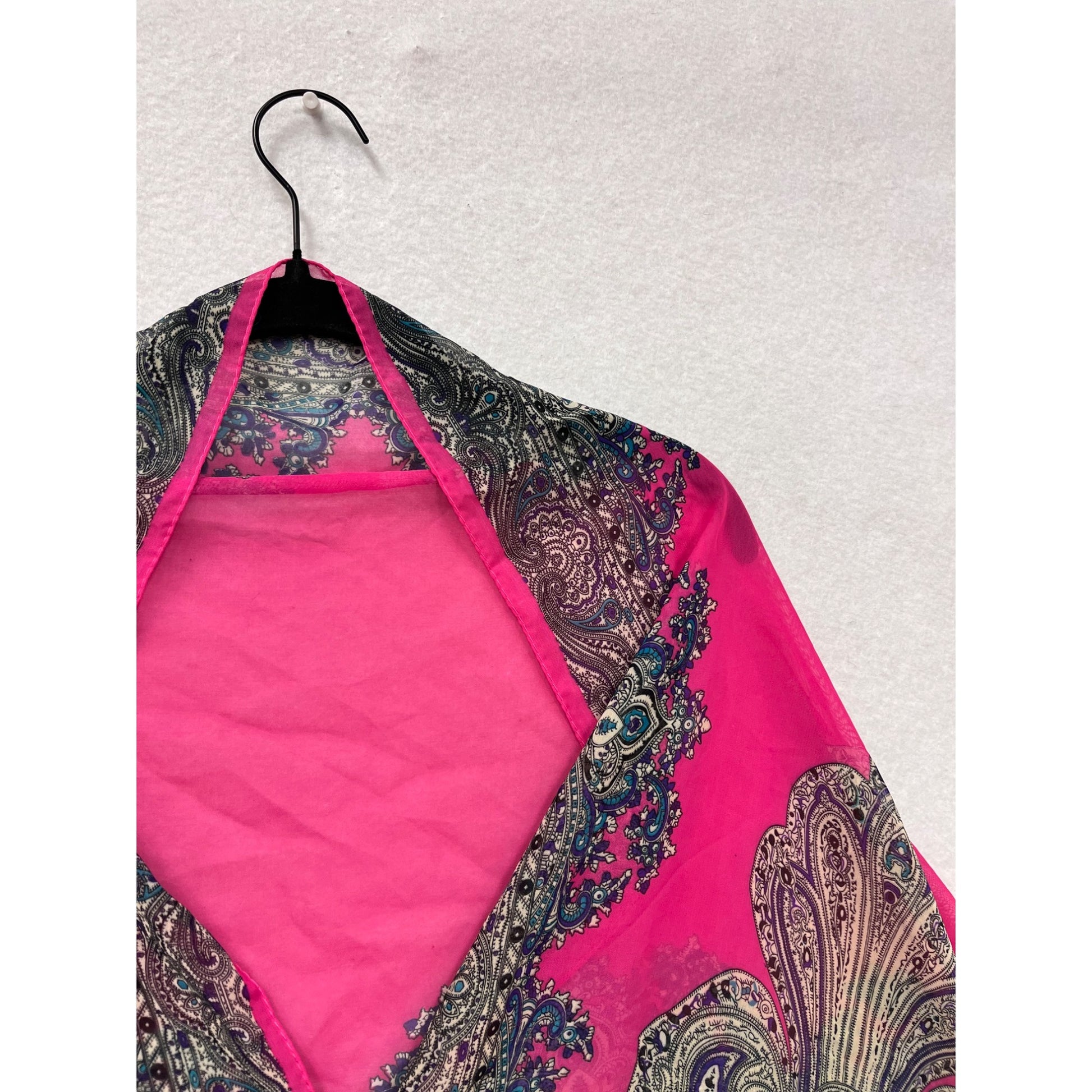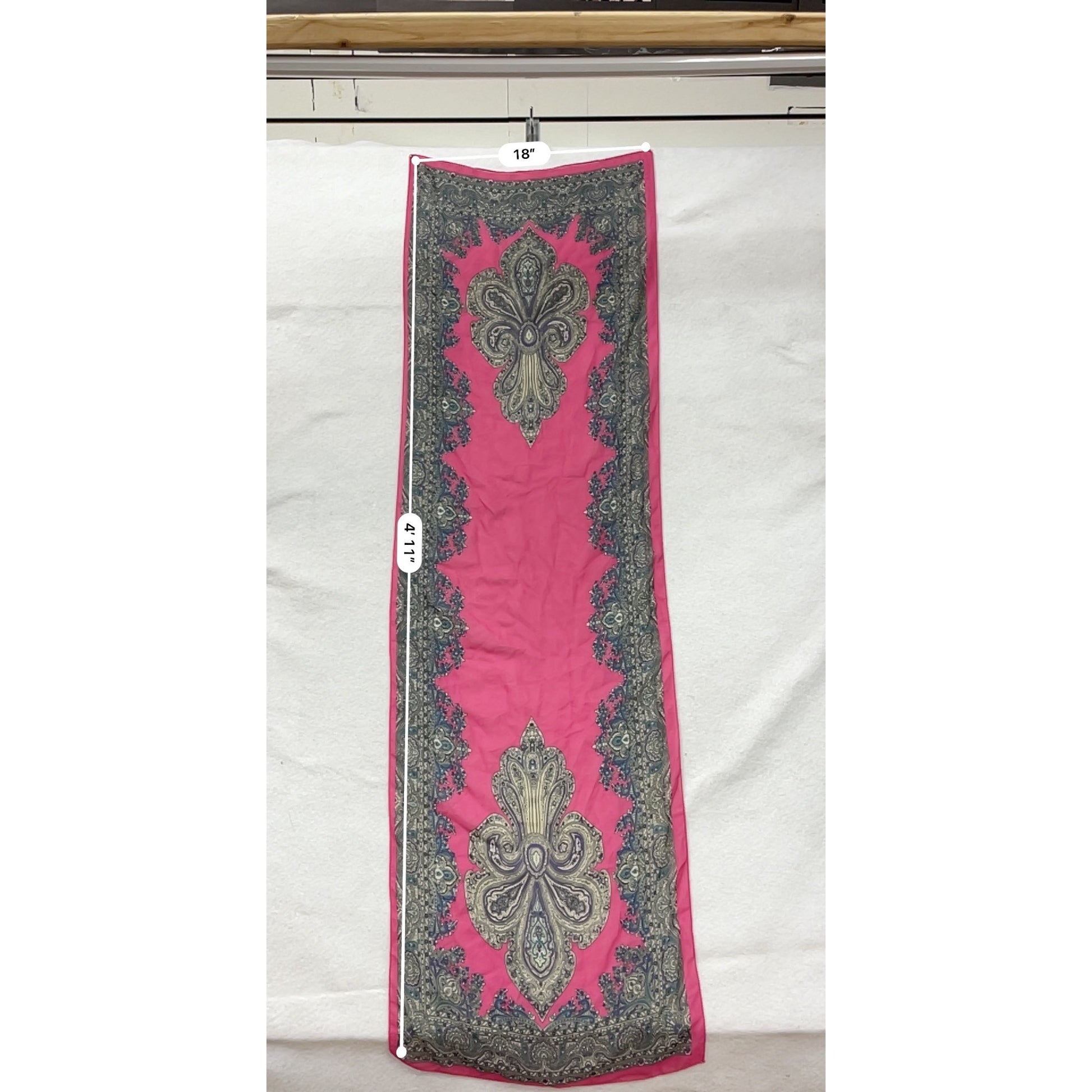 A versatile accessory designed to elevate outfits, featuring a vibrant pink and gold paisley print. Its silky texture offers both comfort and sophistication.