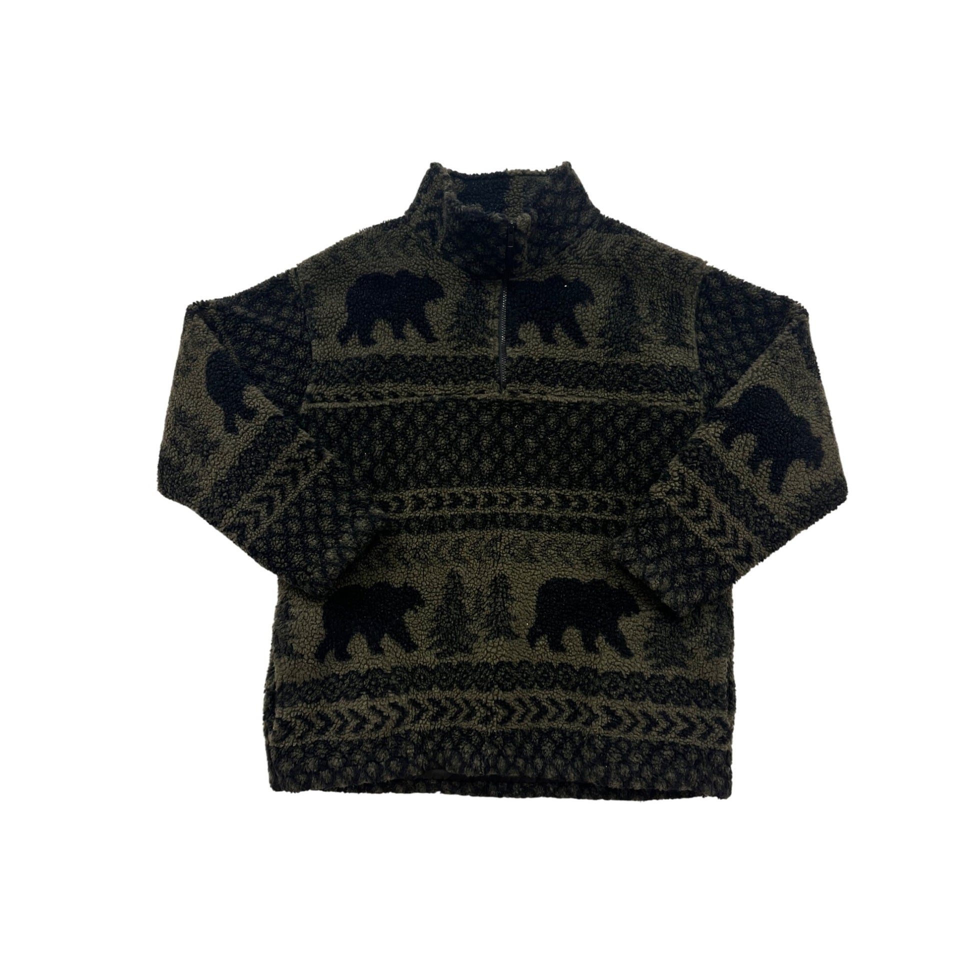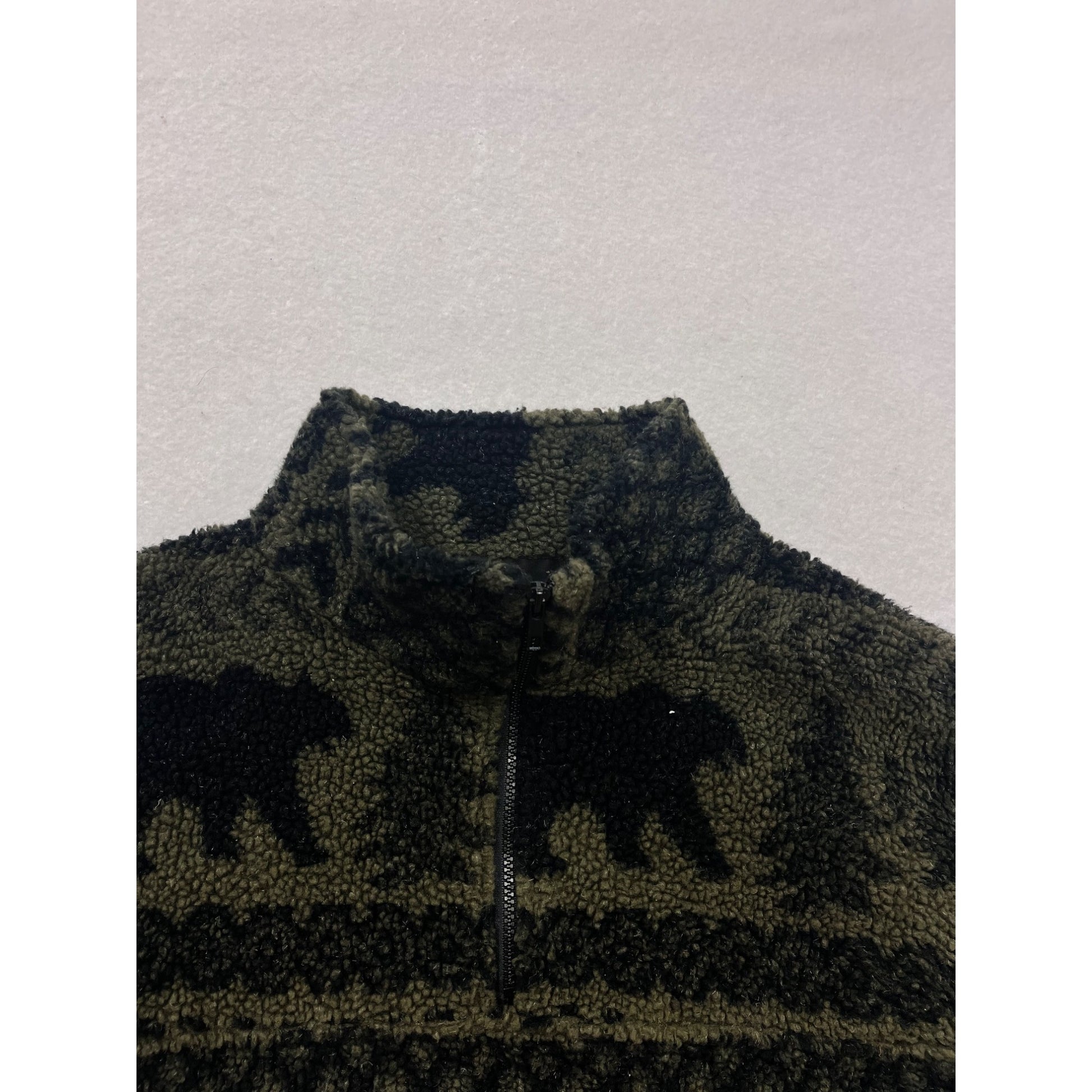 This women's XL sherpa pullover features a quarter-zip design with a forest-inspired pattern of bears and trees. Designed for warmth and comfort during colder seasons, its olive and black tones add a rustic aesthetic suitable for casual outings or outdoor activities.