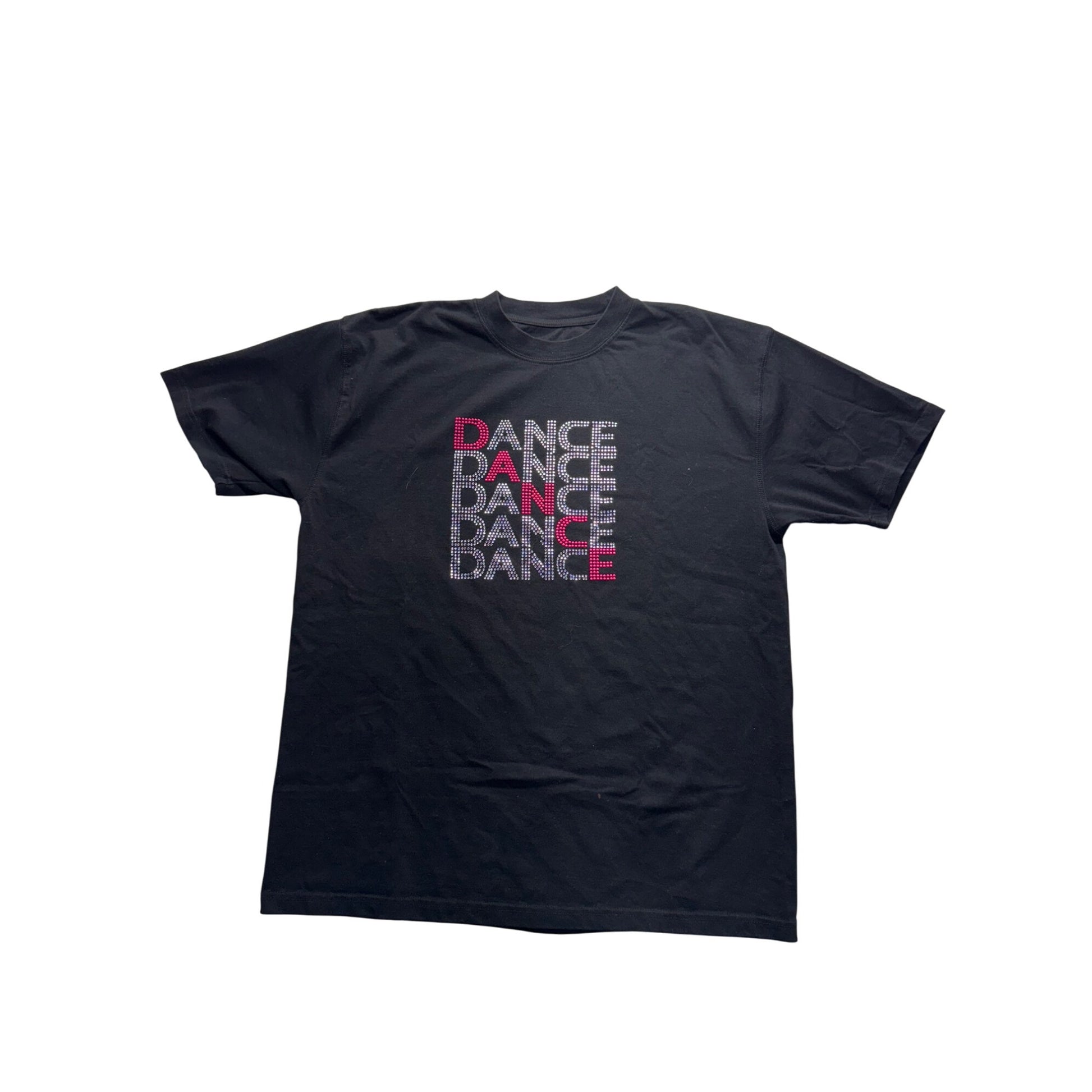 This black Zorrel T-shirt features a striking rhinestone "Dance" graphic design, offering a blend of comfort and style. Crafted from a durable cotton blend, it is ideal for dance enthusiasts or casual wear.